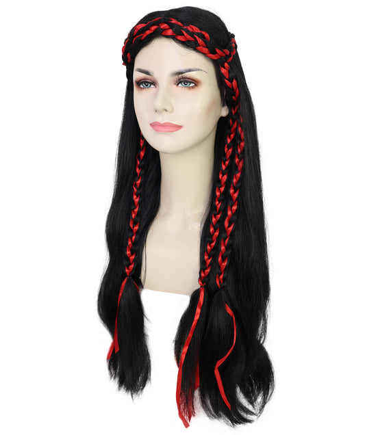 Women’s Long Black Wavy Wig with Red Braided Ac...