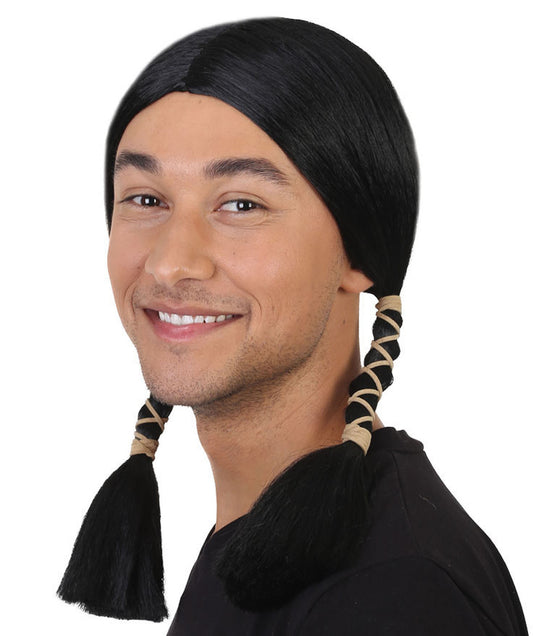 Answer: Men's Native American Wig: Long, dark hair with traditional braids and feathers for historical accuracy. The premium capless cap ensures comfort for Halloween, theater, and reenactments.