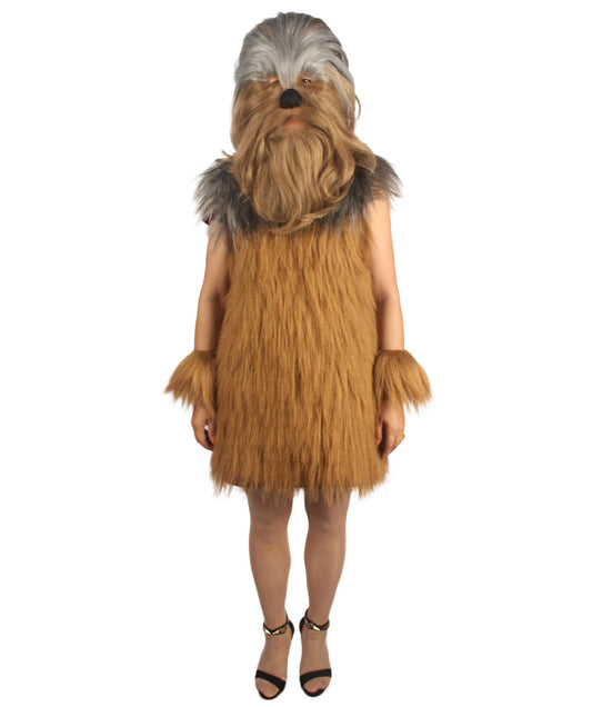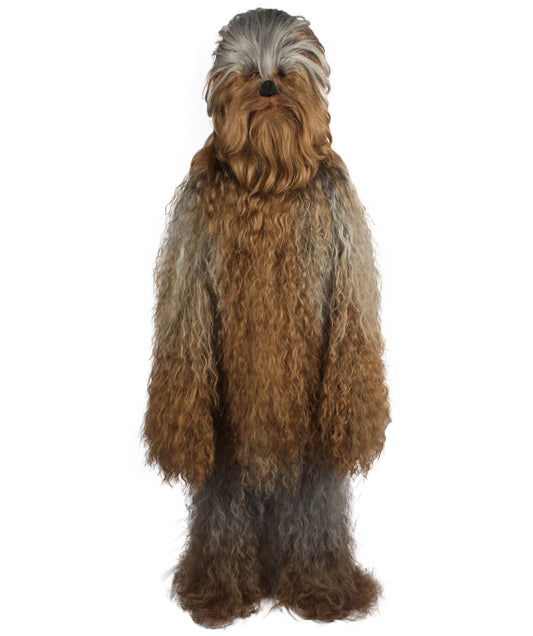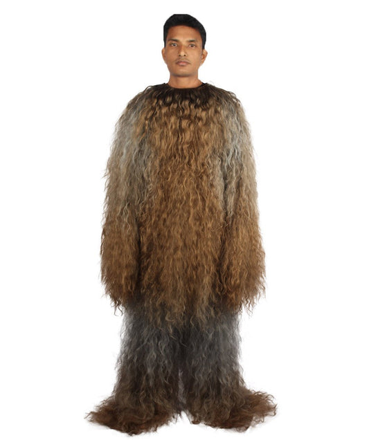 Answer: This costume combines warrior ape characteristics with military leader details, including long, hairy accents. It's a standout choice for themed events, offering a fierce and commanding appearance.