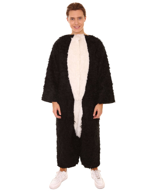 Answer: The Men's Deluxe Skunk Animal Costume features a black design reminiscent of a skunk's distinctive markings. It's ideal for those looking to stand out with a playful and recognizable animal-themed costume.