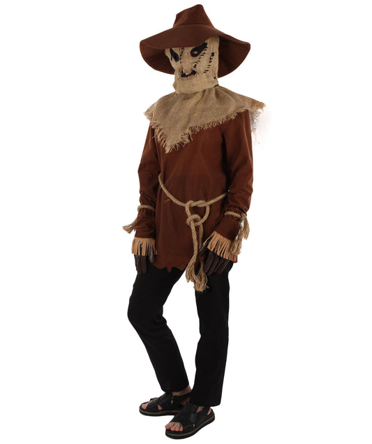 Answer This costume combines classic scarecrow elements with a realistic mask and accessories, crafted from synthetic fabric. It's perfect for Halloween, offering a spooky and complete scarecrow transformation.