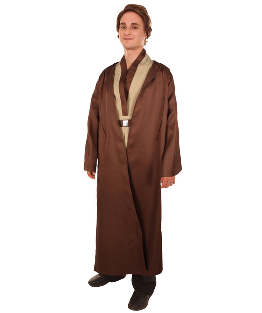 The Men's Brown Long Tunic Costume is perfect for anyone who enjoys dressing in historical or fantasy themes. It has an air of mystery and elegance. Made of synthetic cloth that resists flames, this costume is ideal for cosplay or Halloween occasions where a hint of medieval elegance is sought.