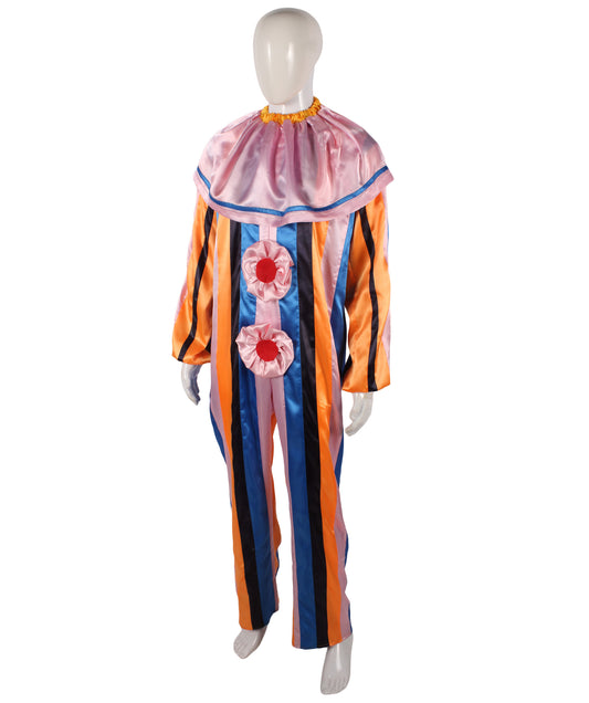 Answer: The Men's Multicolor Clown Circus Costume is perfect for Halloween with its vibrant colors and flame-retardant synthetic fabric, capturing the festive spirit of the circus and spreading joy at themed events.