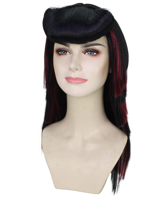 Answer: The Women's Multicolor Mardi Gras Festival Bob Wig with Bangs, made from flame-retardant synthetic fiber, features vibrant colors and playful bangs, adding a festive touch to carnival costumes and ensuring wearers stand out during celebrations.