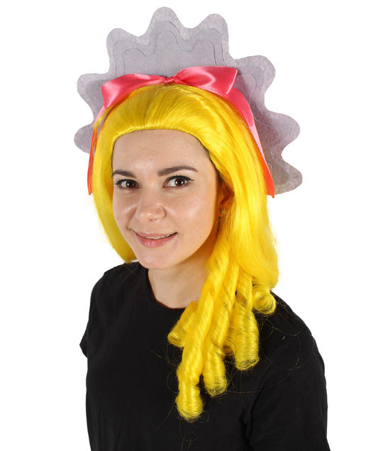 Answer: The Women's TV Musical Movie Princess Troll Yellow Wavy Wig is made from flame-retardant synthetic fiber and features a bright yellow color with wavy styling, perfect for adding a playful and whimsical touch to any costume.