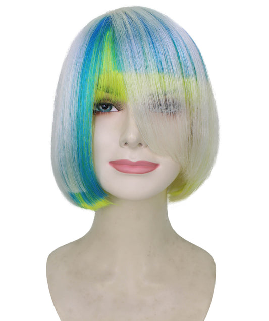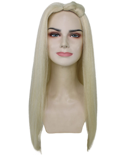 Answer: The Women's TV Musical Movie Princess Troll Yellow Wavy Wig is made from flame-retardant synthetic fiber and features a bright yellow color with wavy styling, perfect for adding a playful and whimsical touch to any costume.