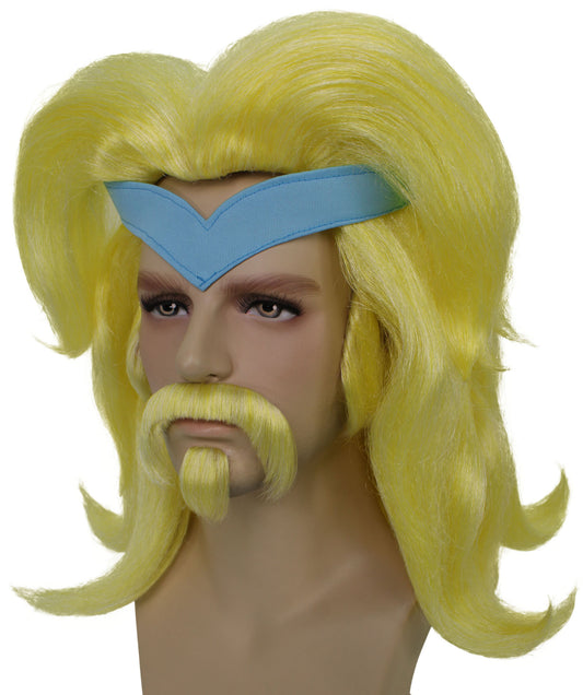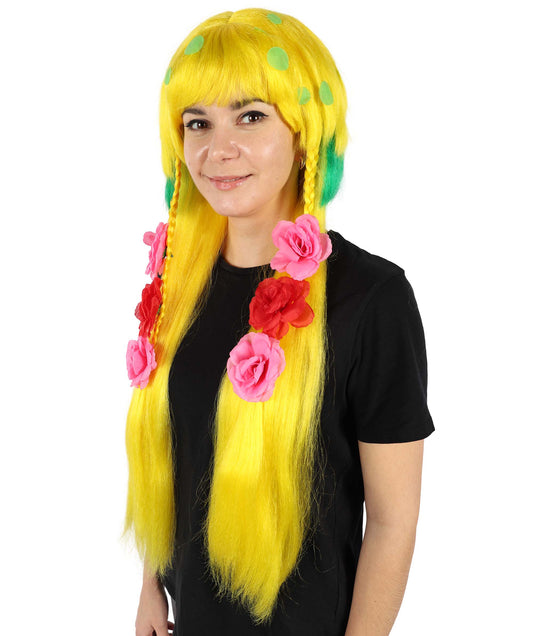 Answer: The Women's TV Musical Movie Princess Troll Yellow Wavy Wig is made from flame-retardant synthetic fiber and features a bright yellow color with wavy styling, perfect for adding a playful and whimsical touch to any costume.