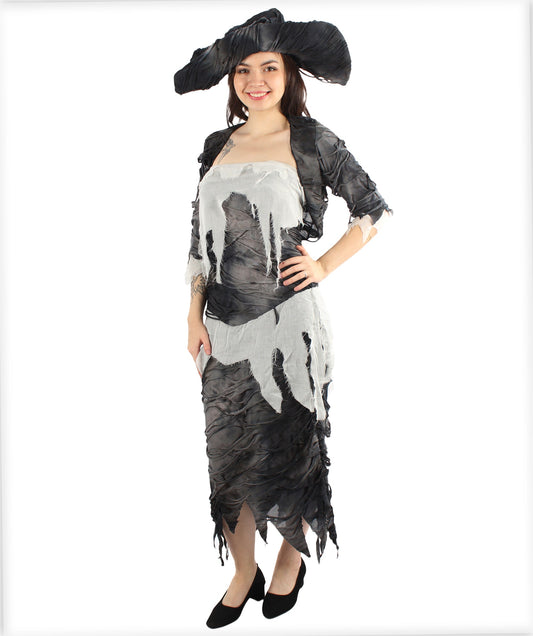 Answer: This costume includes a ruffled shirt, vest, and pants in white and black, perfectly embodying the adventurous and daring essence of a pirate. It's great for adding excitement and a swashbuckling flair to your Halloween.