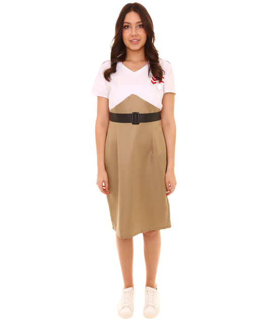 Answer: The Women's French Maid Costume features a classic black dress with white accents, offering a chic and playful look. Its timeless design makes it a sophisticated option for Halloween and themed events.