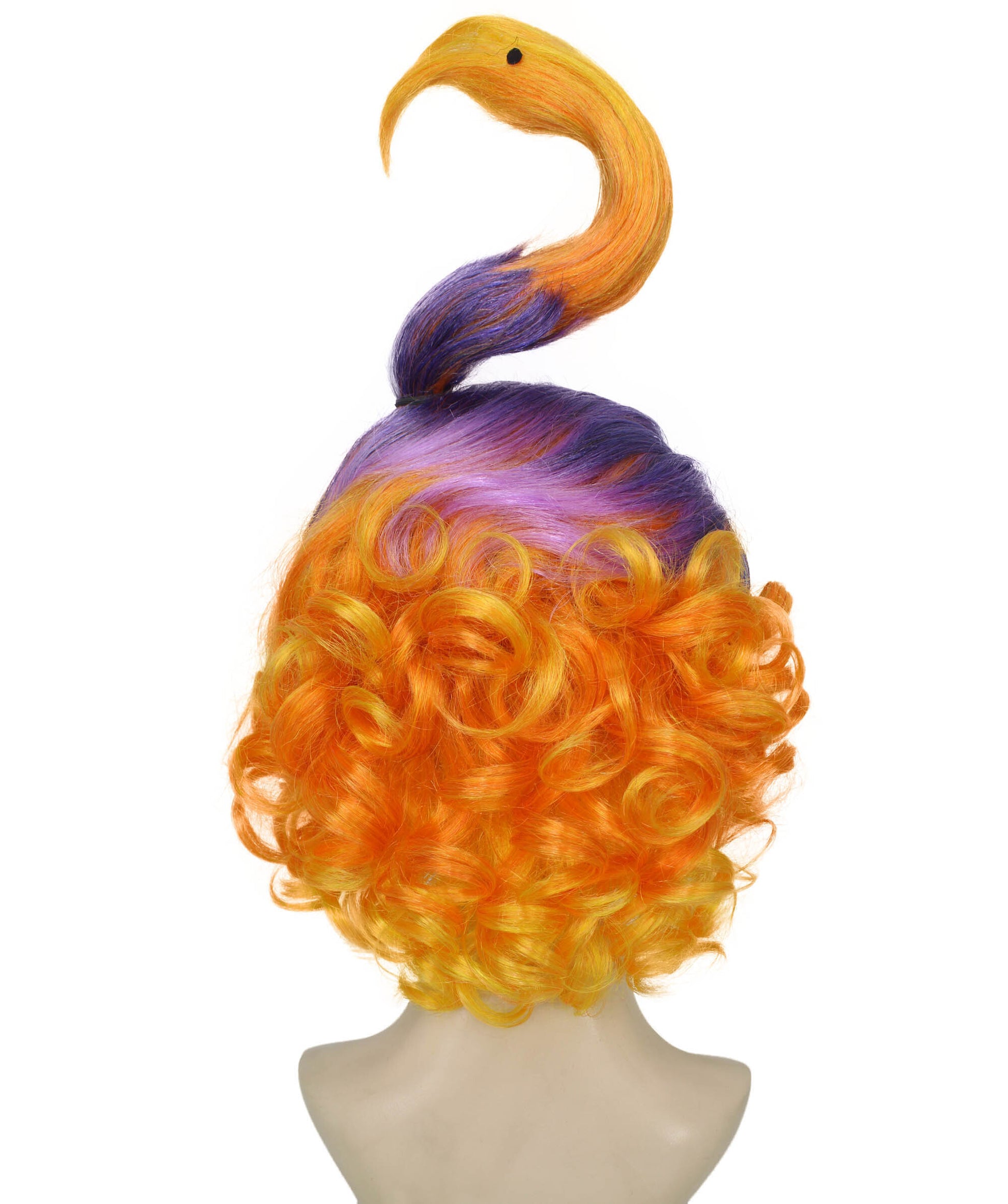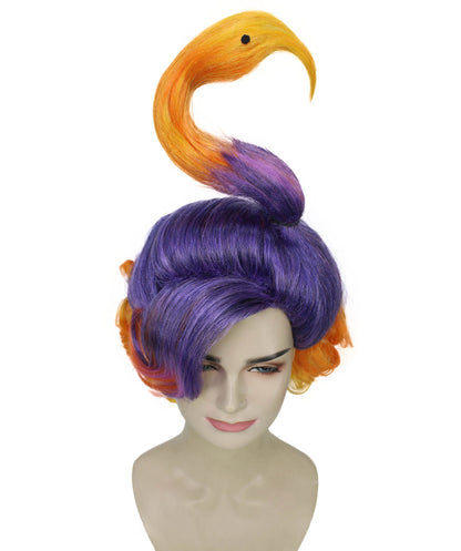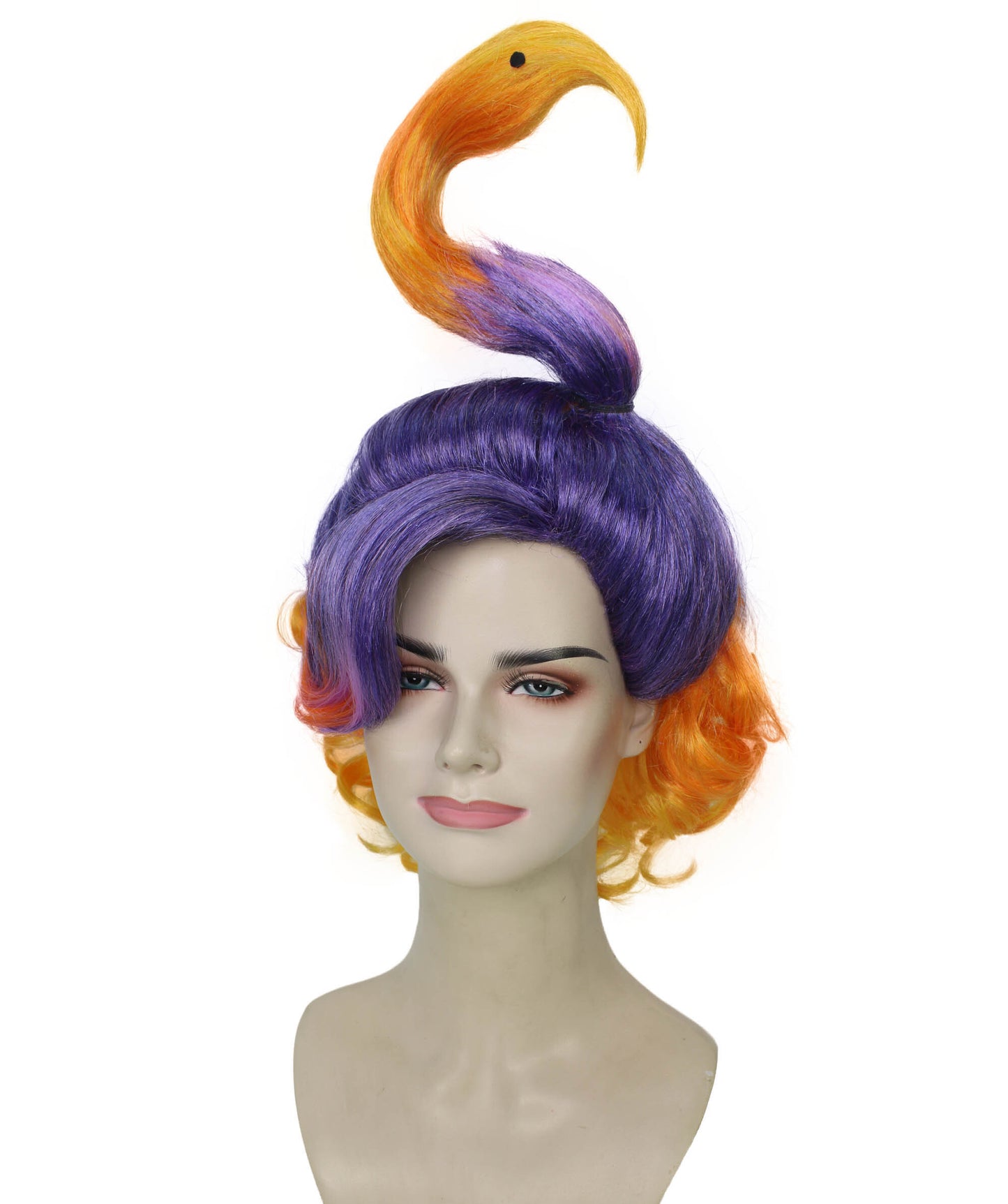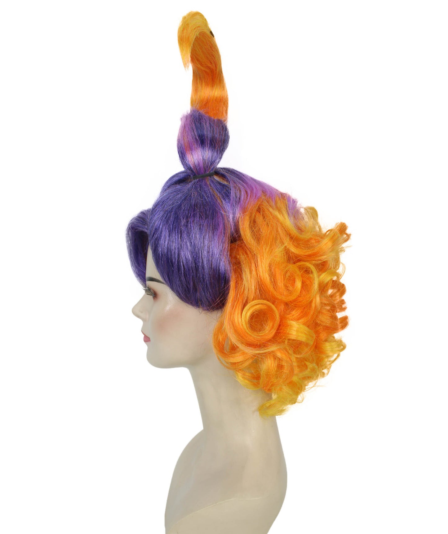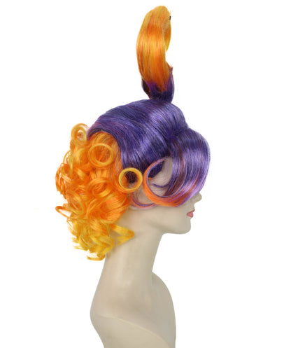 The wig itself is a burst of vibrant colors, giving you an eye-catching and dramatic look that's sure to turn heads. The unique design features purple with stunning vibrant orange at the ends of the hair, adding a touch of sass and flair to your transformation.