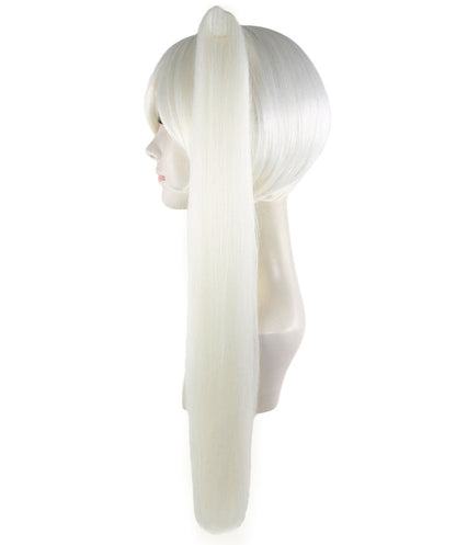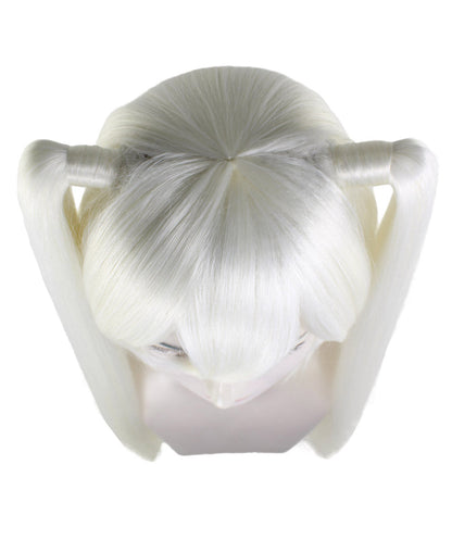 Made of synthetic fiber, this flame-retardant white wig with double ponytail style is perfect for both adults and kids alike. Made with an adjustable lining that can be stretched up to 22 inches in diameter to fit adults and kids above 5.