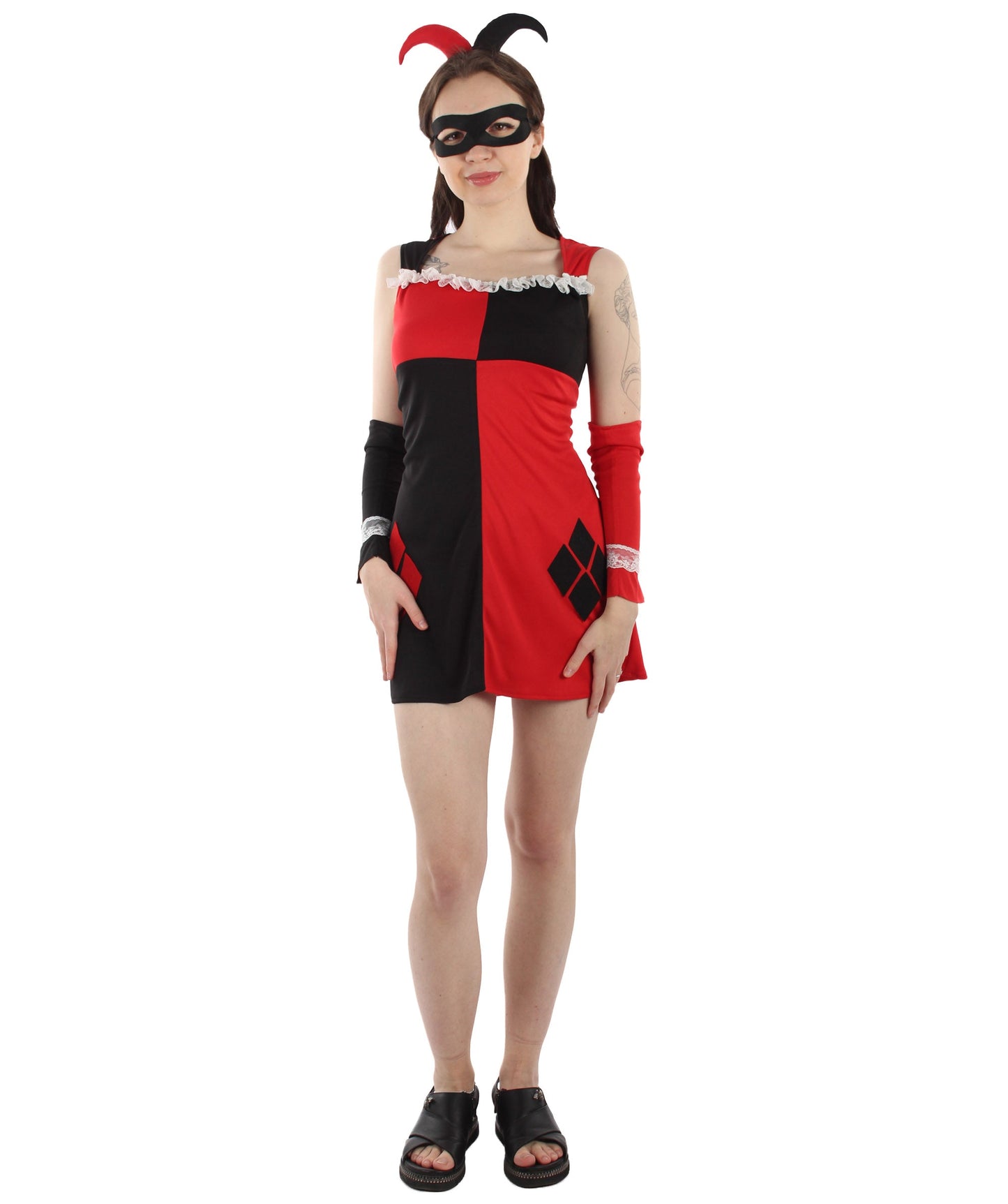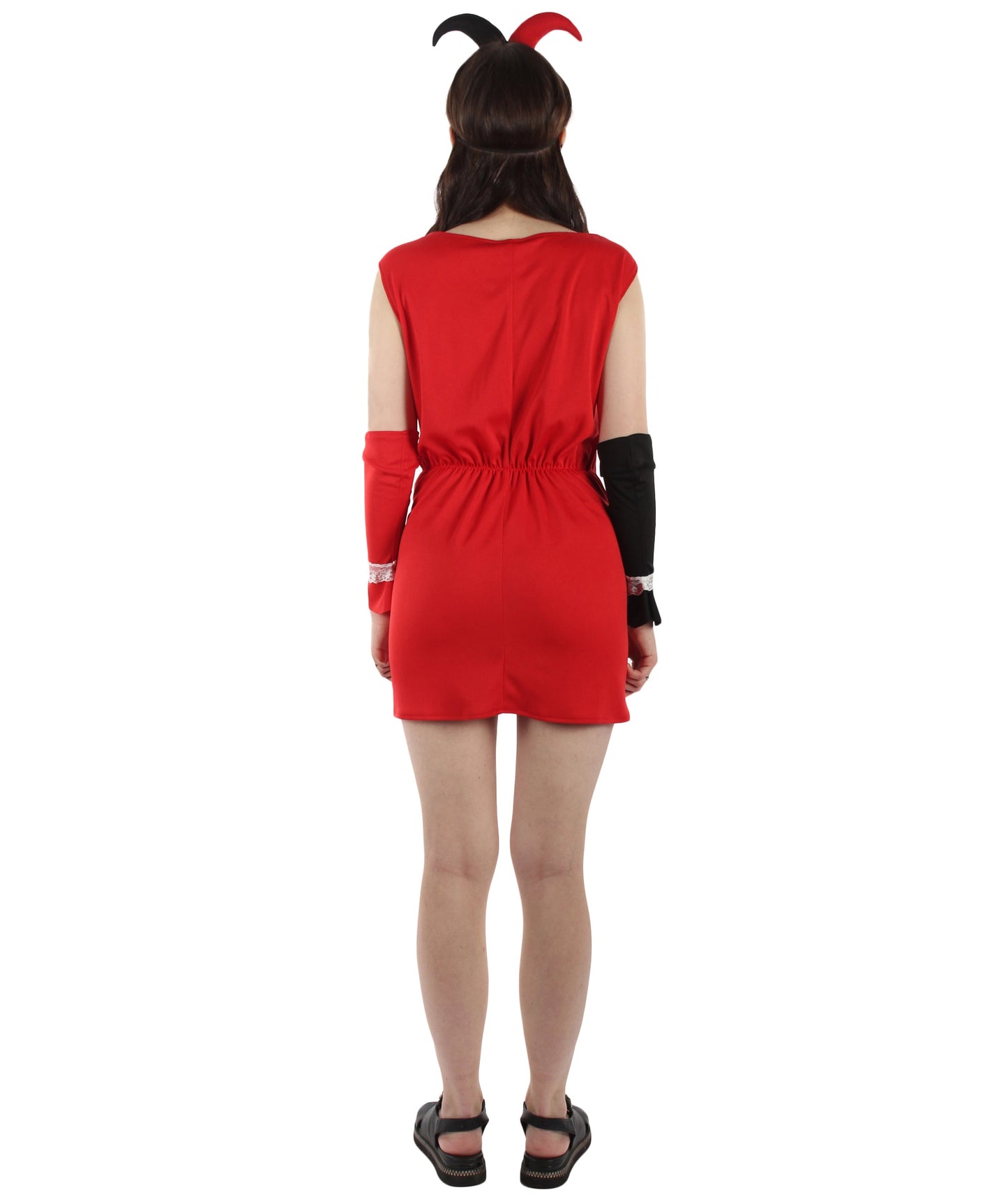 This Black and Red Poker Costume features intricate details, including spade accents, adding a touch of elegance and authenticity to your look. To complete the ensemble, the costume includes a coordinating headband and eye mask. The headband features a stylish design with spade motifs, perfectly complementing the dress and adding a regal touch to your overall appearance. Meanwhile, the intricately designed mask adds an element of intrigue and captivates attention, allowing you to embody the essence of a captivating card player. Moreover, you will get a pair of gloves with this costume that are crafted to complete the overall look.