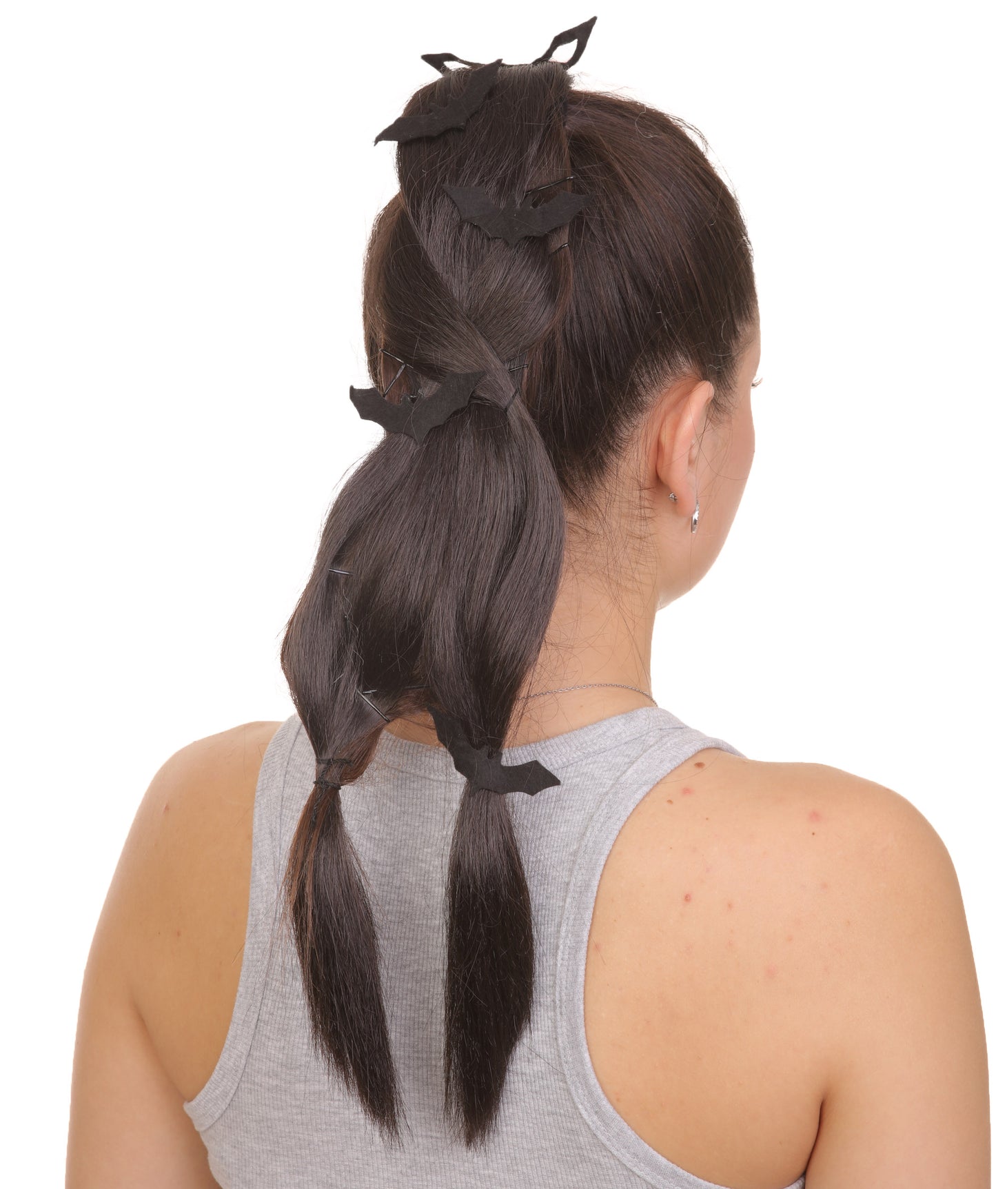 HPO Women's Long Length Bat Ponytail Hair Clips - Straight Jet Black Hair - With Scary Black Bats