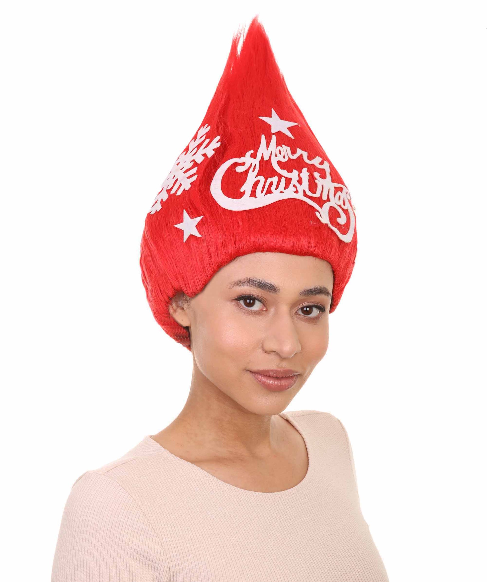 Get into the festive spirit with the Christmas Tree Unisex Wig from HPO! This fun and unique wig is the perfect way to spice up your look and spread some holiday cheer. The bright red vibrant color is sure to attract attention, and with the words ""Merry Christmas"" written on it, you'll be sure to spread joy wherever you go.