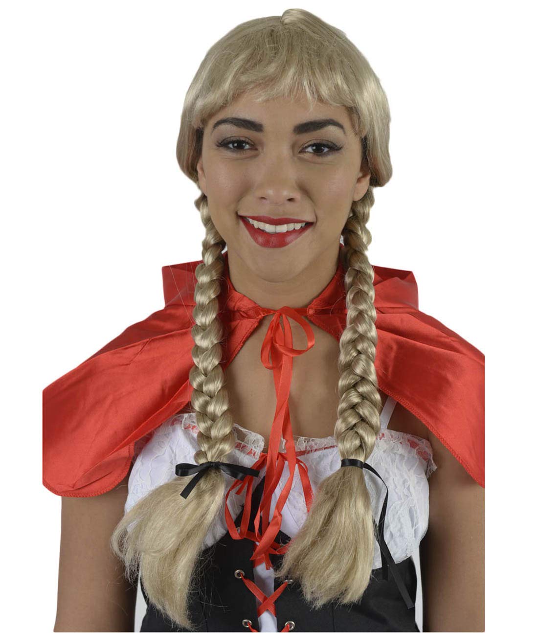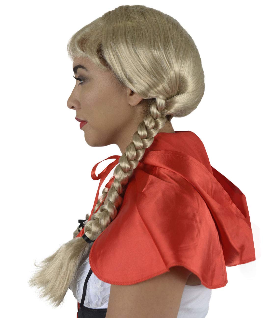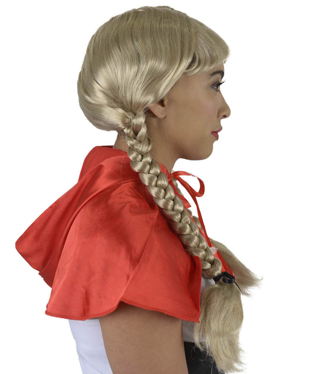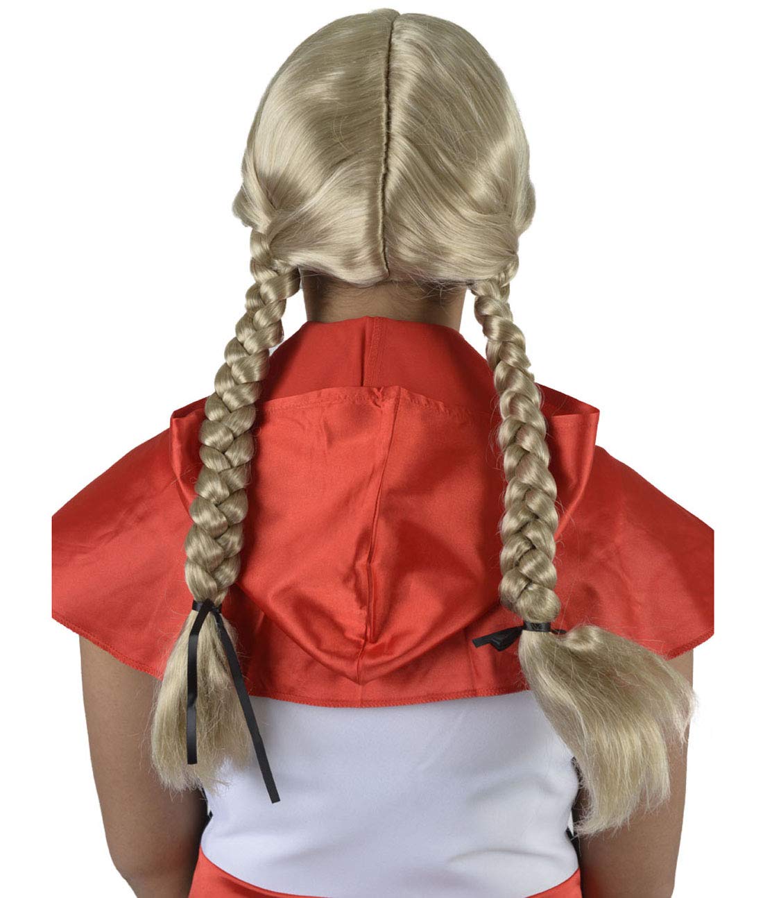 These silky blonde braids are perfect for blushing maidens and fashion forward types alike. Complete with bangs and red ribbons, this wig is ideal for performances, Comic Con events, or Halloween.