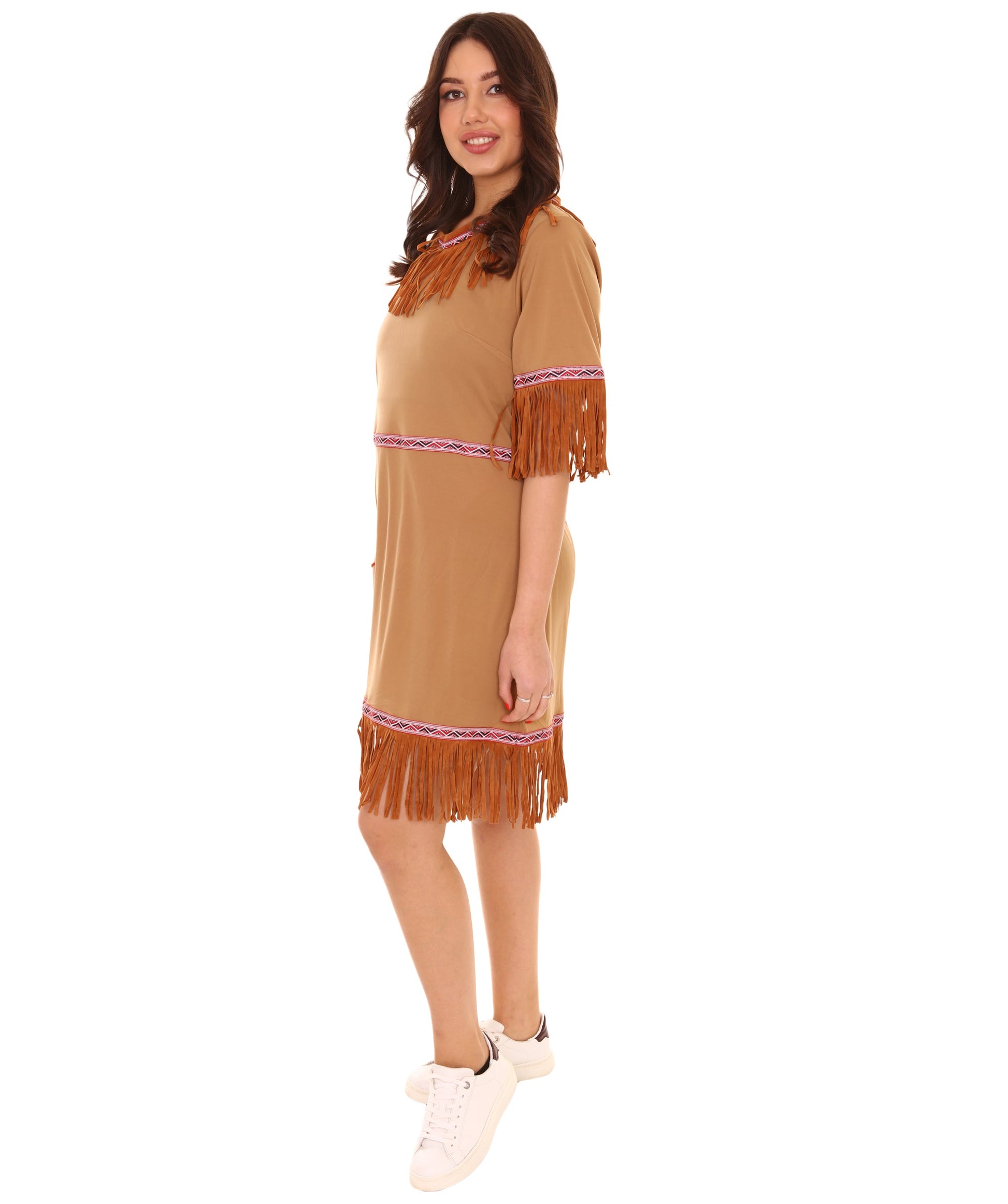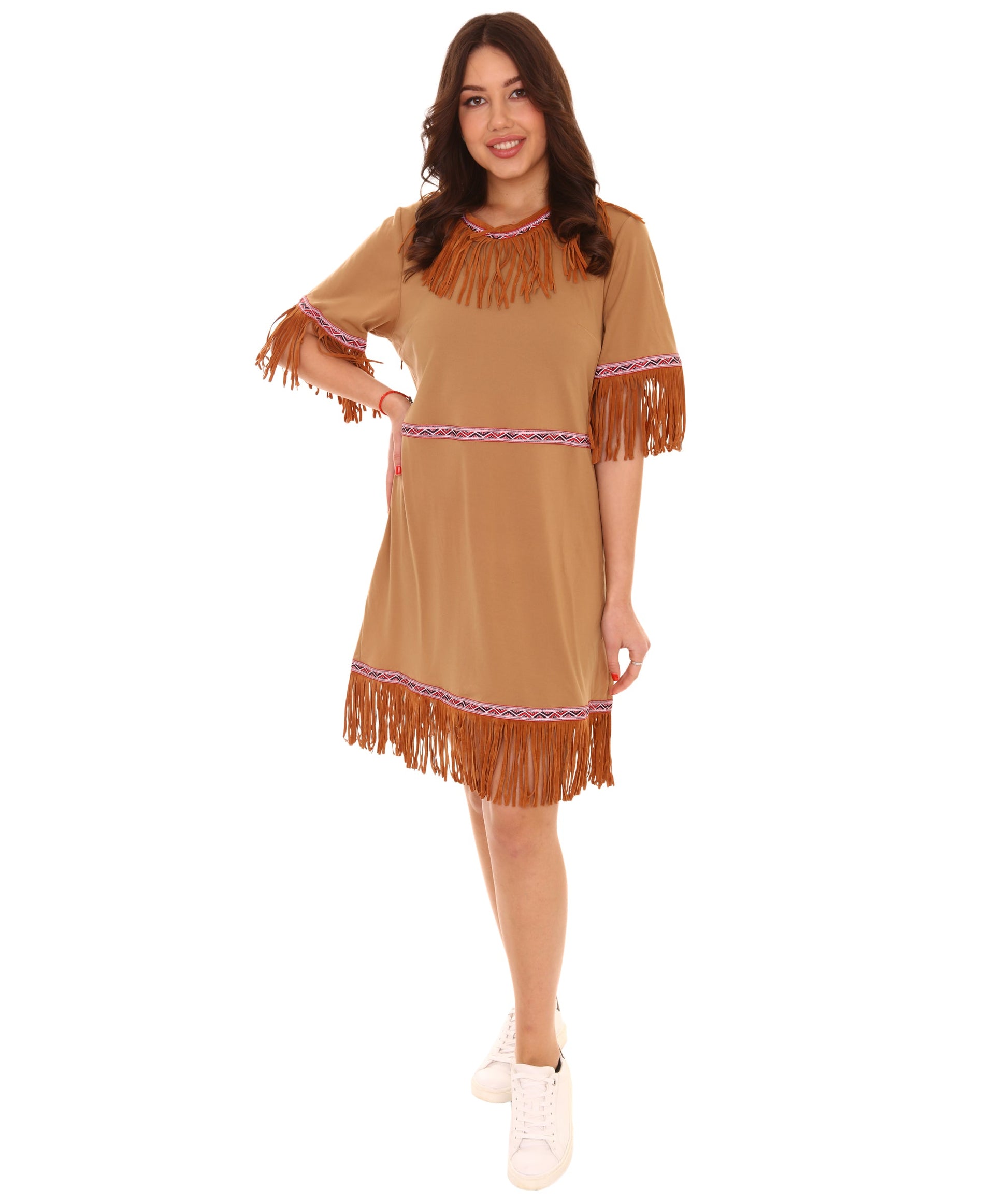 The dress is adorned with playful accents, such as fringe trim adding a touch of cowgirl charm. Complete the ensemble with cowboy boots, a cowgirl hat, and a bandana, all available as accessories. Let your hair down or tie it up in a ponytail, and you'll be ready to hit the dusty trails in true cowgirl fashion.