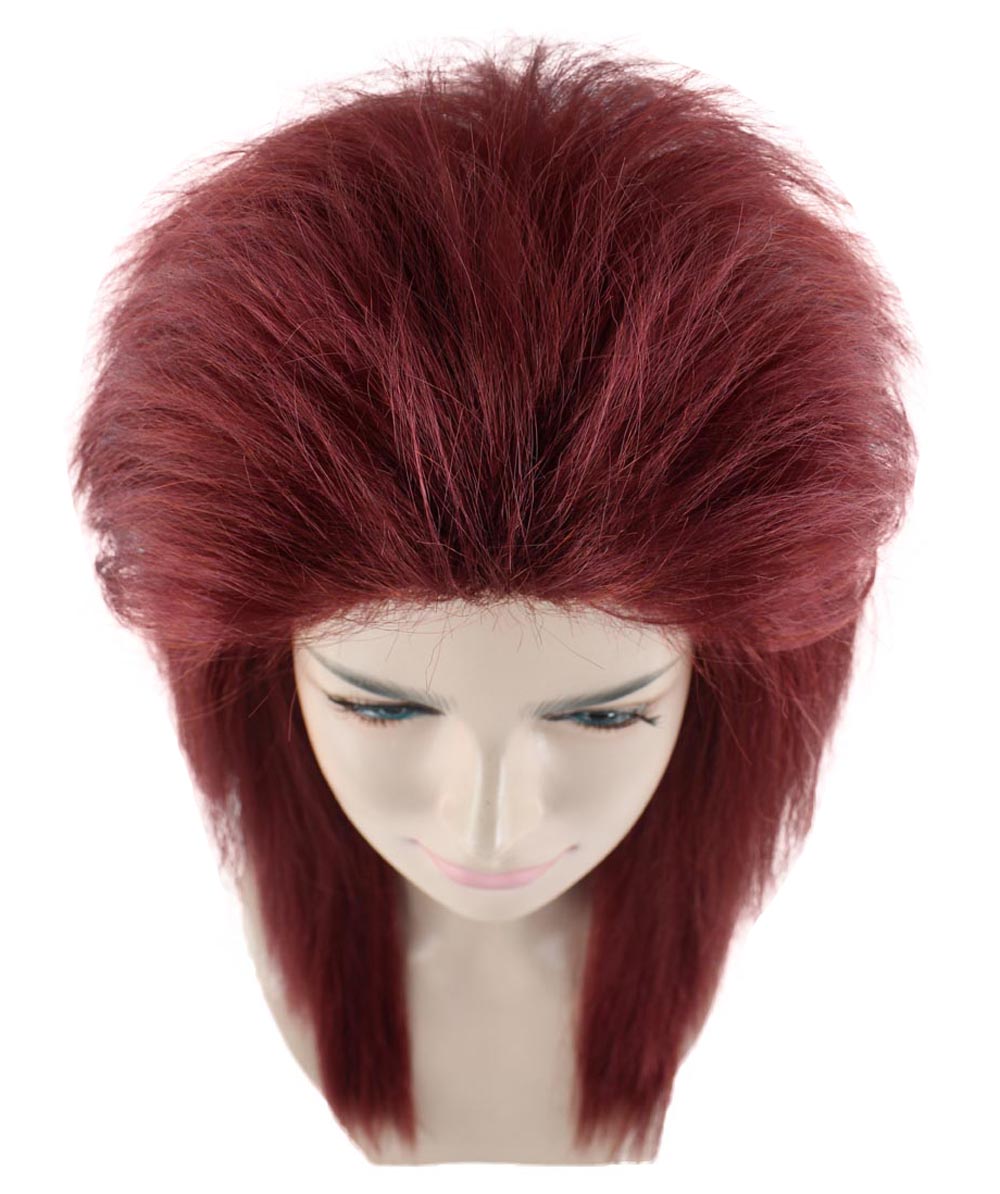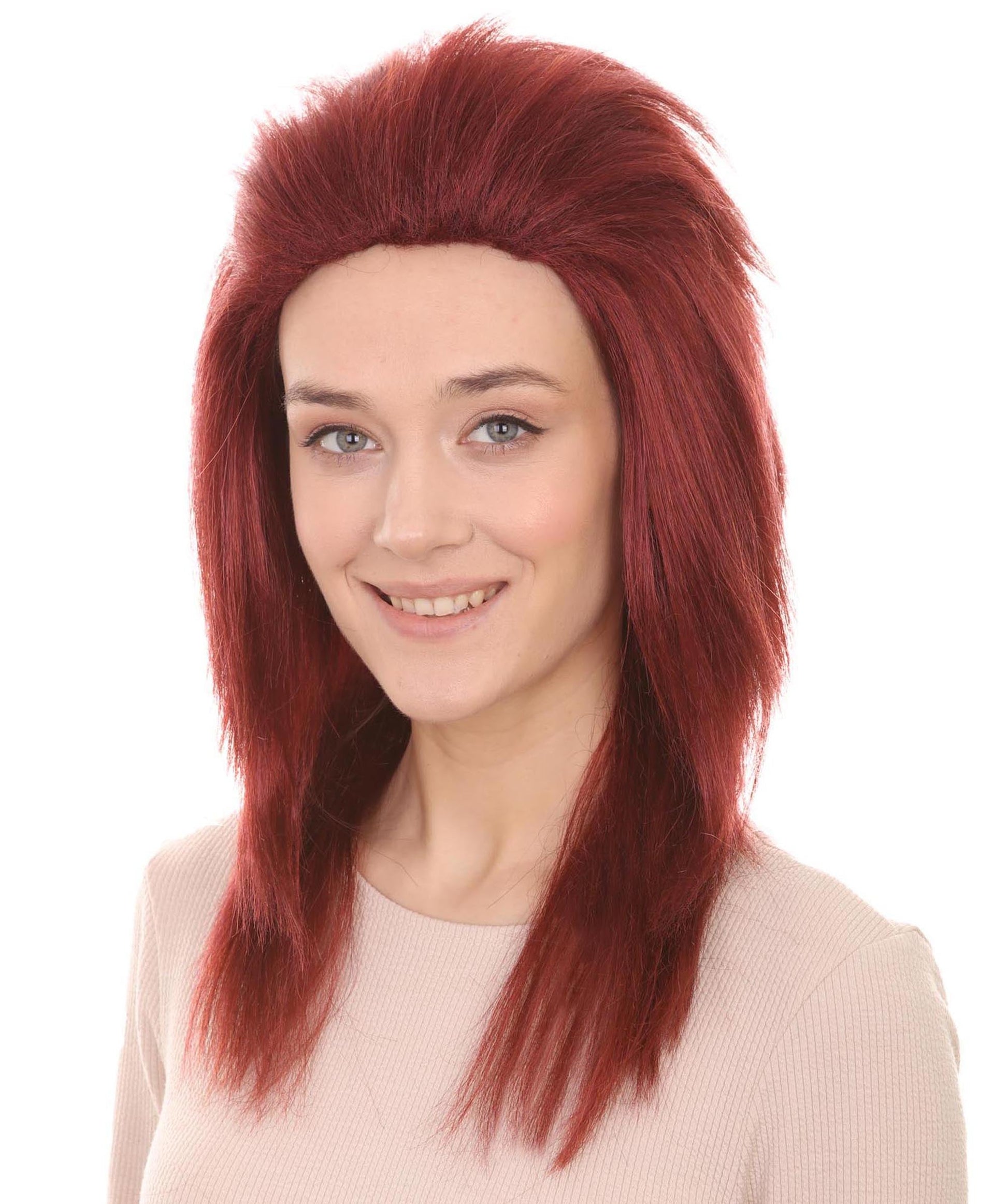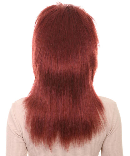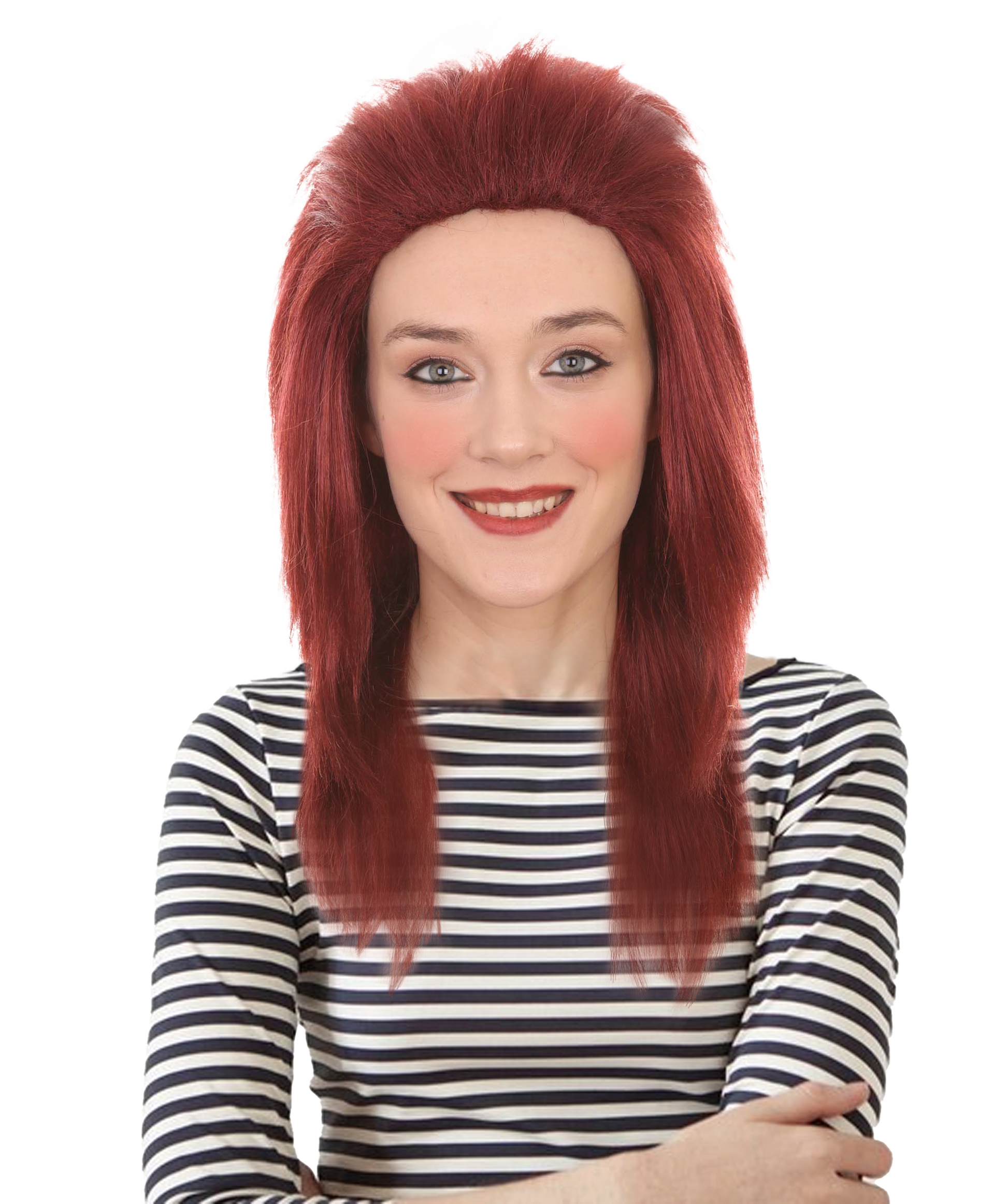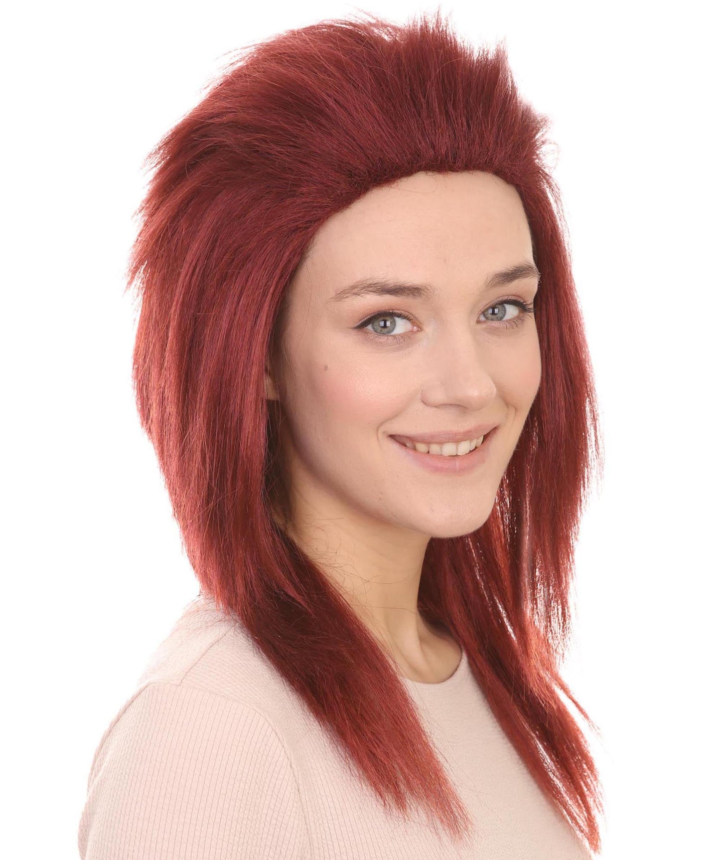 Bring back the 80s with this dark auburn rock diva Halloween wig! Whether you are attending an 80's themed party or simply wanting to rock out, this faux-mullet style wig will have you feeling totally 80s!