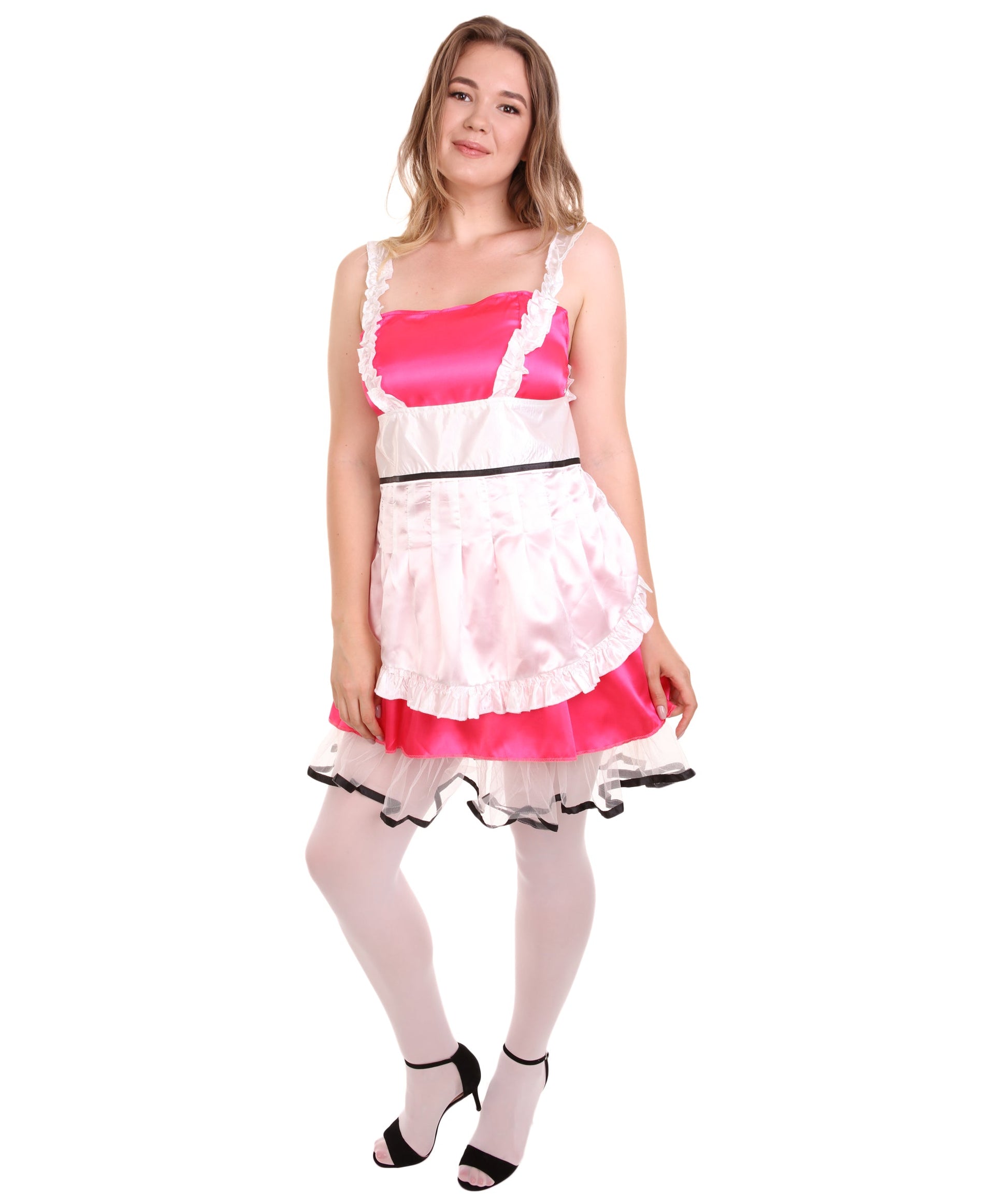 The dark pink color adds a bold and seductive element to the costume, making a remarkable statement. The shorter length of the dress adds sexiness by showcasing your legs and enhancing your overall look. The matching apron completes the look, adding an authentic touch and enhancing the French maid's character.