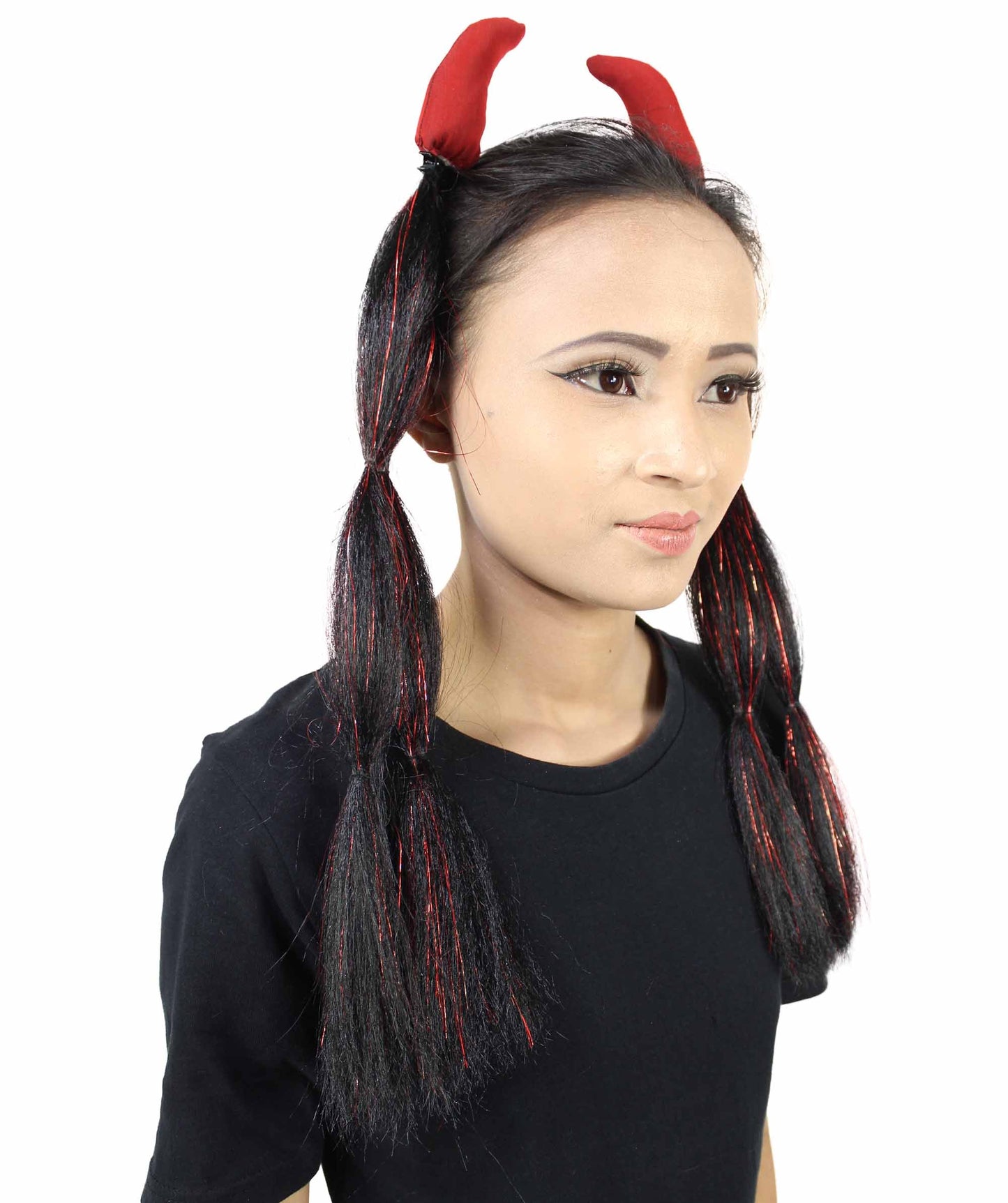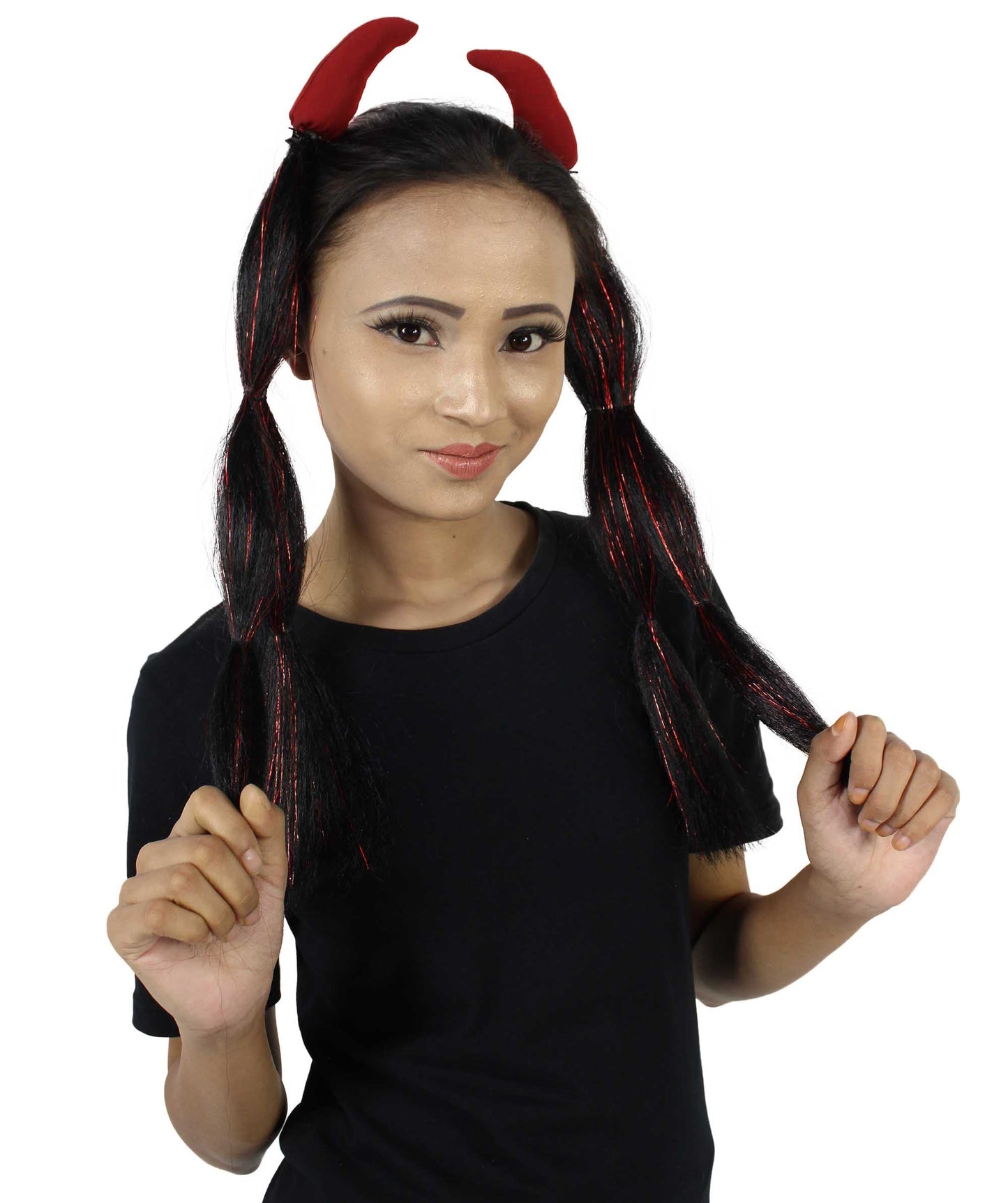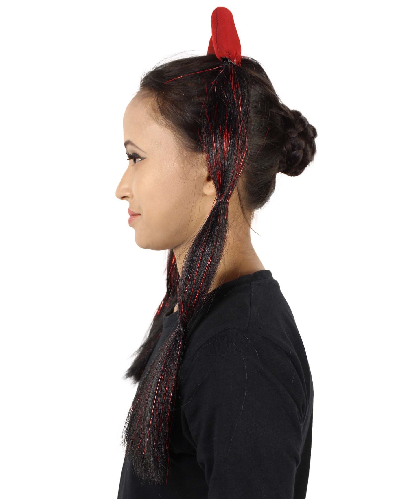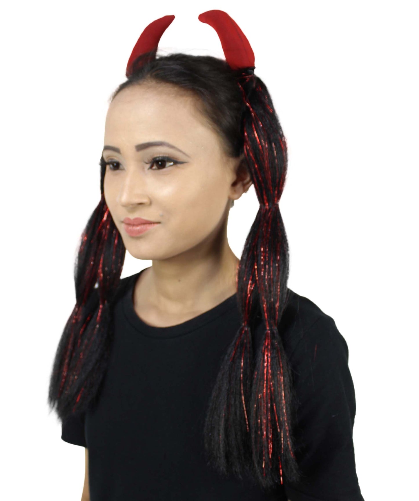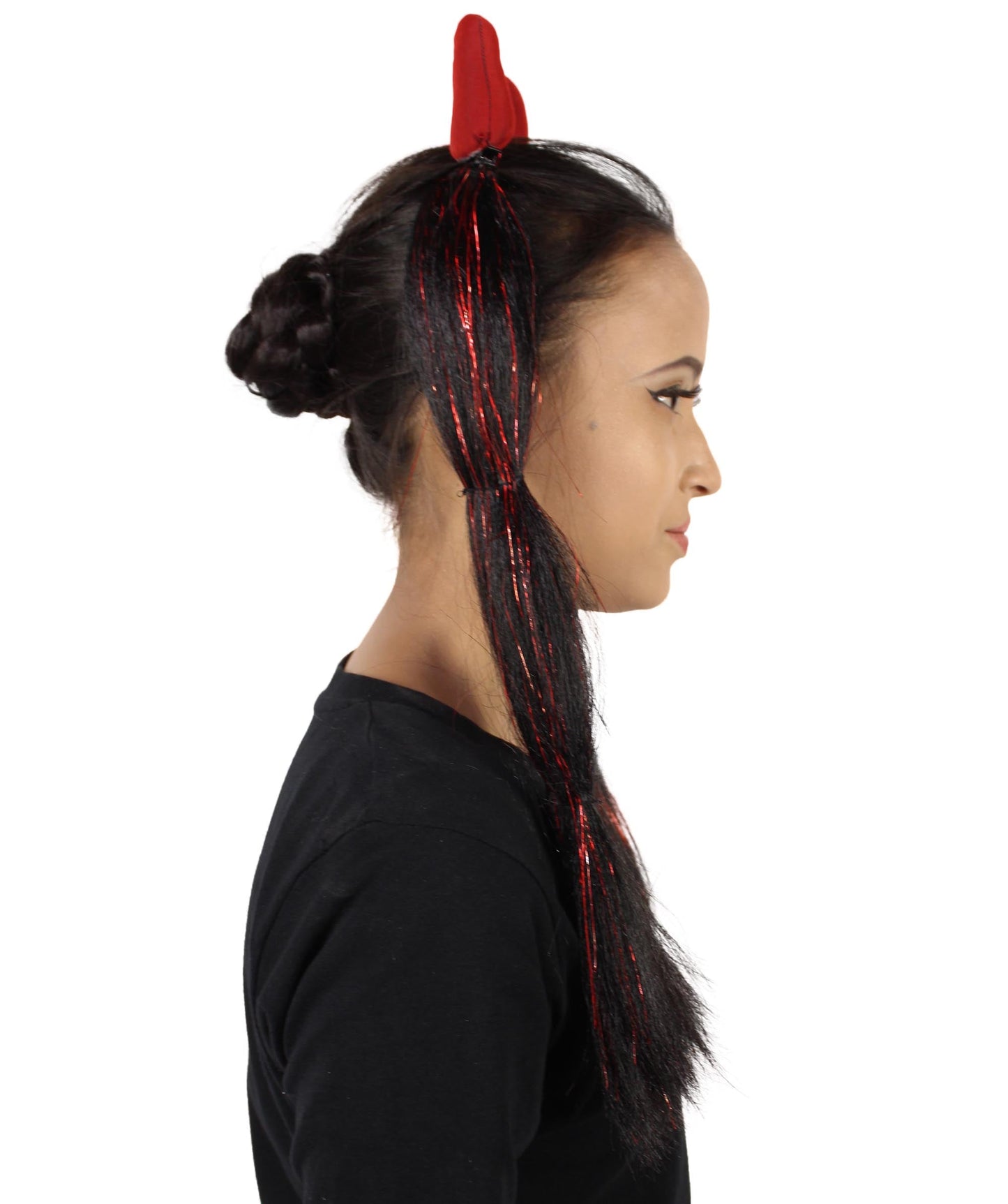 Devil Horn Hair Clips | Women's Long Length Festive Devil Horn Hair Clips - Long Straight Black Hair - With Red Tinsel Strands