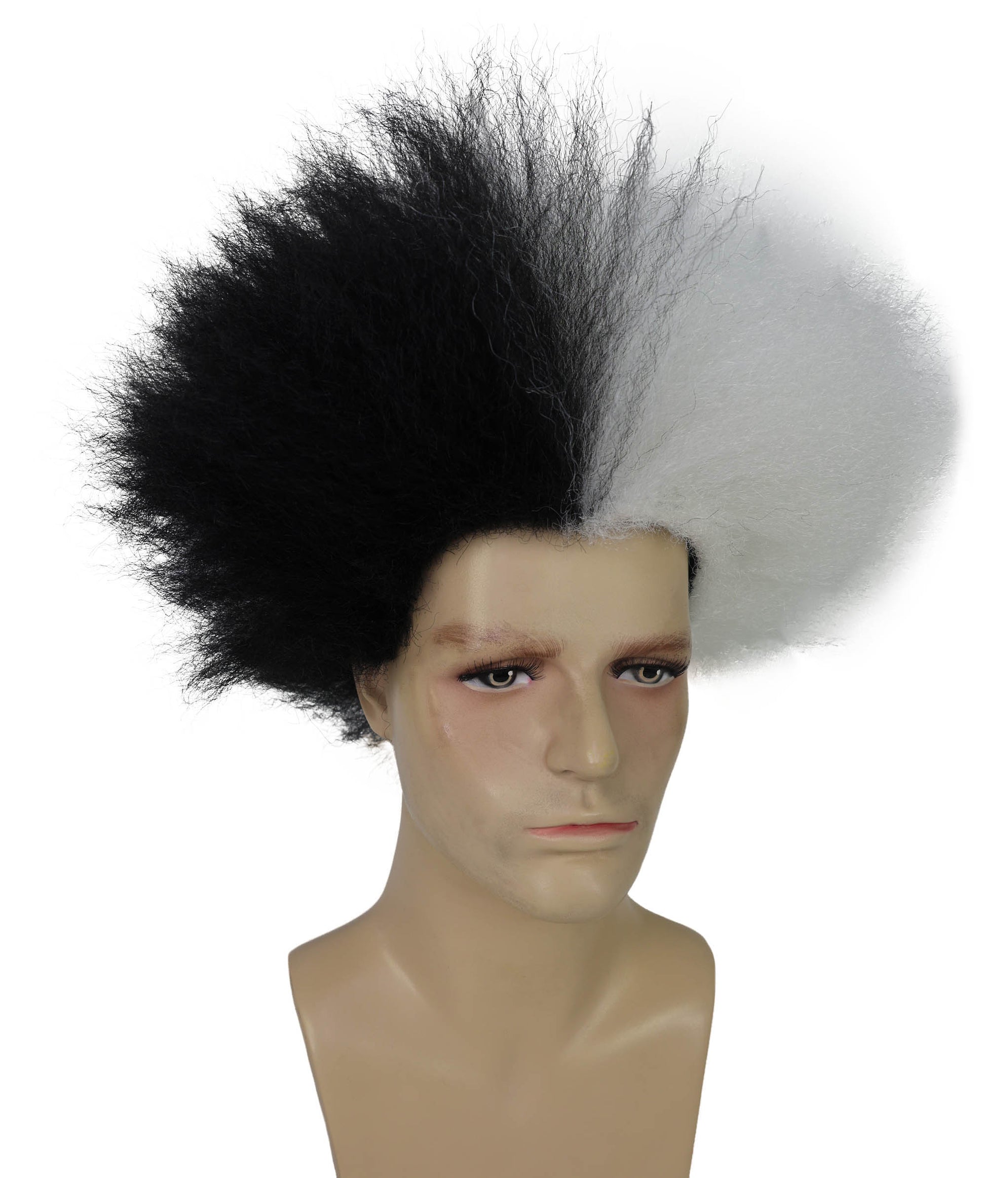 This short, fluffy synthetic wig is available in two electrifying color options: a striking sky blue for a whimsical vibe and a dramatic half-black, half-white version for those who prefer a bolder, contrasting statement.