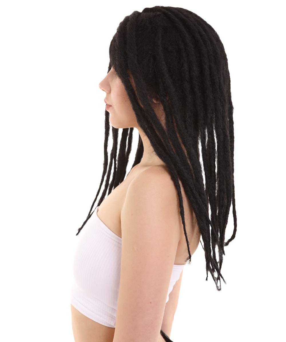 Made of flame-retardant Synthetic Fiber, this long dreadlock cosplay wig with bangs comes with an adjustable lining that can be stretched up to 22 inches in diameter making it perfect for both adults and children up to 5.