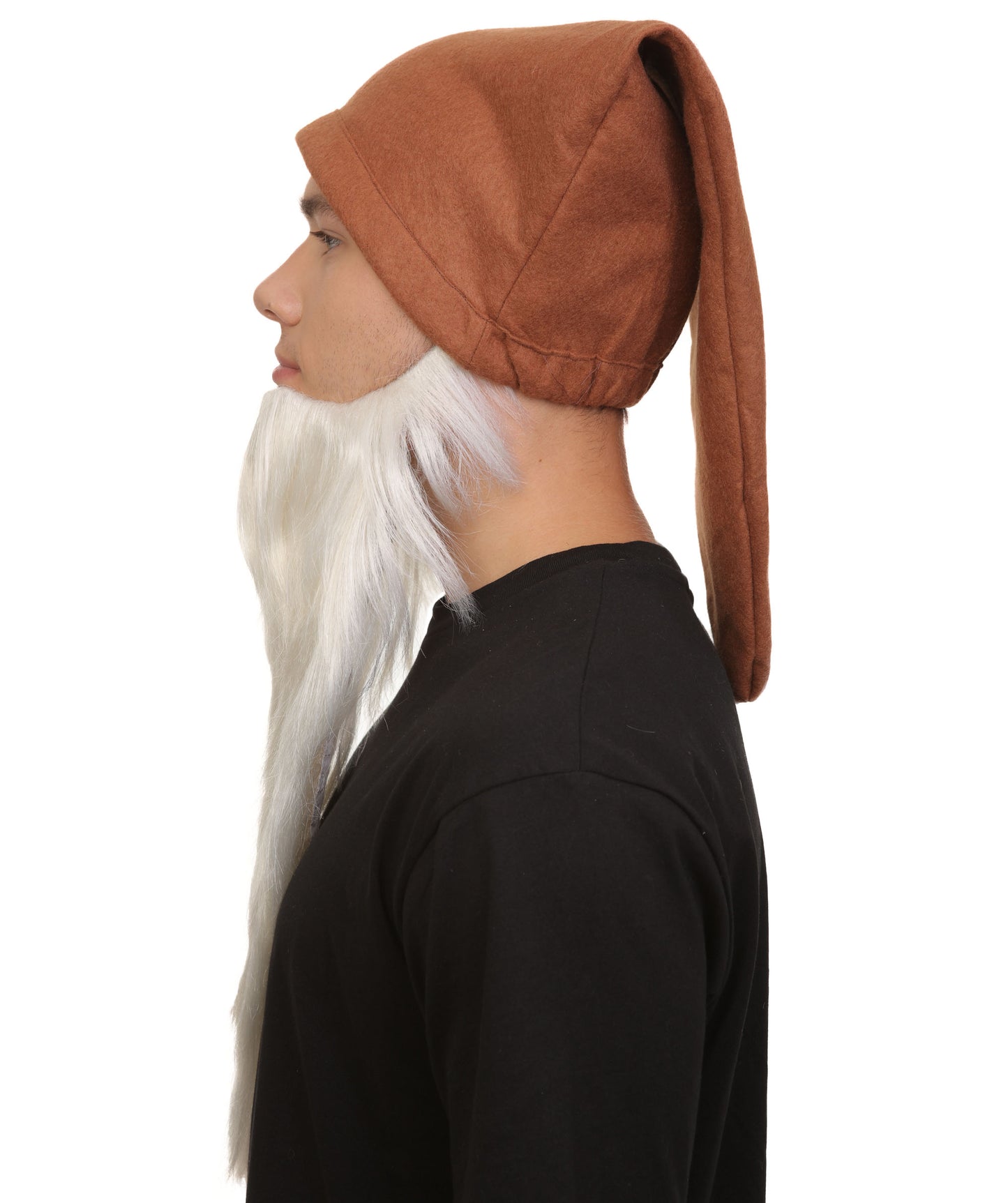 Men’s Classic Animated Snowy White Dwarf Cartoon Beard with Brown Hat | Flame-retardant Synthetic Fiber