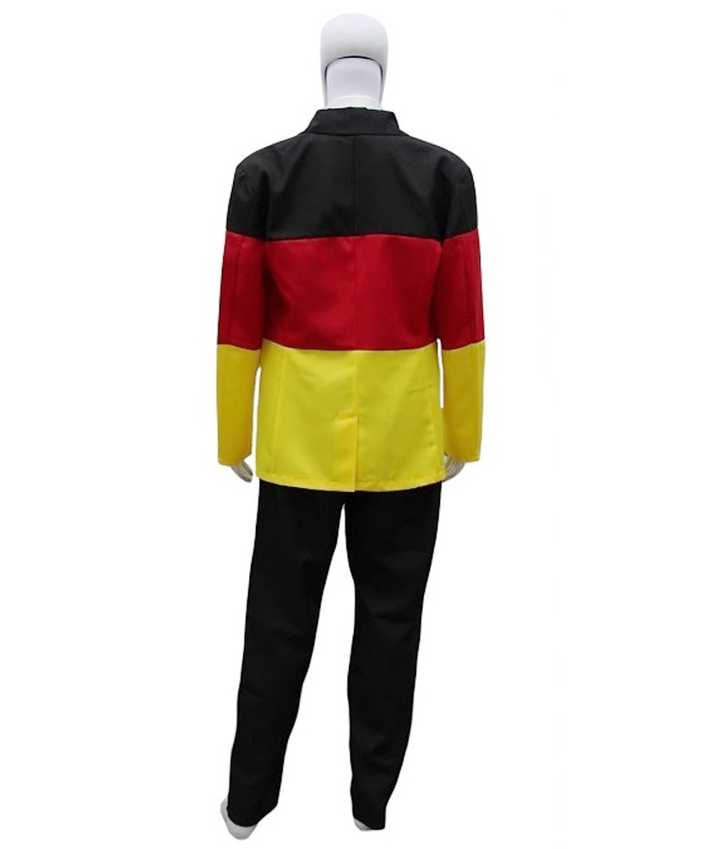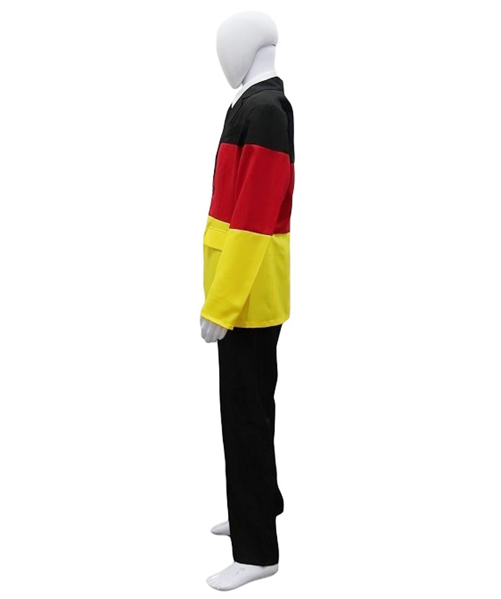 Imagine strutting into the festivities adorned in the vibrant hues of the German flag. The jacket exudes cool confidence, the pants bring the party to your legs, the shirt ties it all together, and the tie adds that touch of debonair charm. It's not just a costume; it's a fashion statement that says, ""I'm here to have a good time!"" Comfortable and eye-catching, it's the ultimate choice for anyone who wants to stand out and celebrate in style.