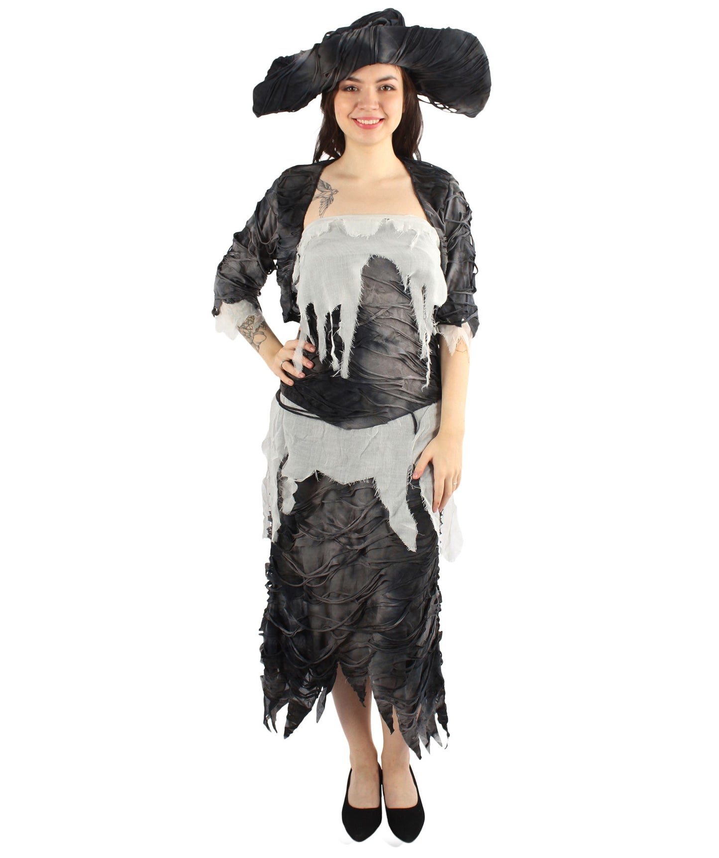 Set sail on a haunting adventure with our Women's Ghost Ship Pirate Costume, perfect for Halloween and cosplay. Embrace the spectral allure of the high seas and become the captain of your own ghostly ship with this captivating ensemble, featuring a black and white torn dress and a large hat.