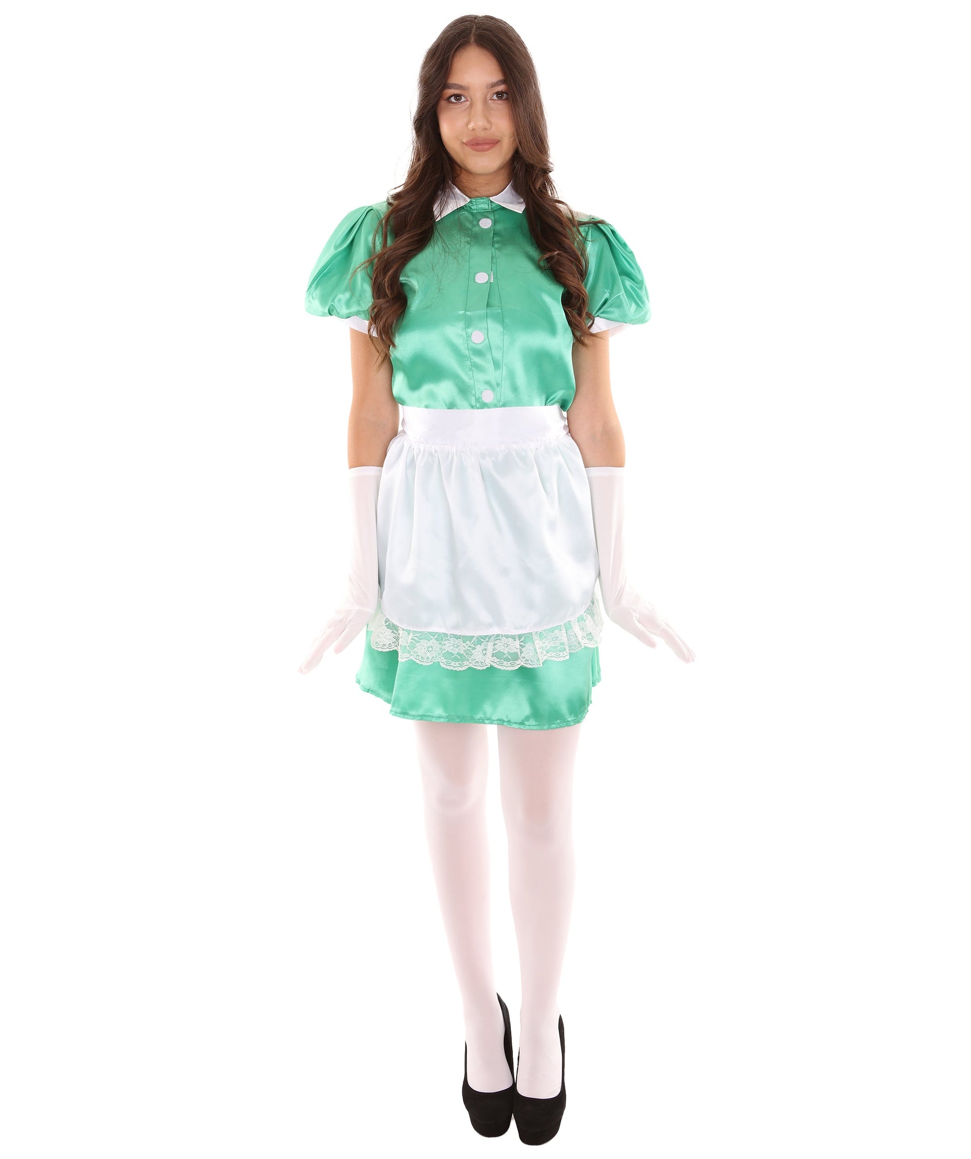 The white apron adds a touch of innocence and playfulness, while the pair of white gloves adds a touch of sophistication. Made with flame-retardant synthetic materials, this costume is comfortable to wear and designed to last. Whether you're dressing up for Halloween or a cosplay event, our Maid Green Costume is sure to captivate and delight, making you the belle of the ball!
