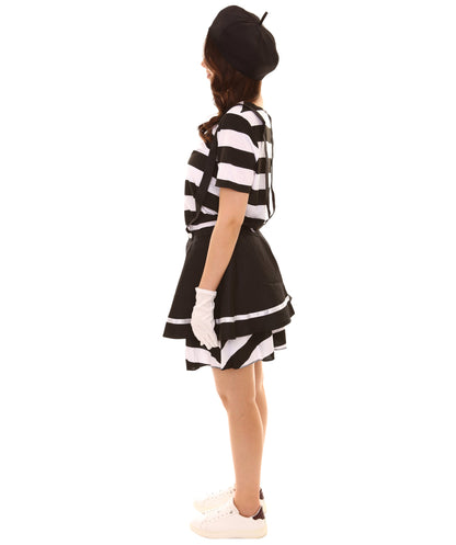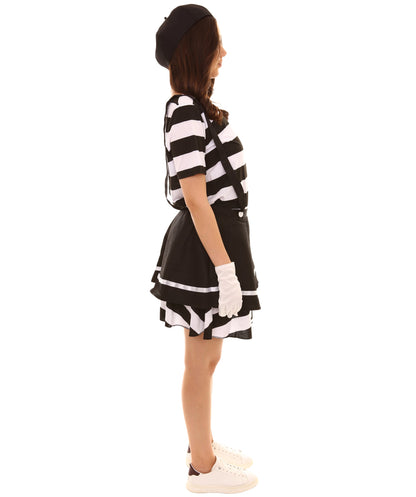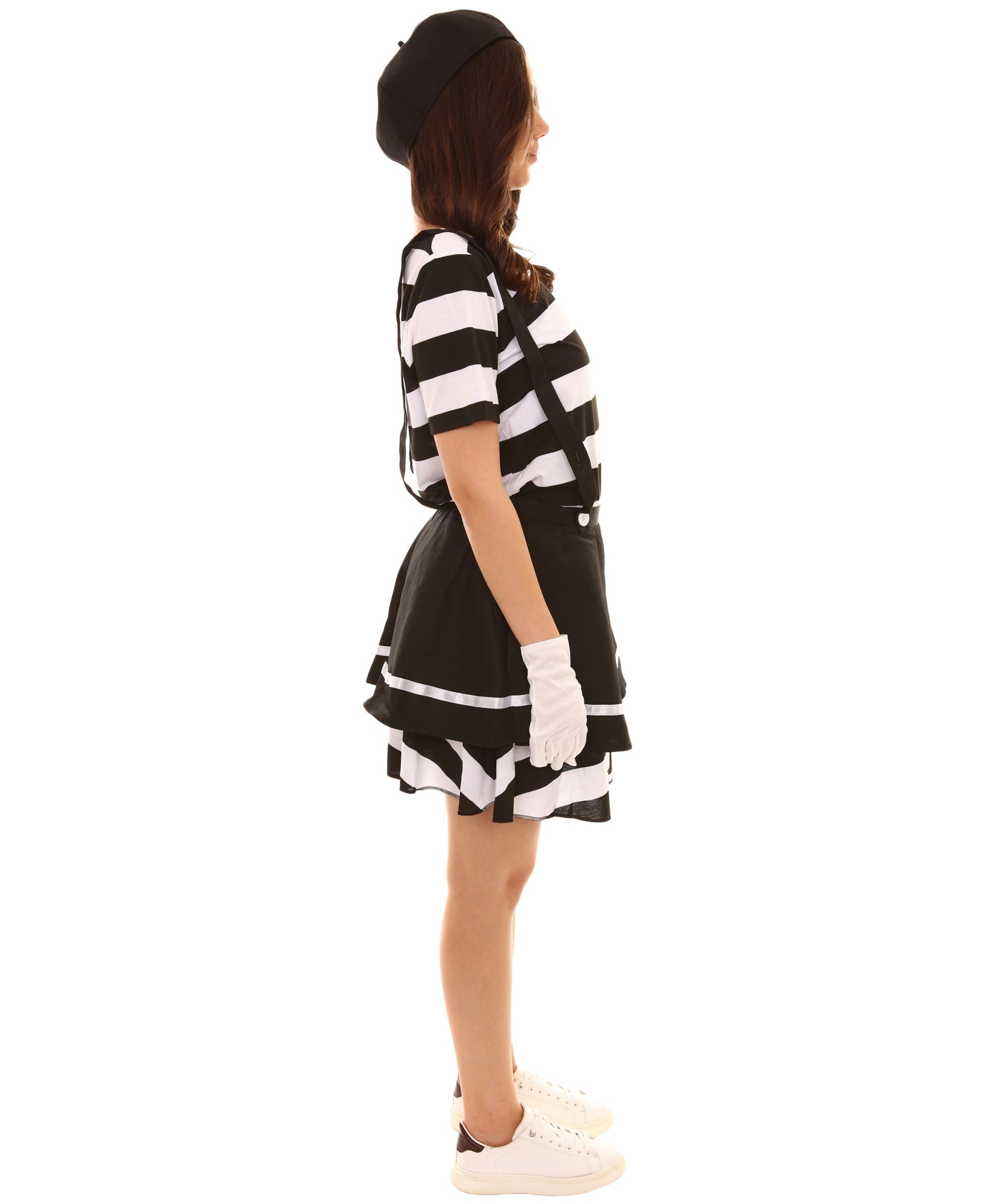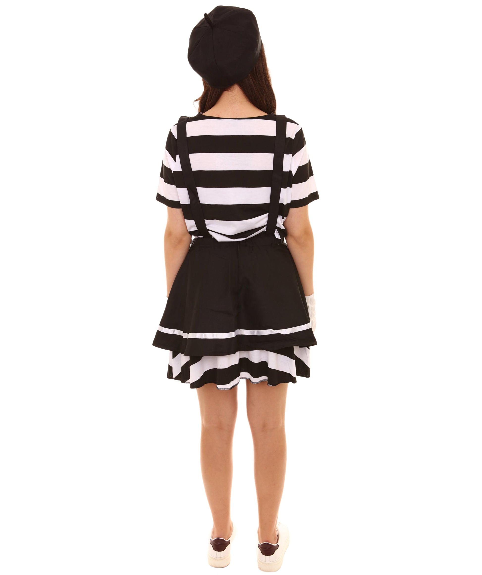 It features a black-and-white striped top that delivers iconic Parisian flair, paired with a sleek black skirt. Complete with coordinating accessories like a matching beret and suspenders, this Mime Costume lets you fully embody the timeless character with ease.
