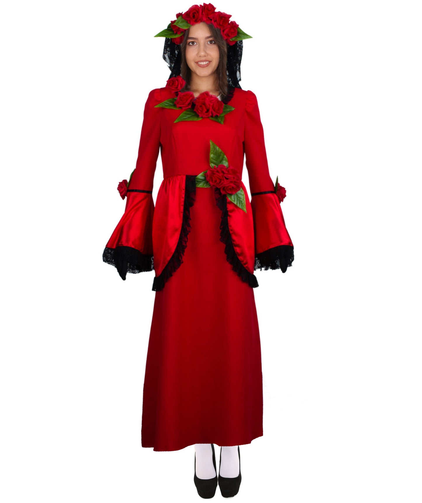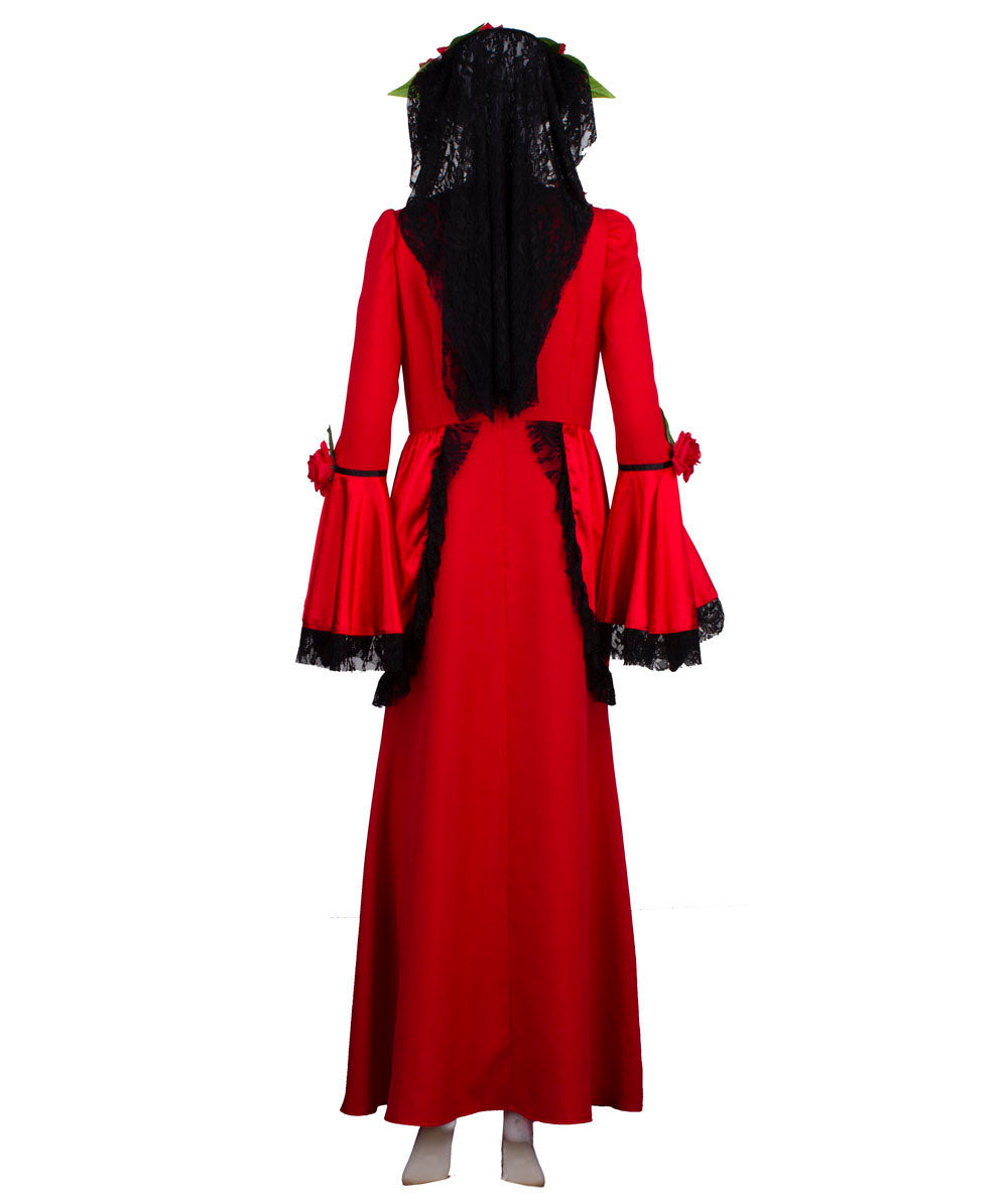 Women's Halloween Fancy Animated Horror Senor Bride Costume, Red & Black Color with Green Leaves