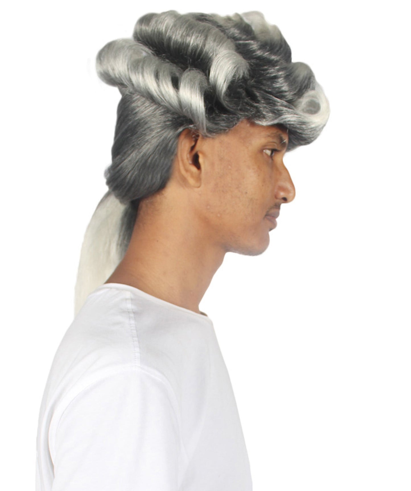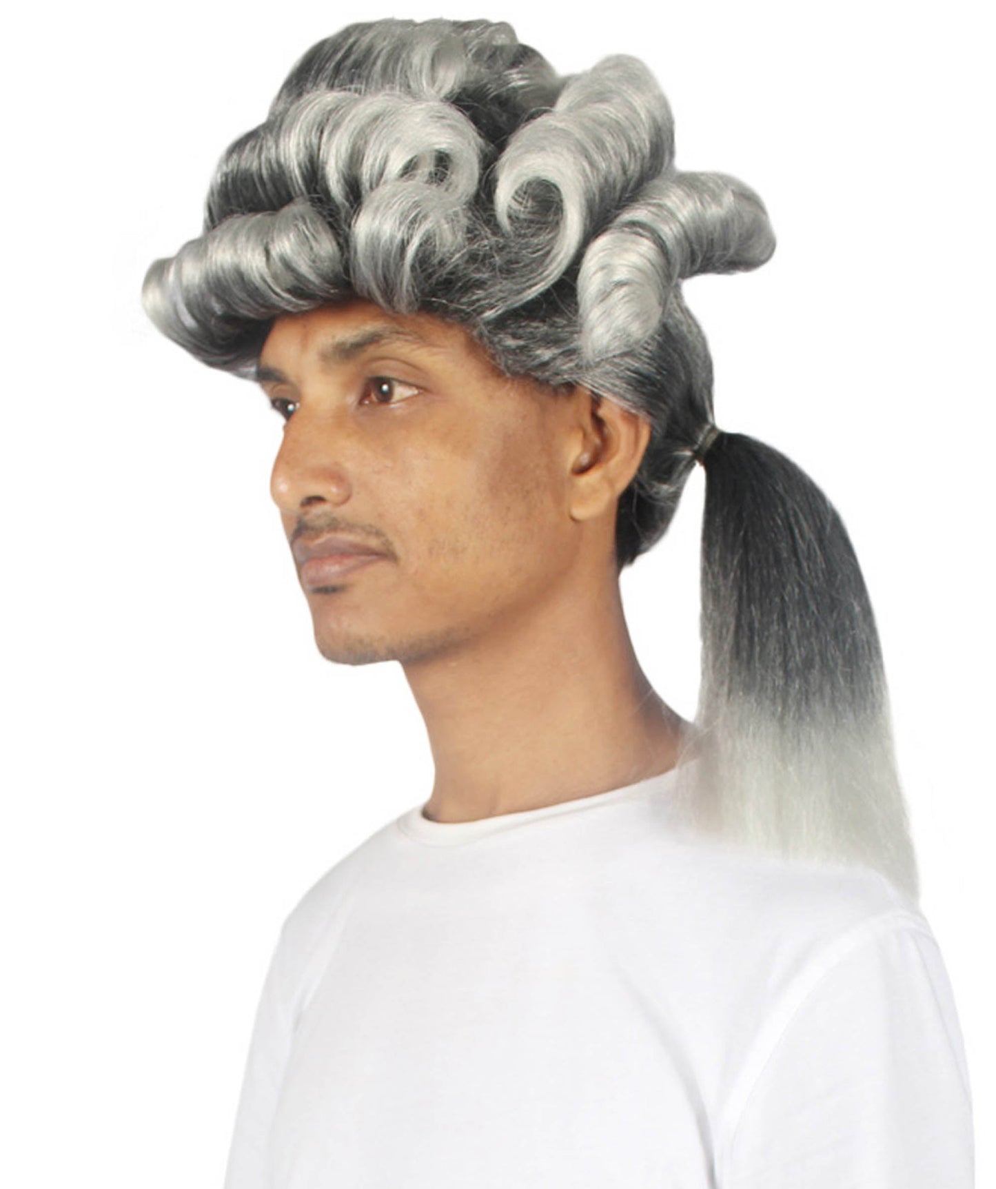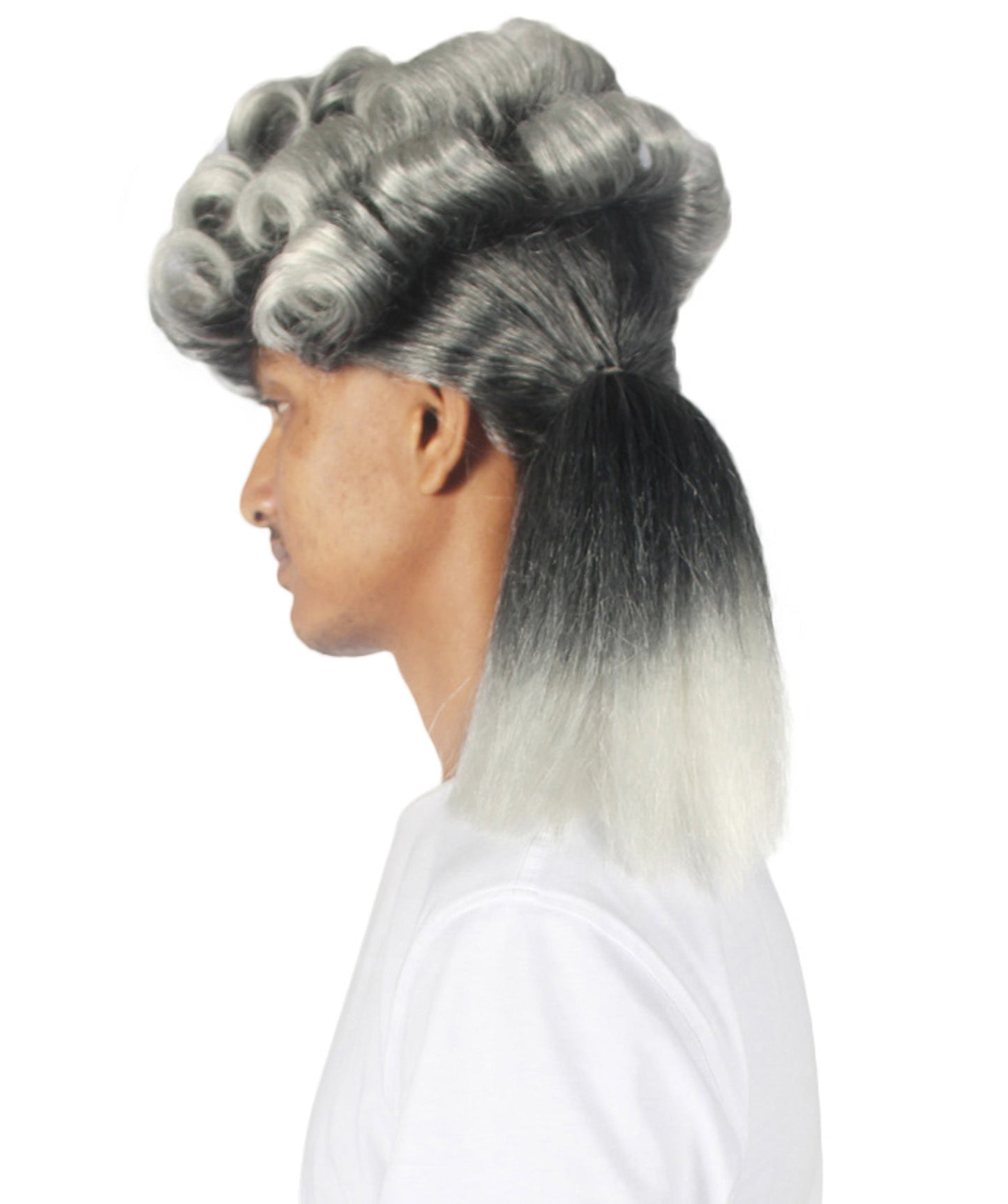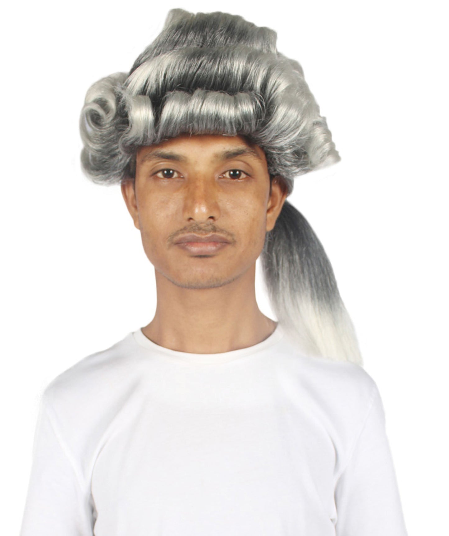 This exquisite Colonial Long Grey Historical Wig captures the essence of the colonial era with its long curly gray hair, rolled curls on the head, and a sleek ponytail tied at the back. Perfect for Halloween, cosplay events, and historical reenactments, this wig is a must-have for any history enthusiast or cosplayer.