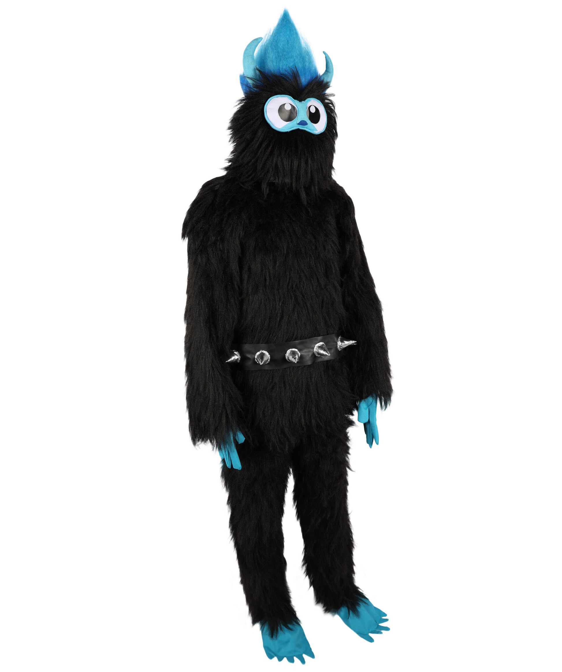Featuring a thick black faux-fur body, vibrant electric blue accents, and a striking mohawk hairstyle, this Monster Costume & Bundle Set with Head Mask is made for kids and adults who want to stand out while staying cozy and comfy.