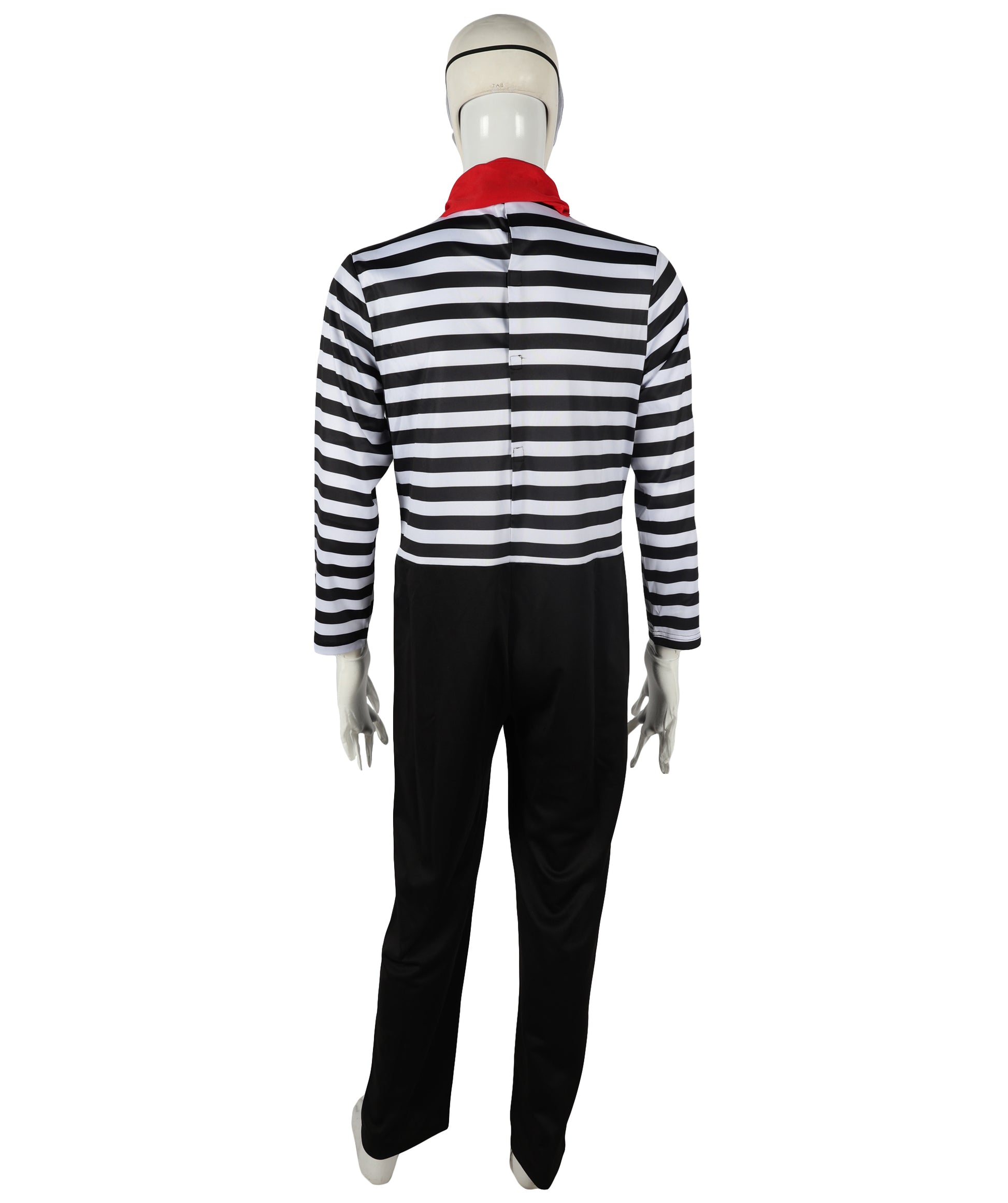 Inspired by classic street performance style, this mime costume set captures the charm of silent expression with its timeless black-and-white theme. Featuring a bold striped shirt, matching suspenders, crisp white gloves, and a classic black beret, it’s a complete outfit that instantly transforms you into a living work of art.