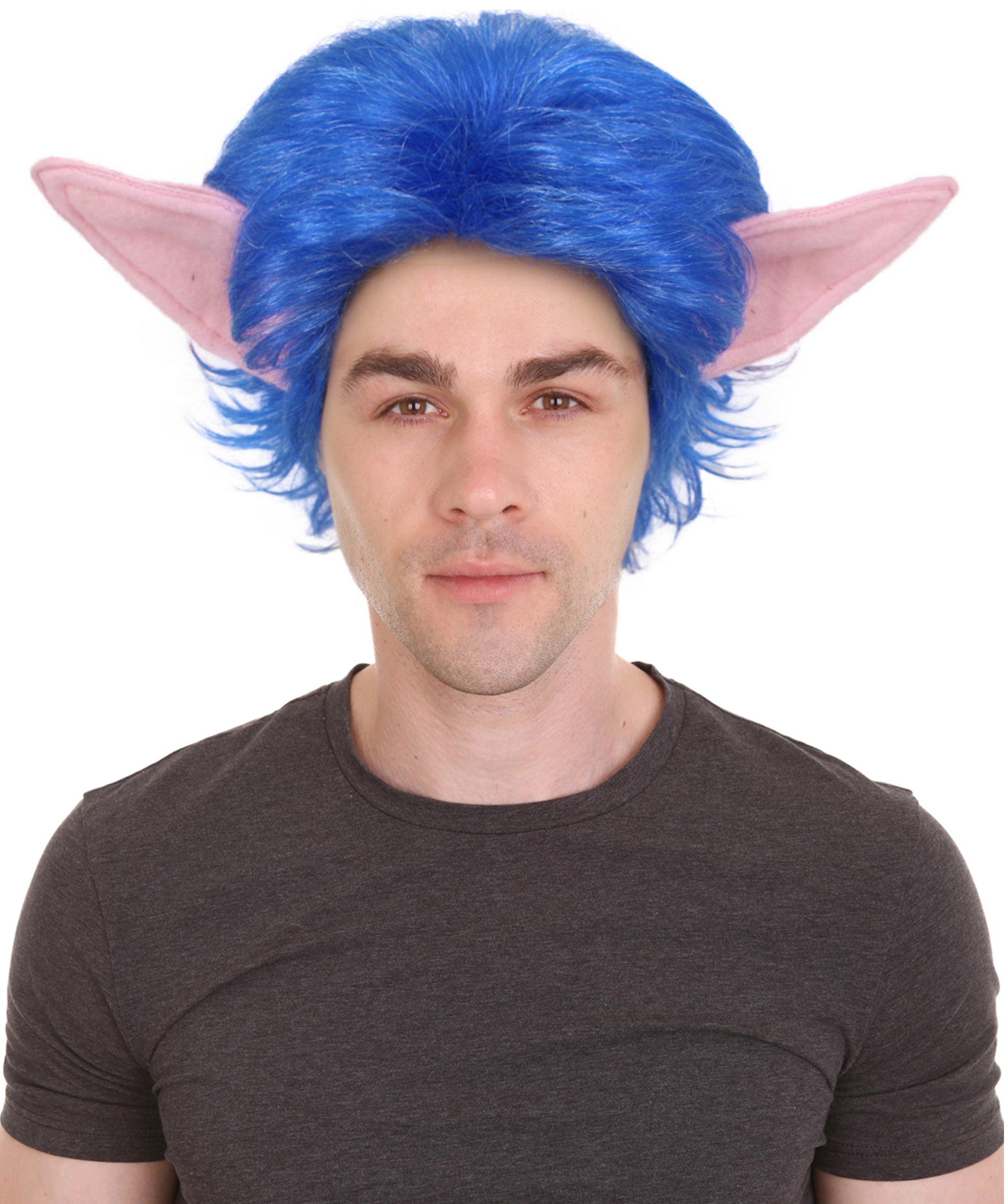 HPO Adult Men's blue wig with ear, perfect for Halloween, Flame-retardant synthetic fiber