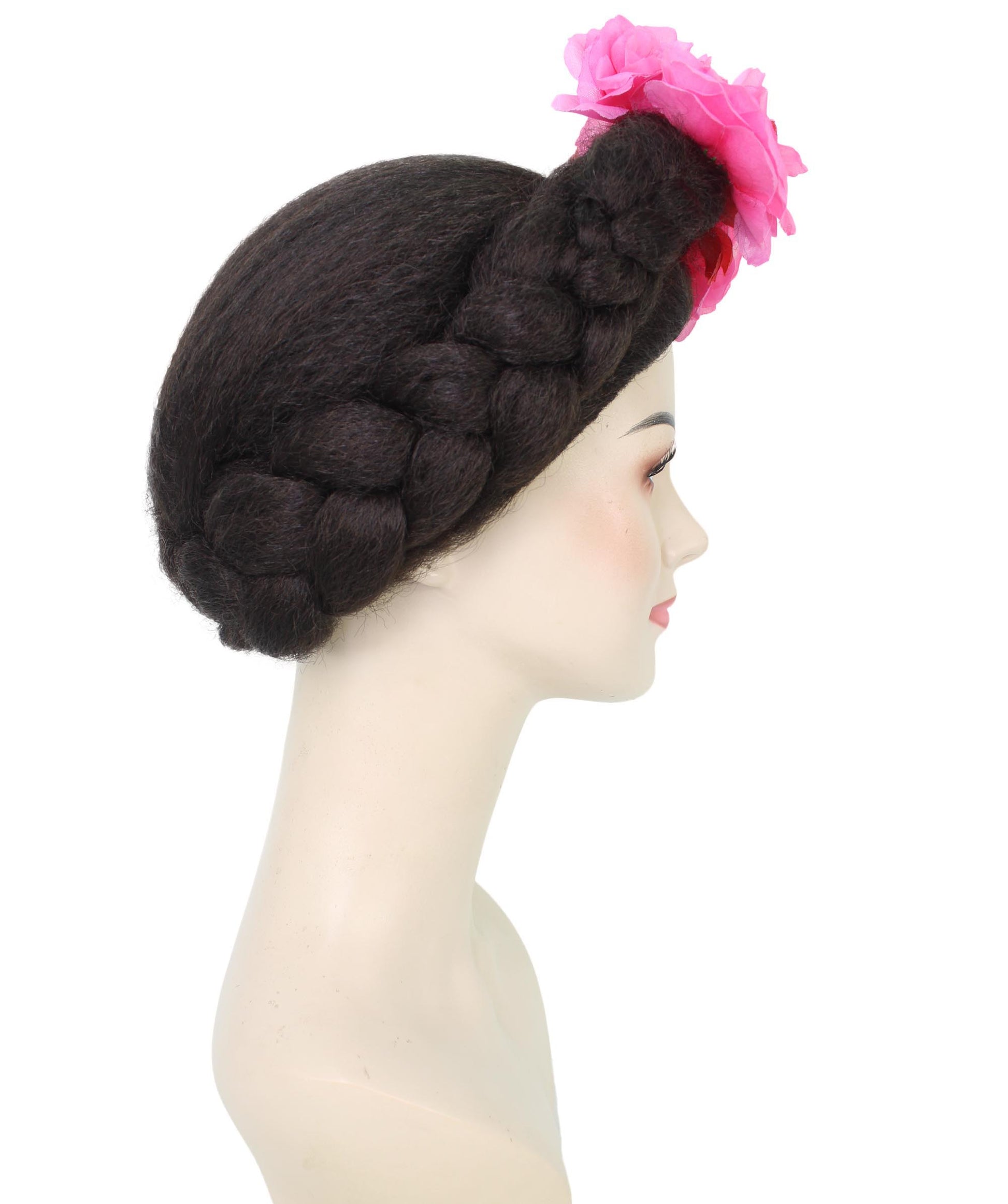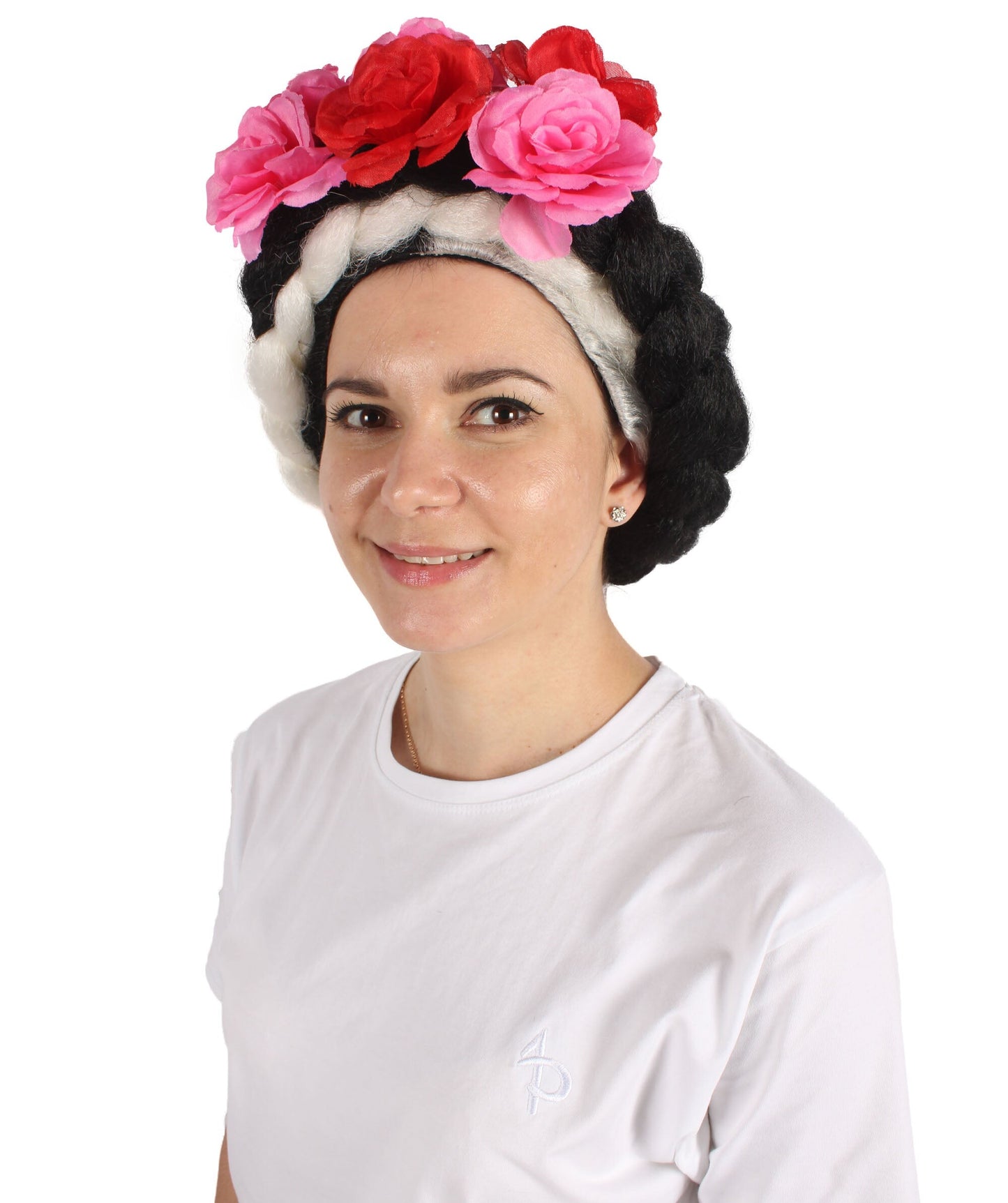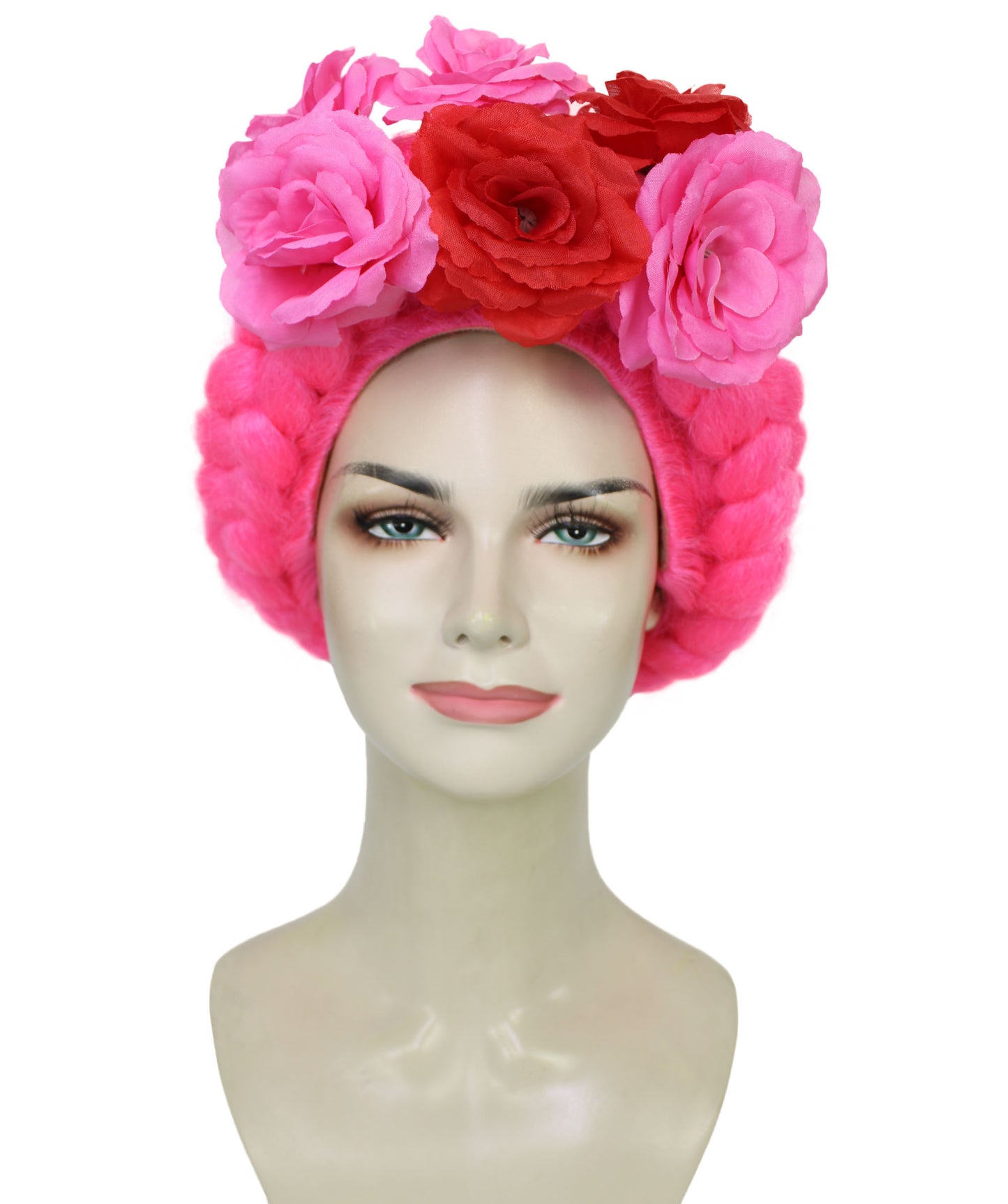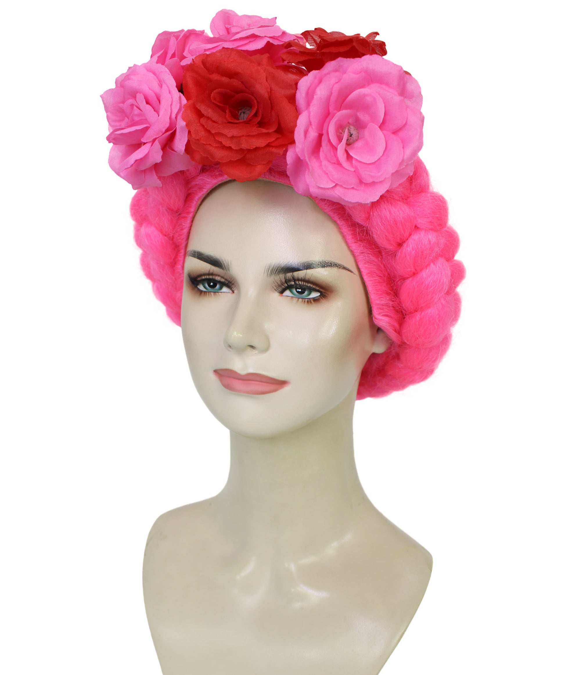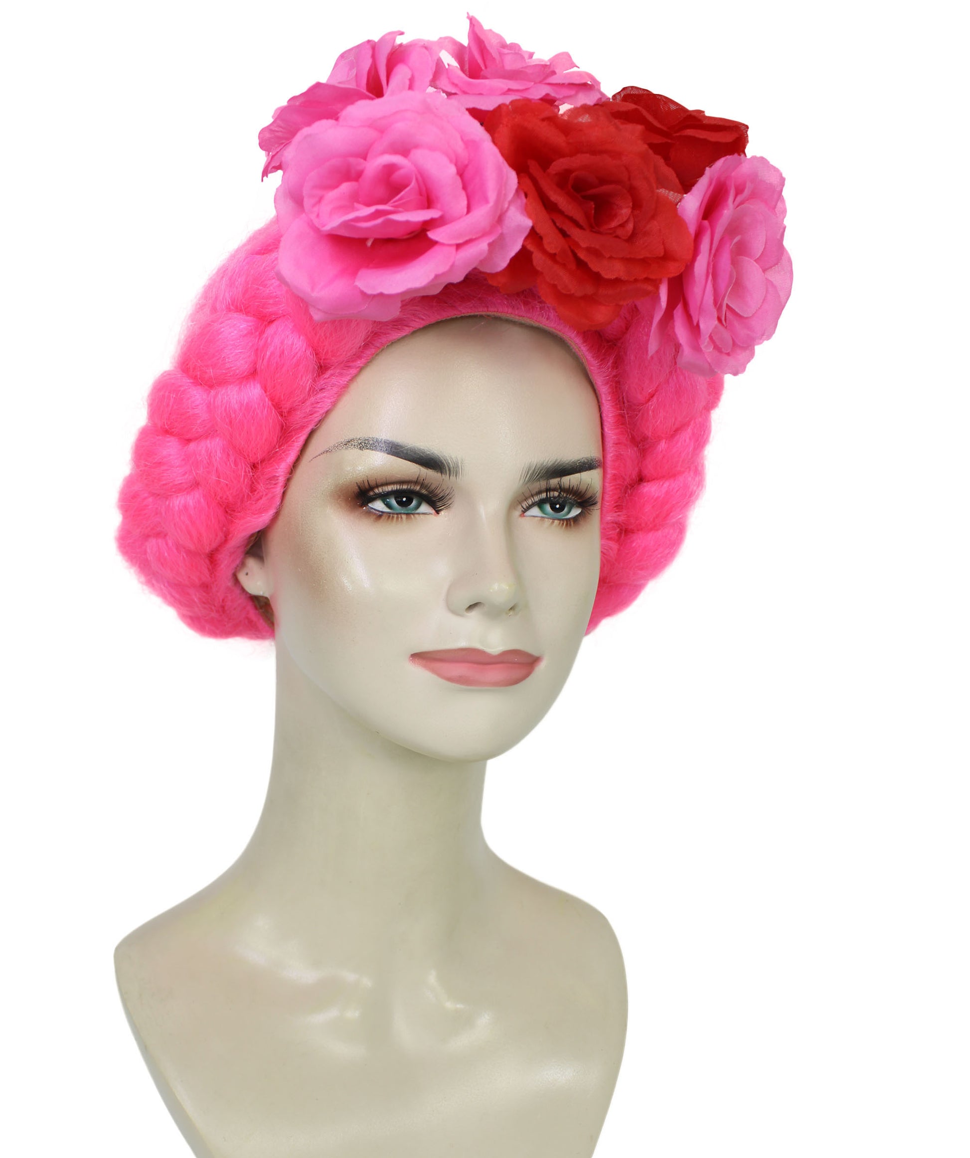 Celebrate Halloween mimicking the legendary Mexican artist Frida Kahlo with the Black Pink Floral Braided Wig - the perfect accessory for your Halloween or cosplay outfit!