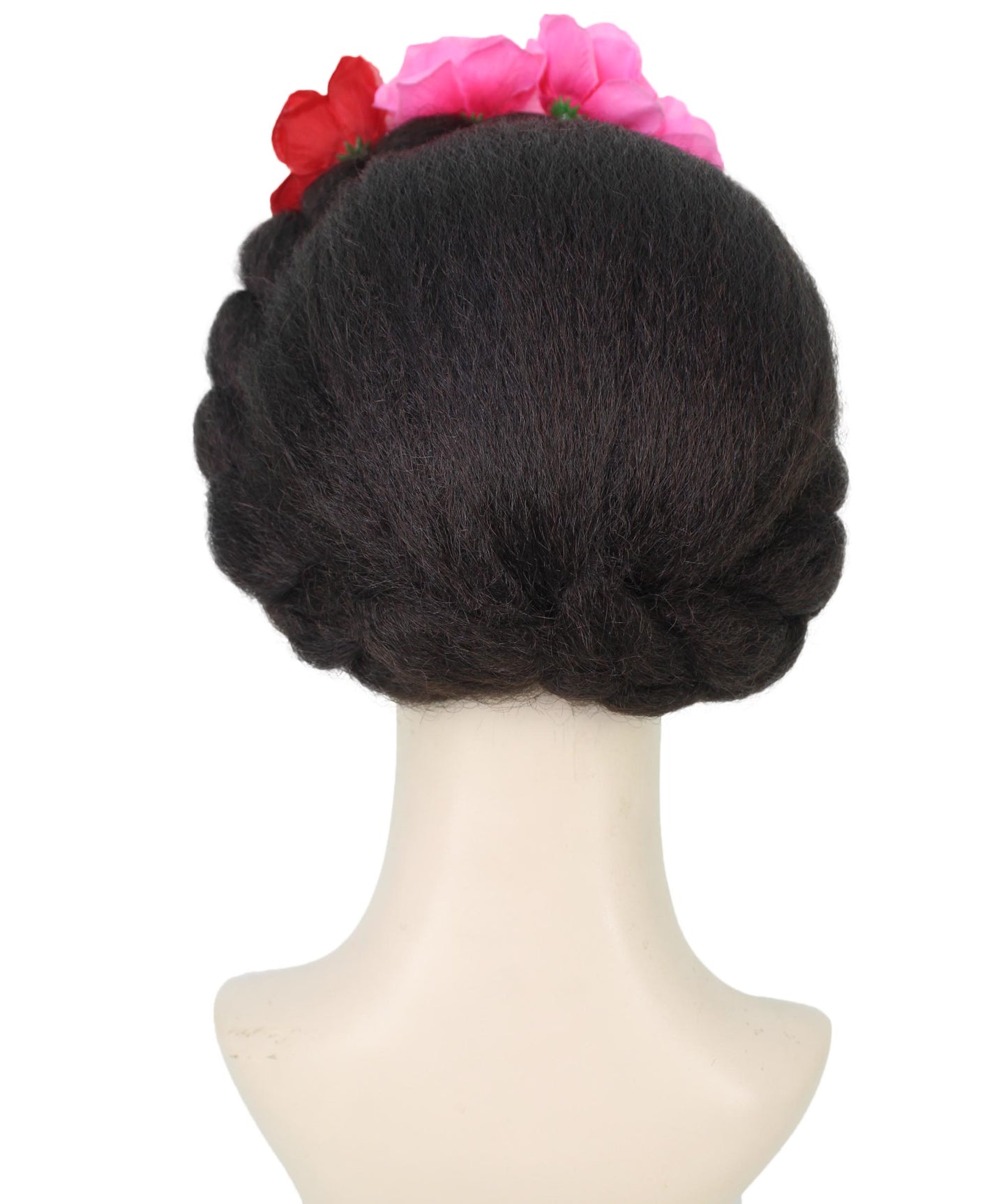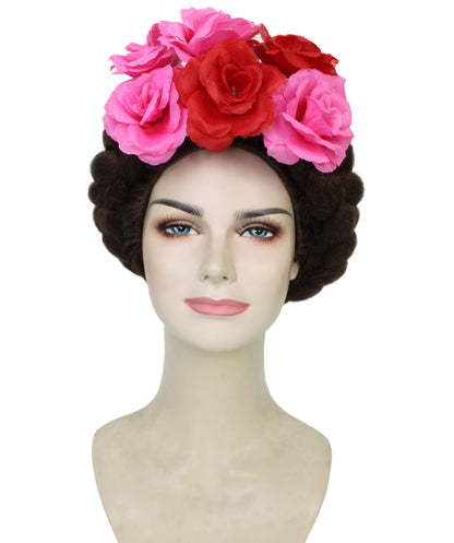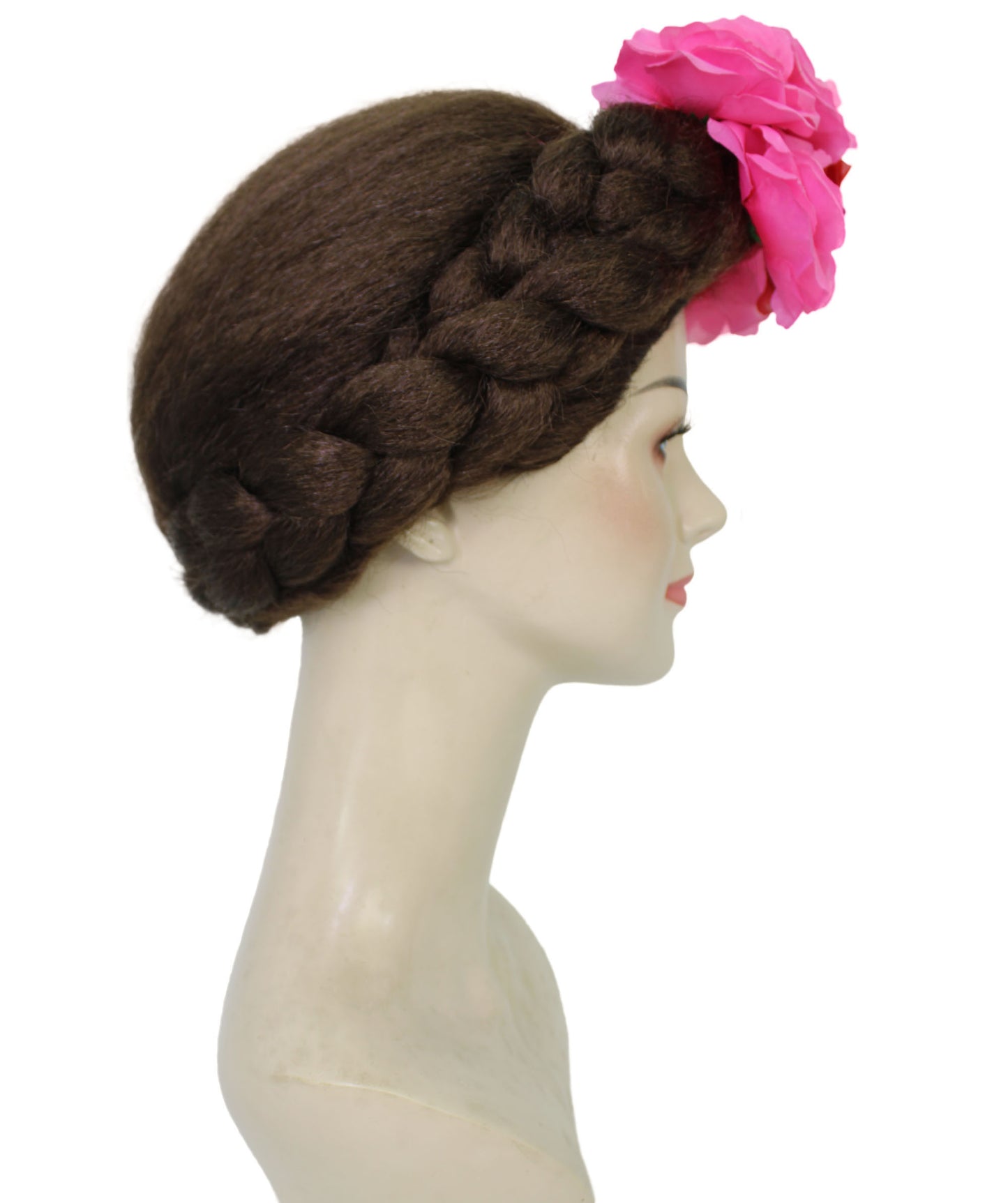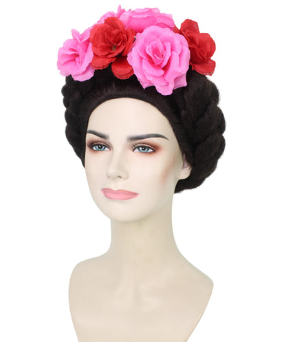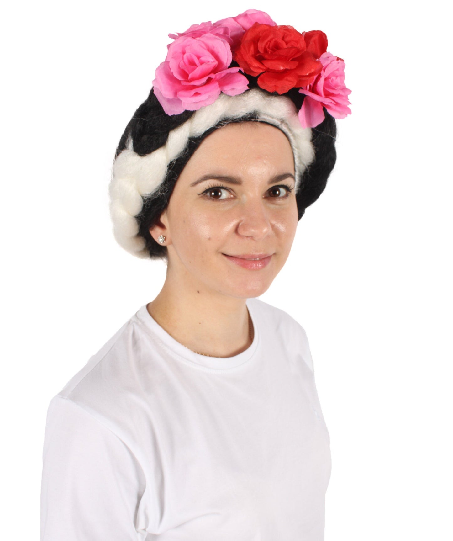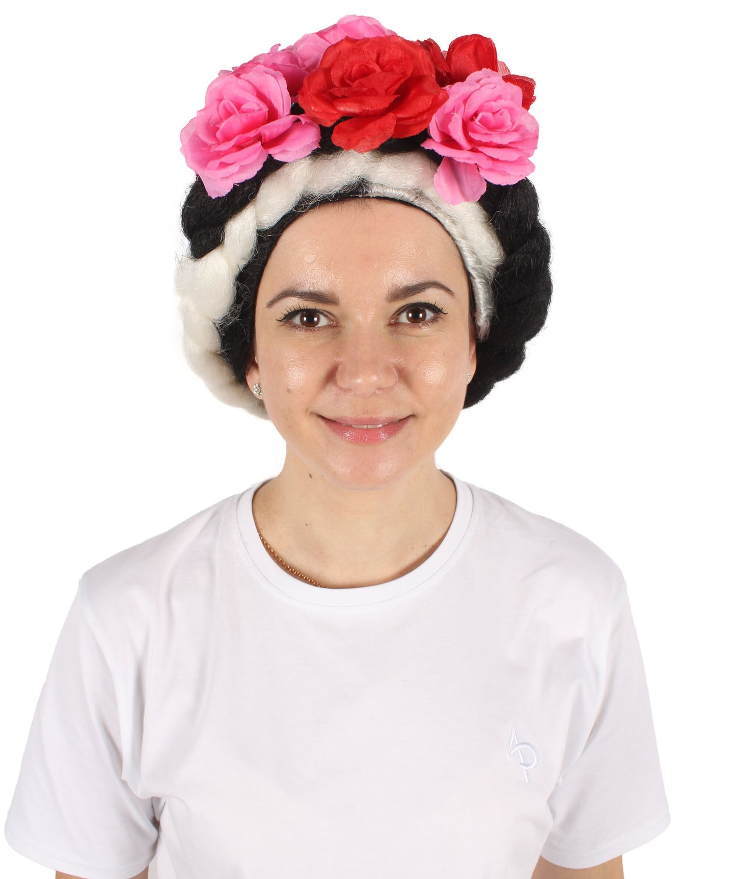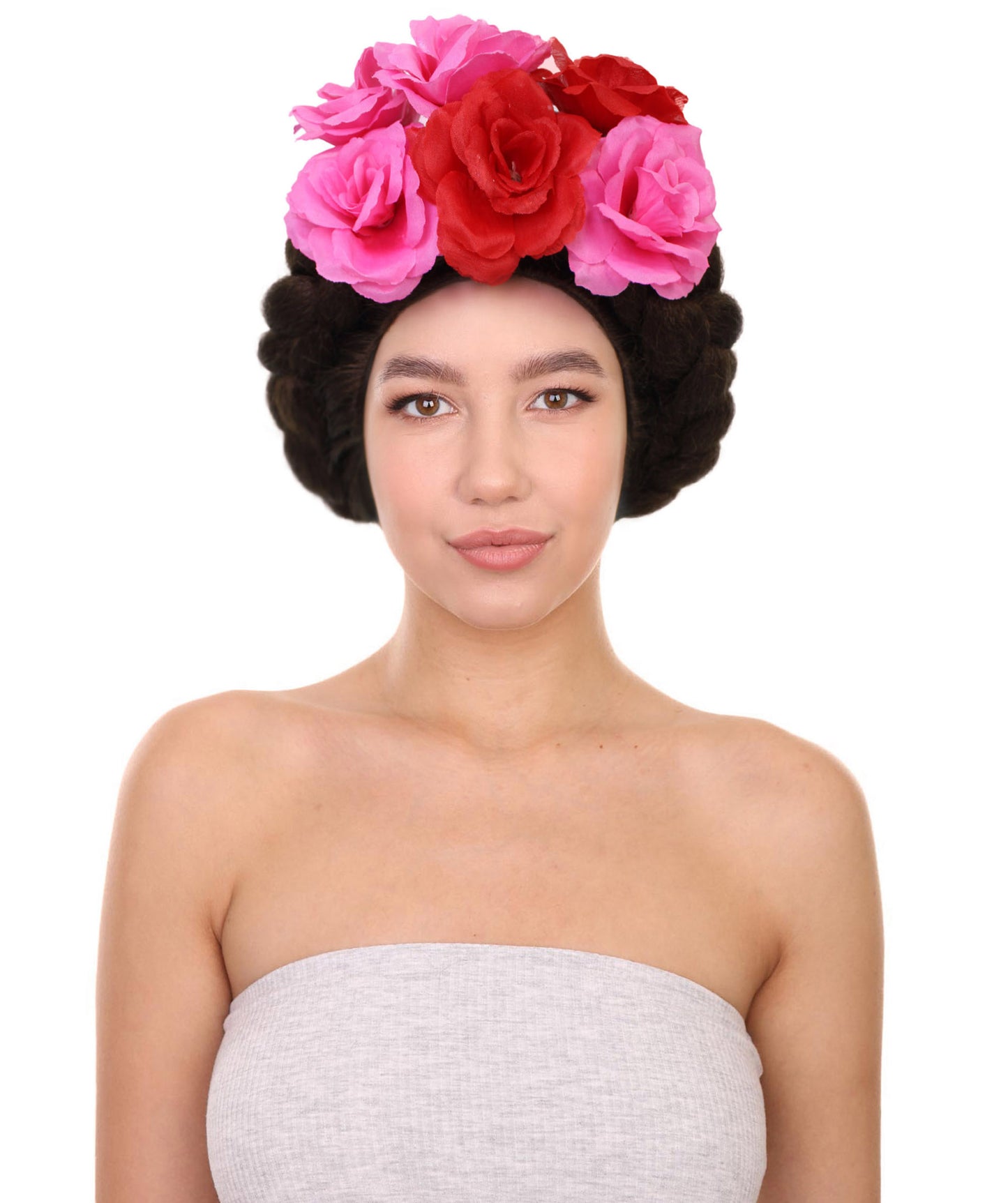 Celebrate Halloween mimicking the legendary Mexican artist Frida Kahlo with the Black Pink Floral Braided Wig - the perfect accessory for your Halloween or cosplay outfit!