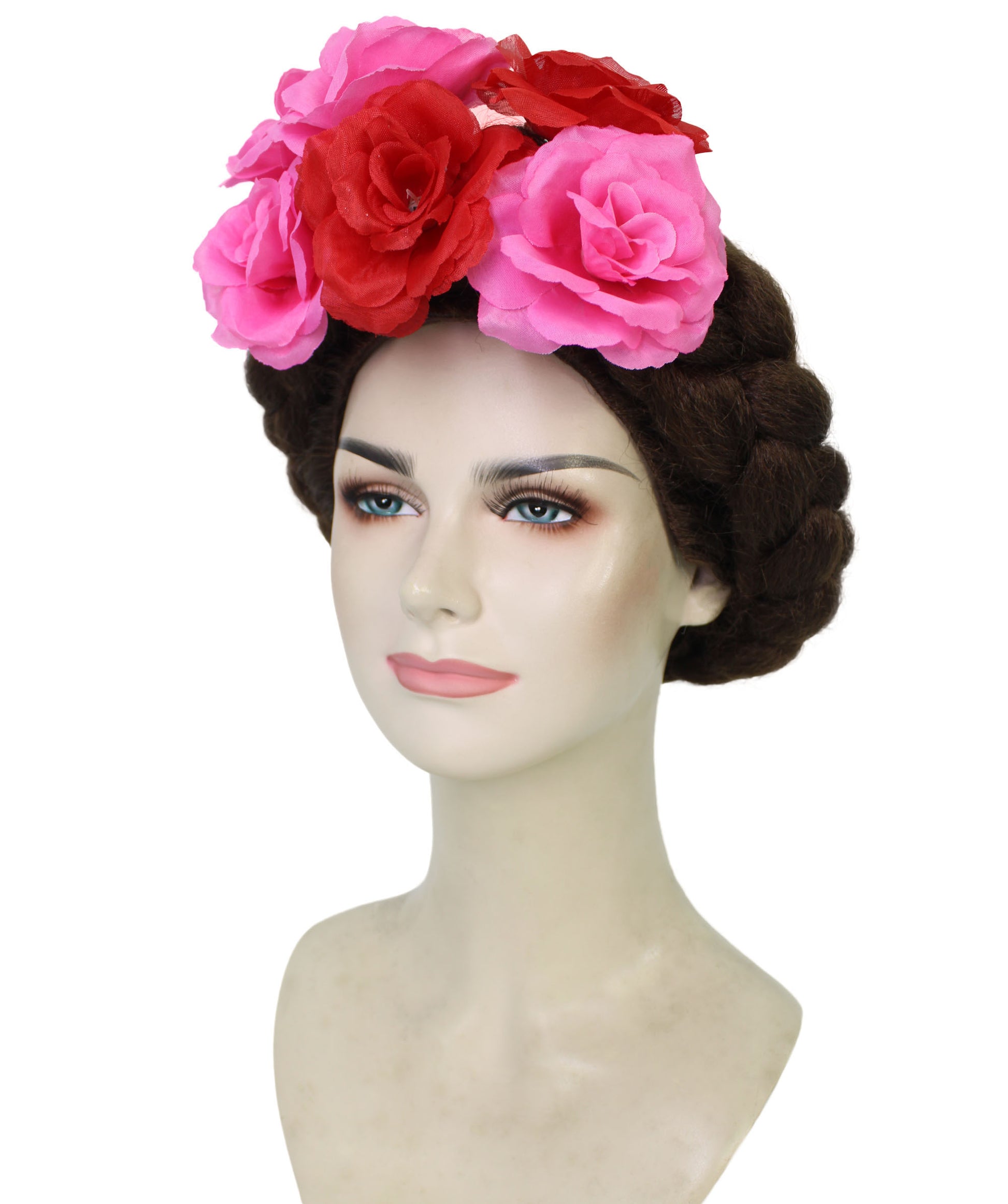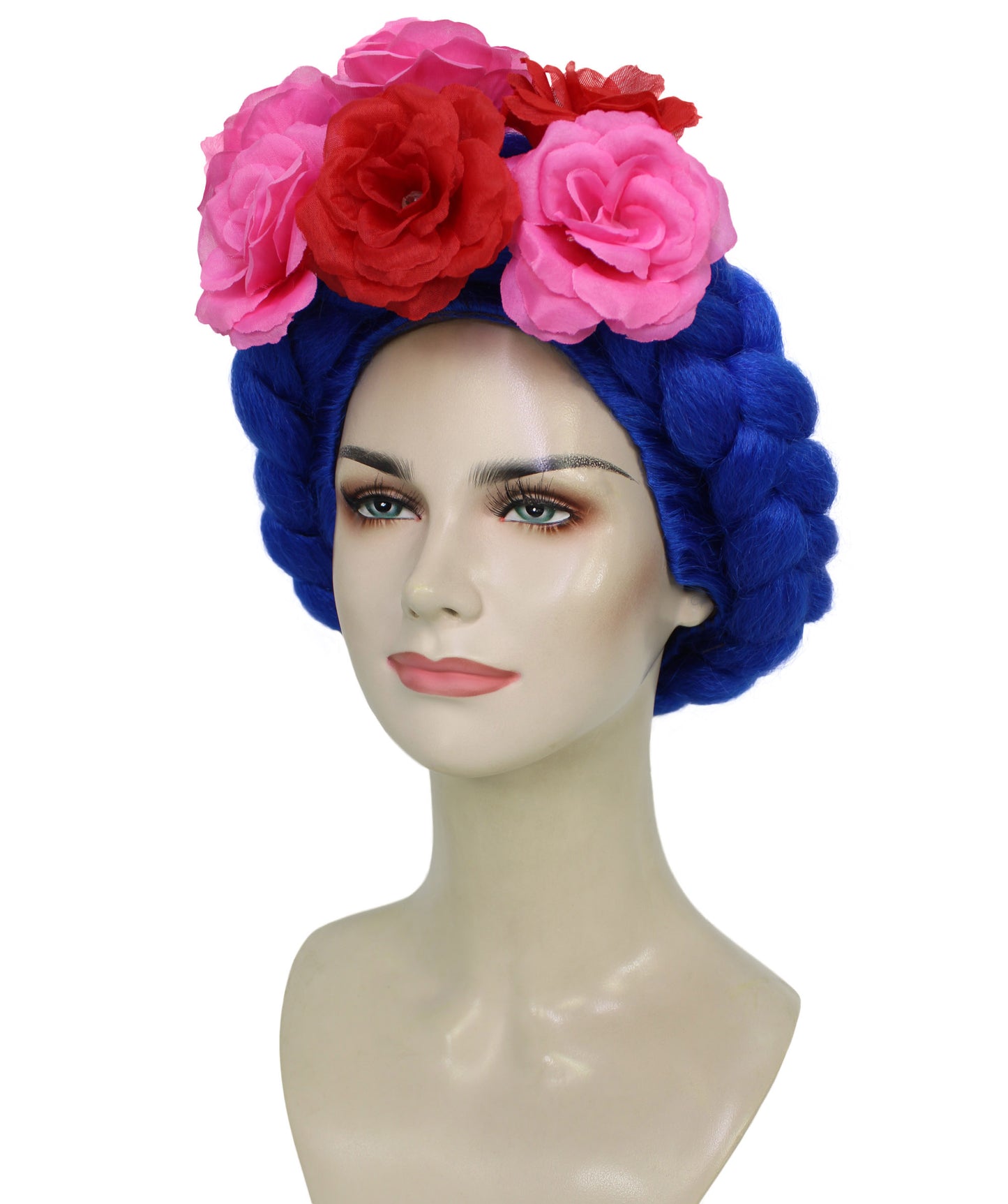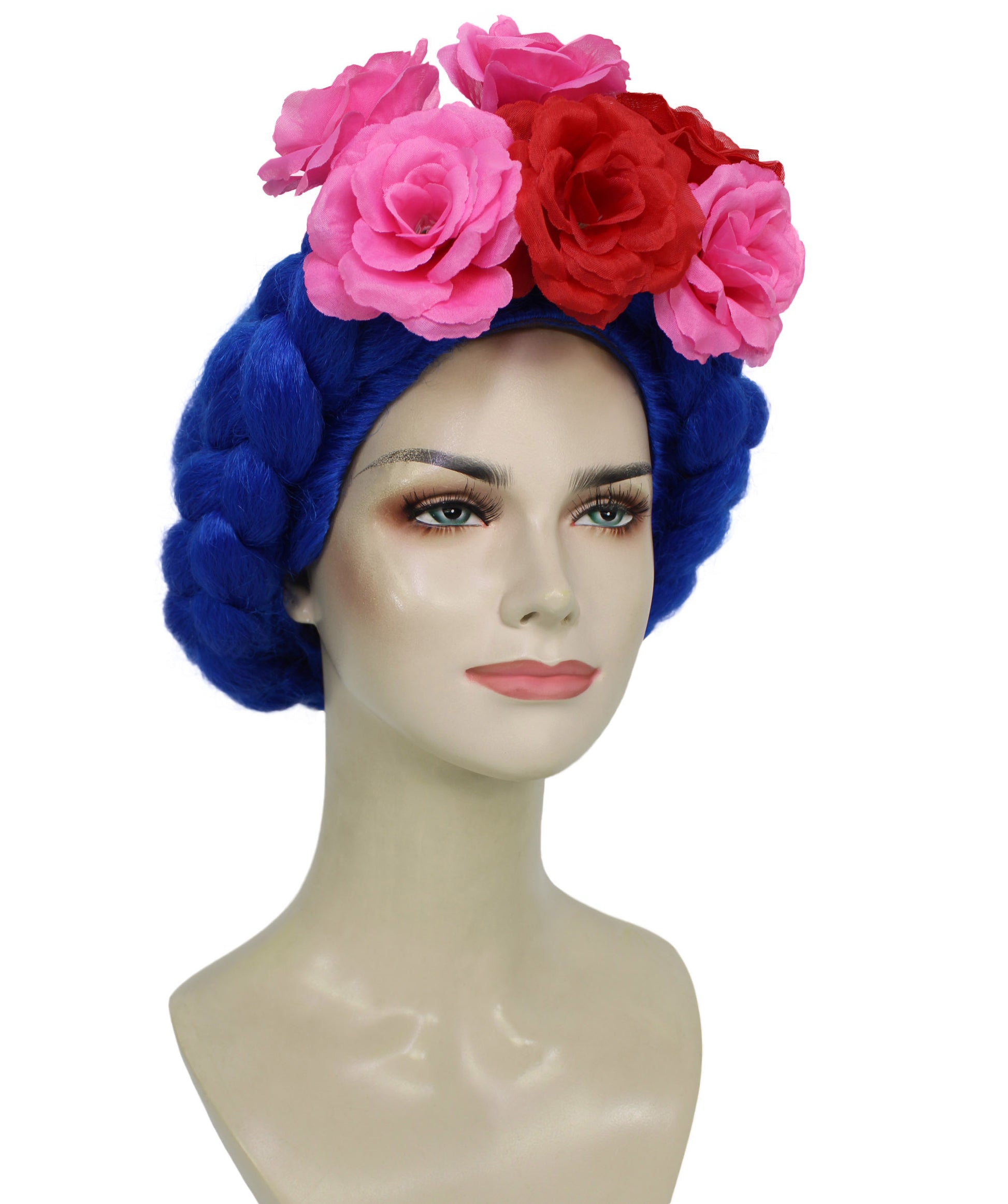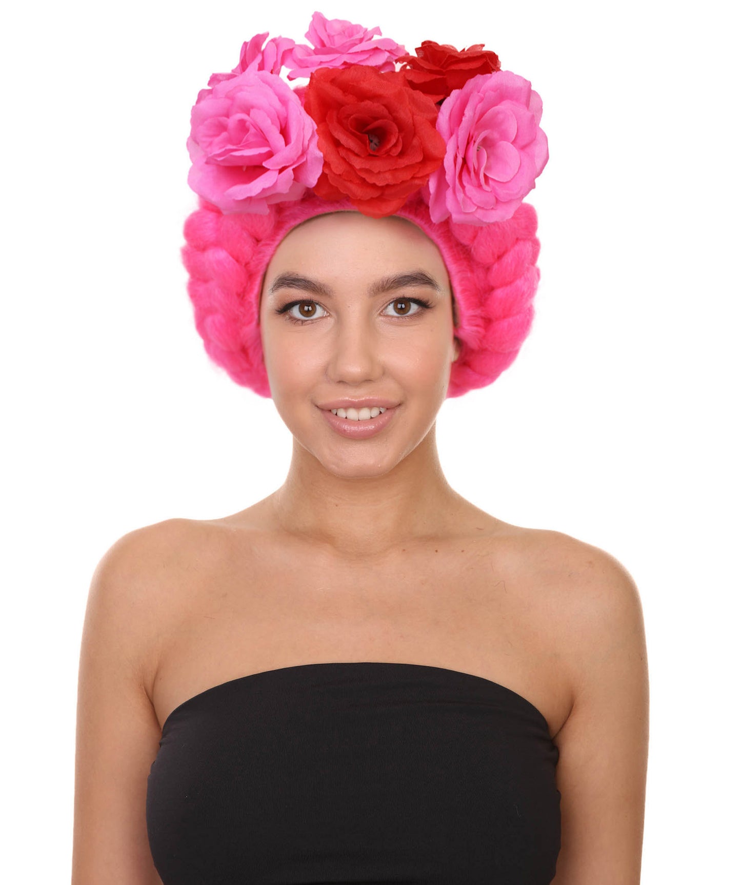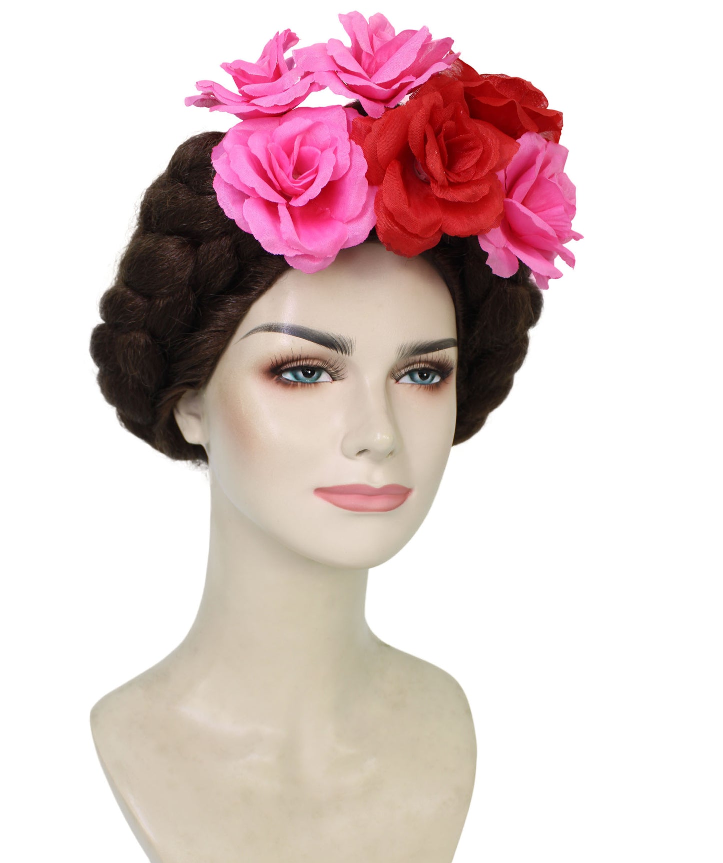 Celebrate Halloween mimicking the legendary Mexican artist Frida Kahlo with the Black Pink Floral Braided Wig - the perfect accessory for your Halloween or cosplay outfit!