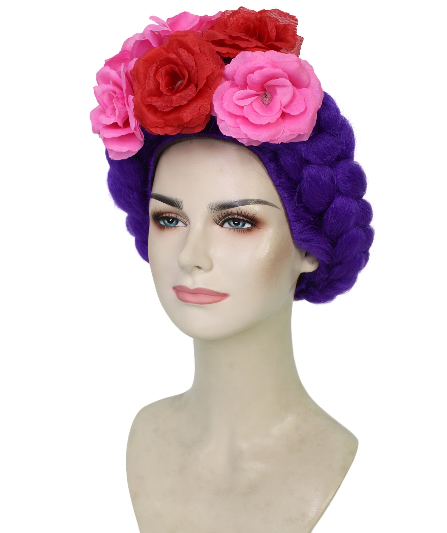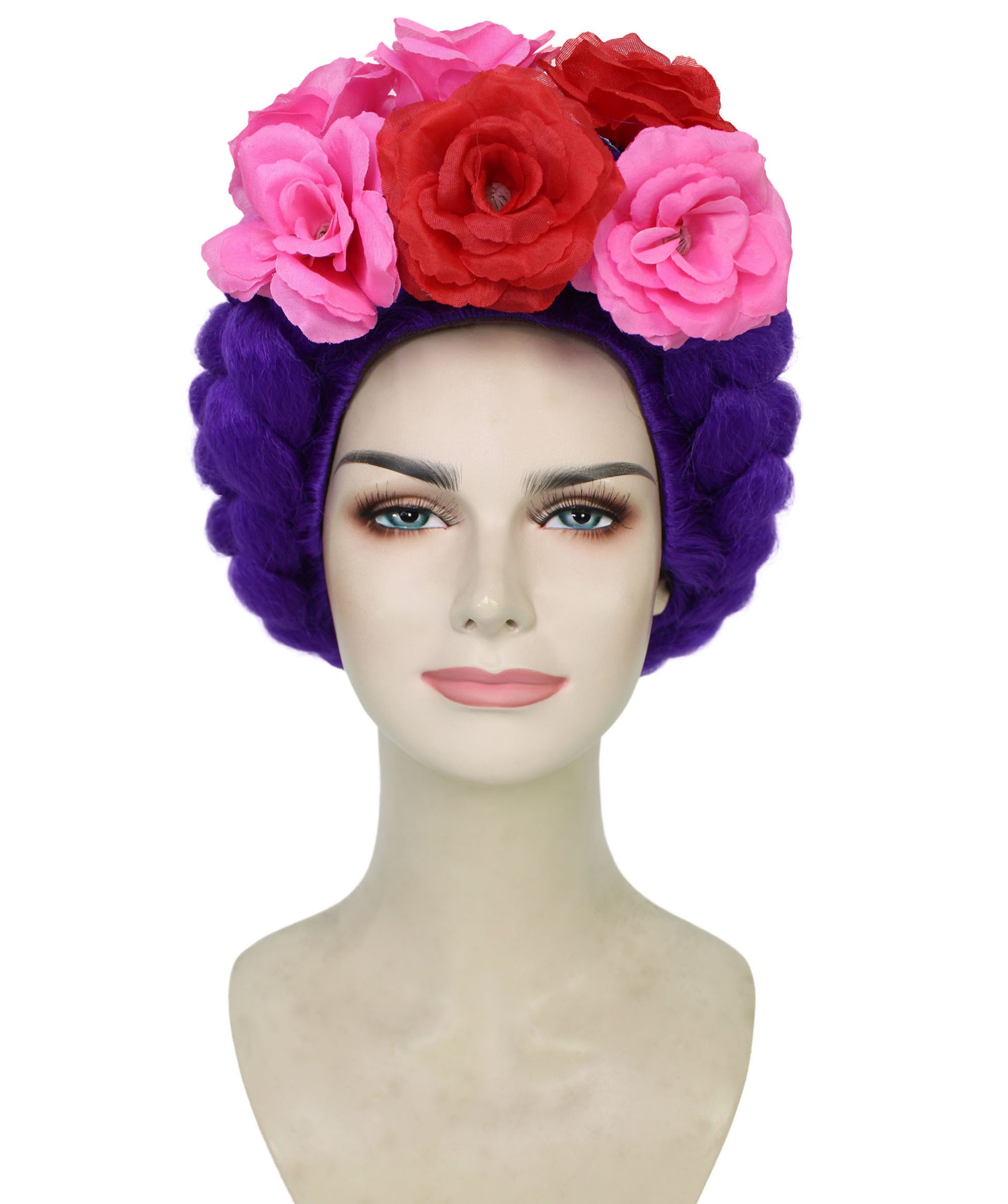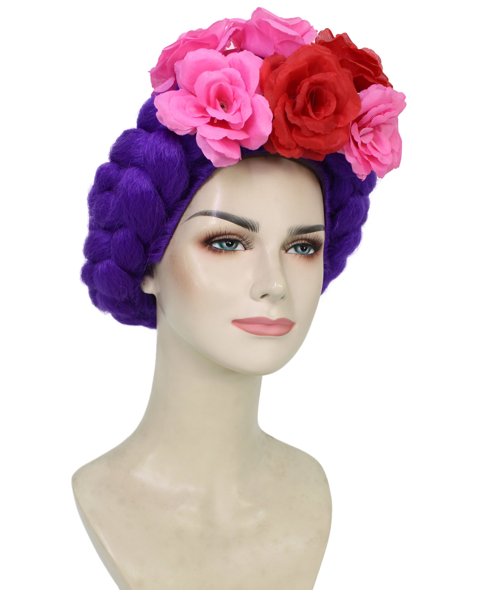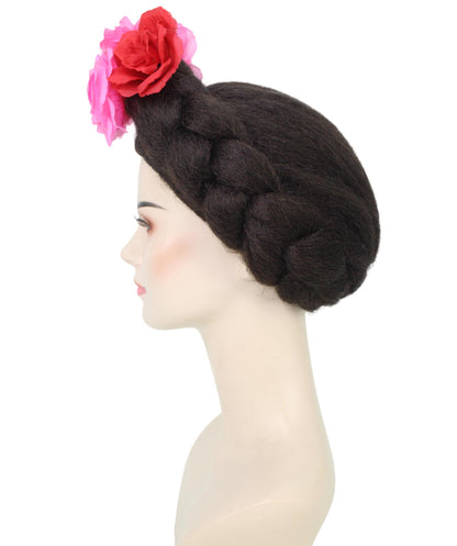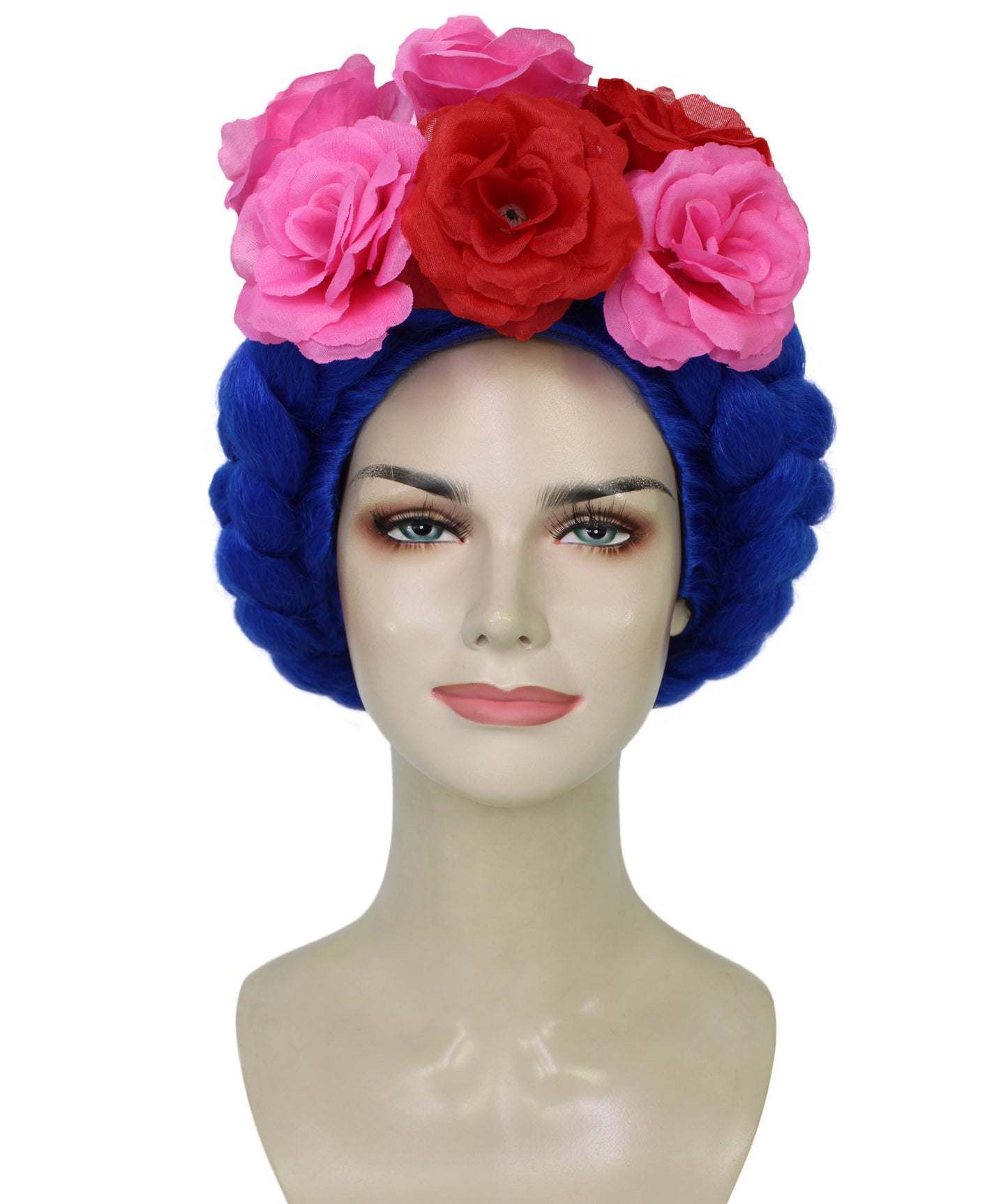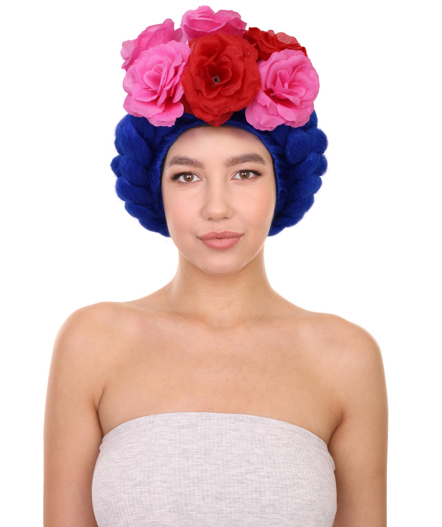 Celebrate Halloween mimicking the legendary Mexican artist Frida Kahlo with the Black Pink Floral Braided Wig - the perfect accessory for your Halloween or cosplay outfit!