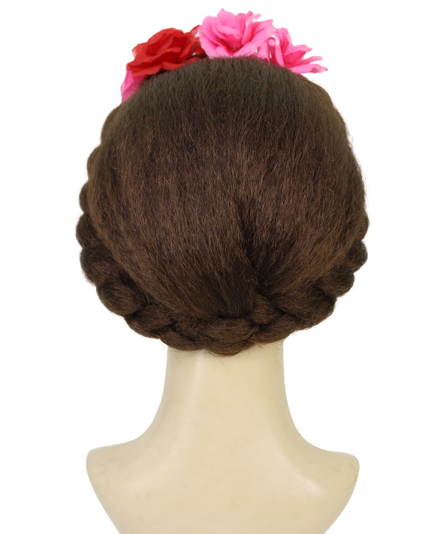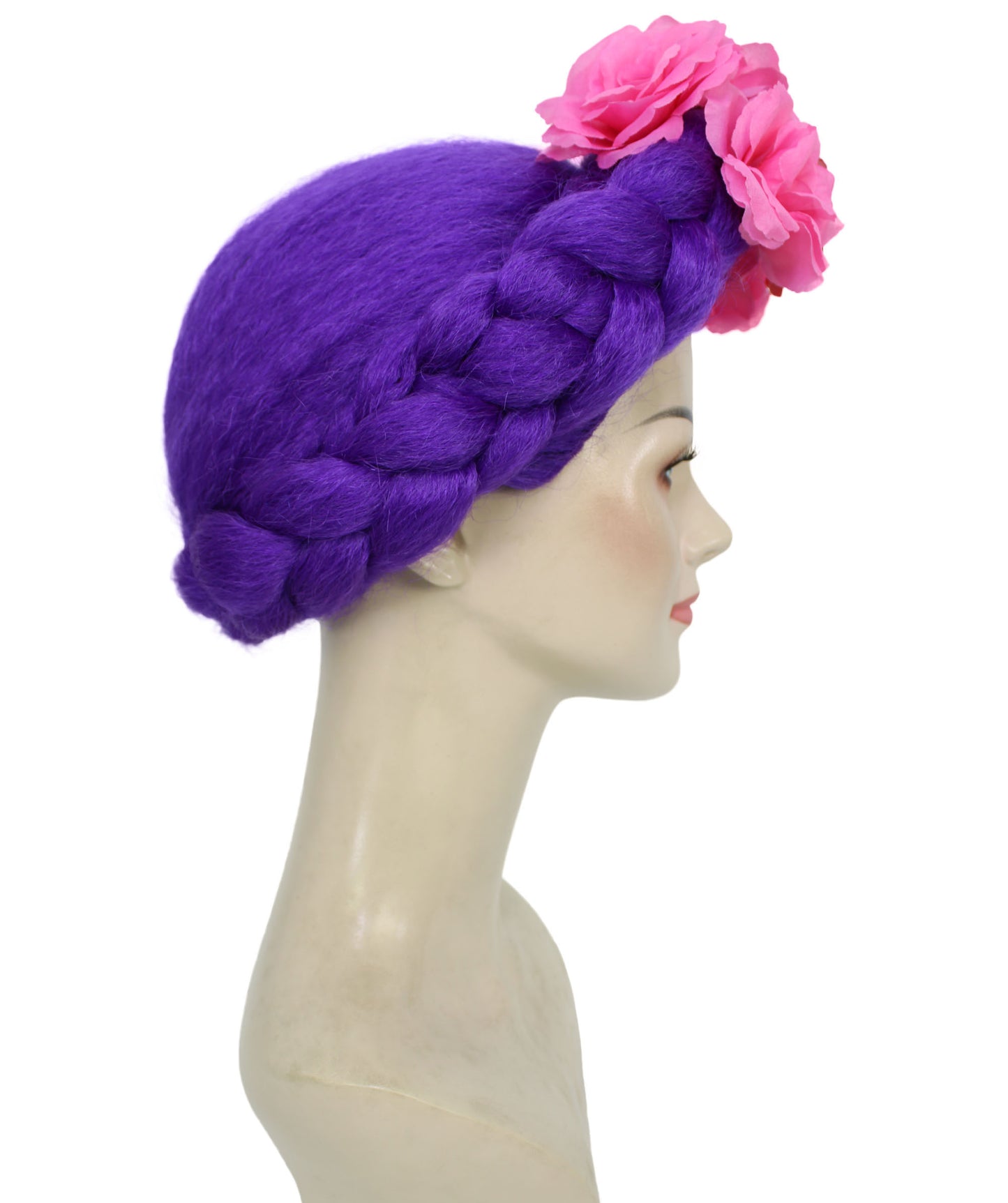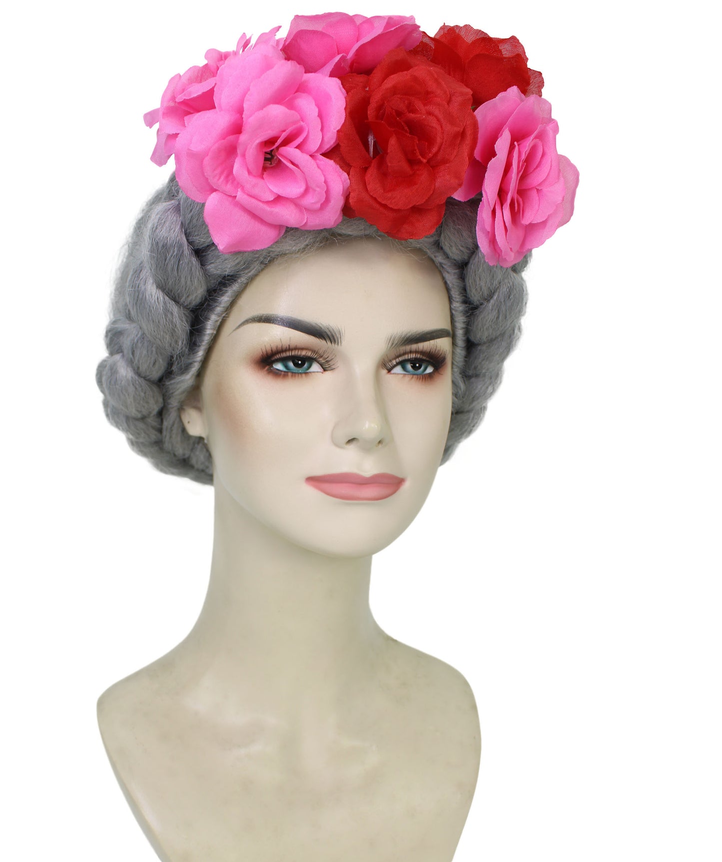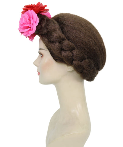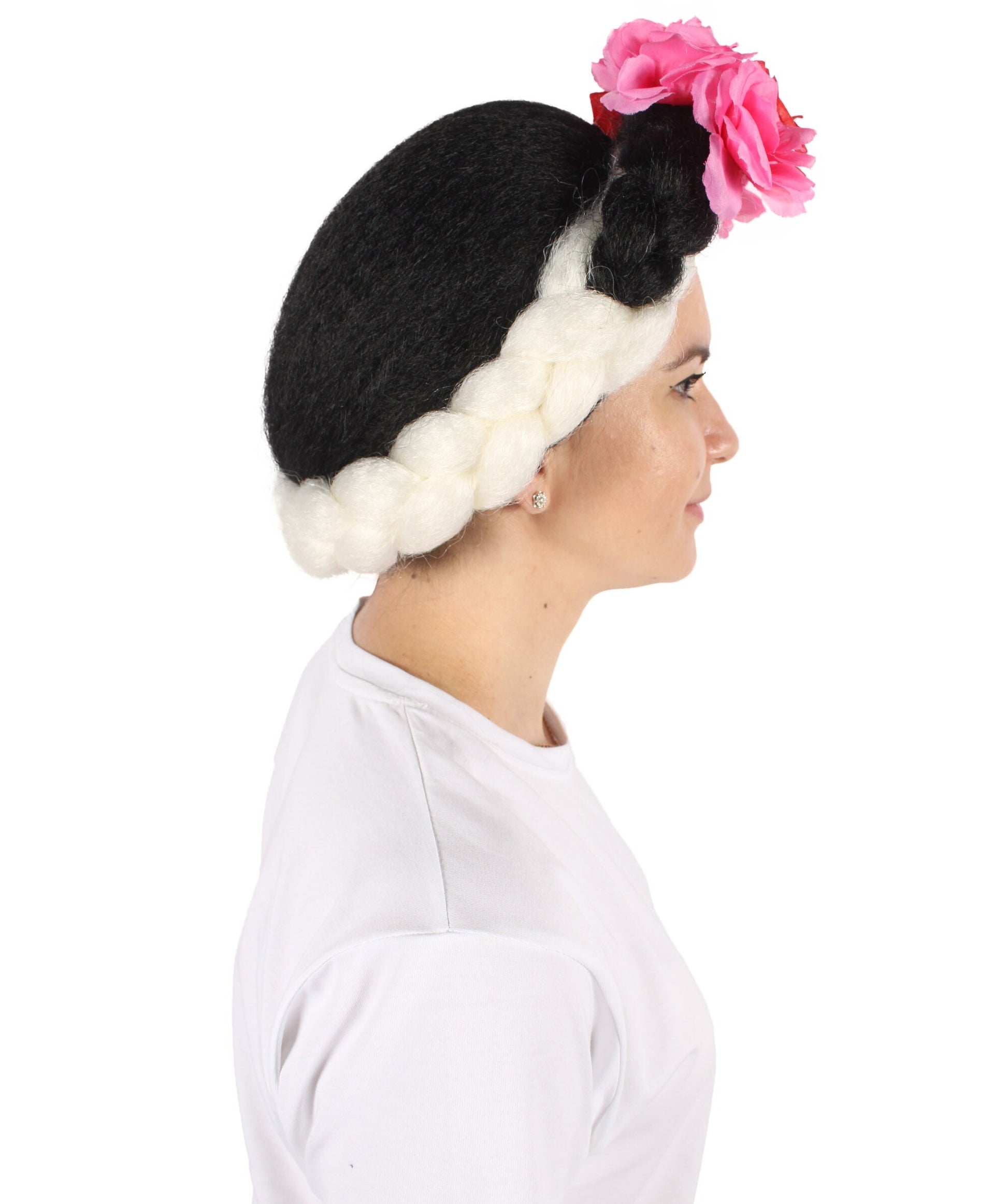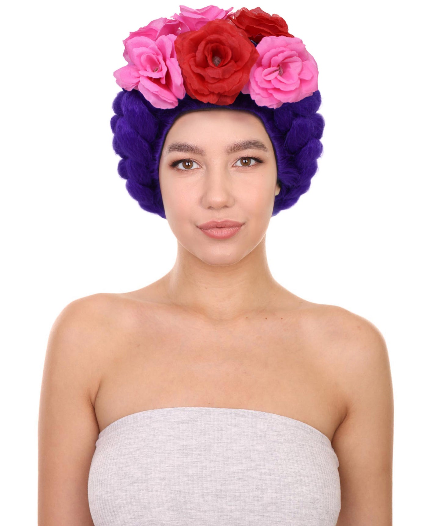 Celebrate Halloween mimicking the legendary Mexican artist Frida Kahlo with the Black Pink Floral Braided Wig - the perfect accessory for your Halloween or cosplay outfit!