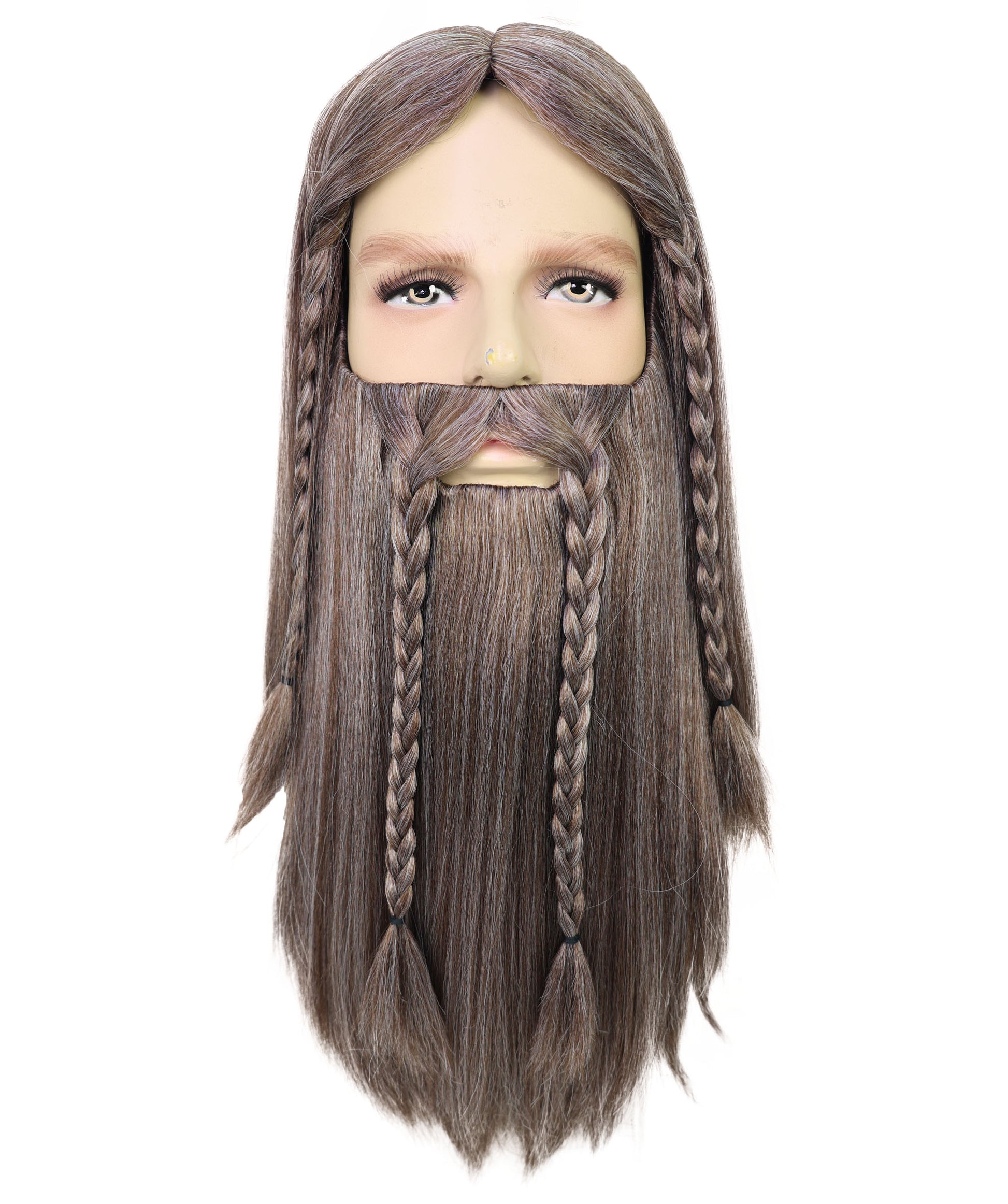 HPO Men’s Deluxe Long Wig & Beard Mustache Set | Ash Brown Braided Viking Style Costume Hair | Ideal for Halloween | Breathable Capless Cap