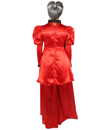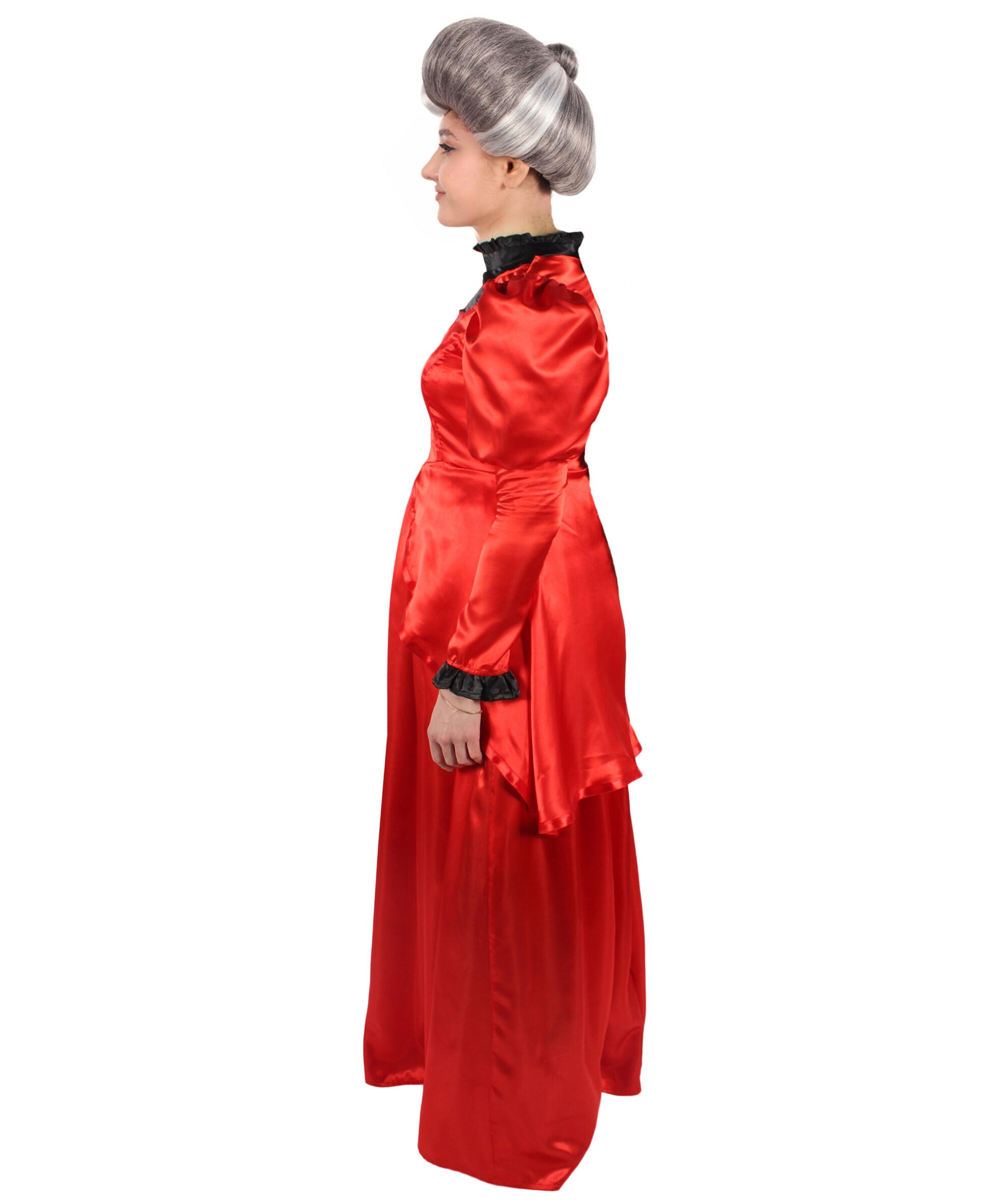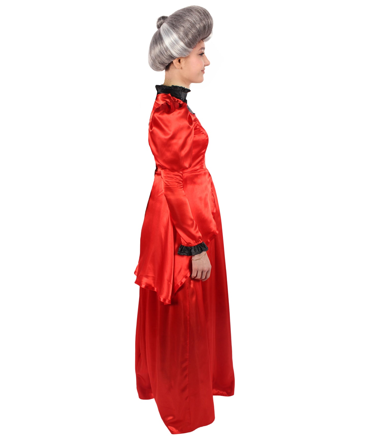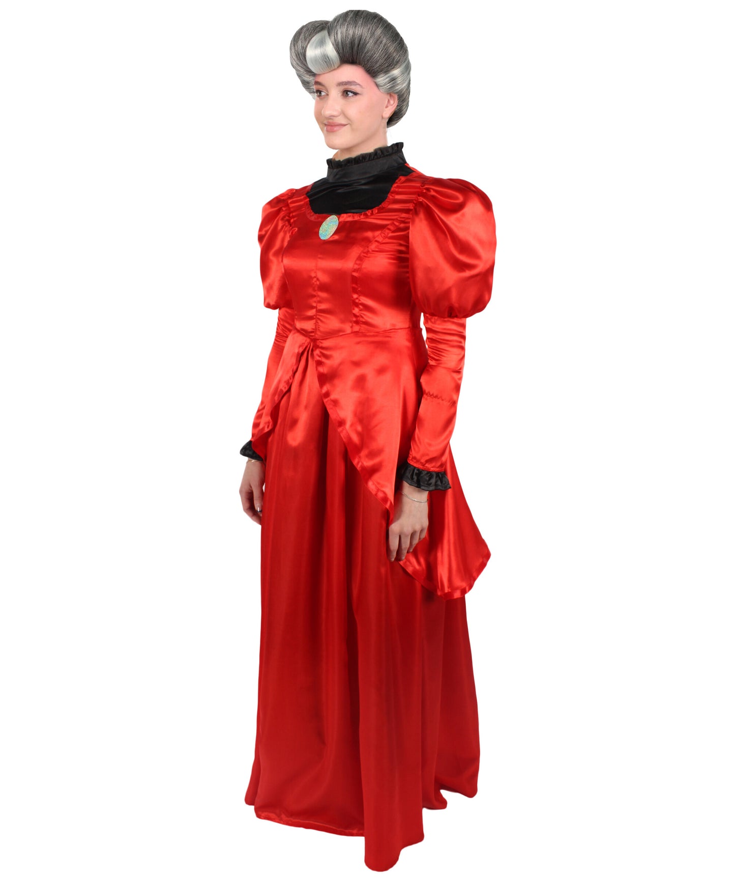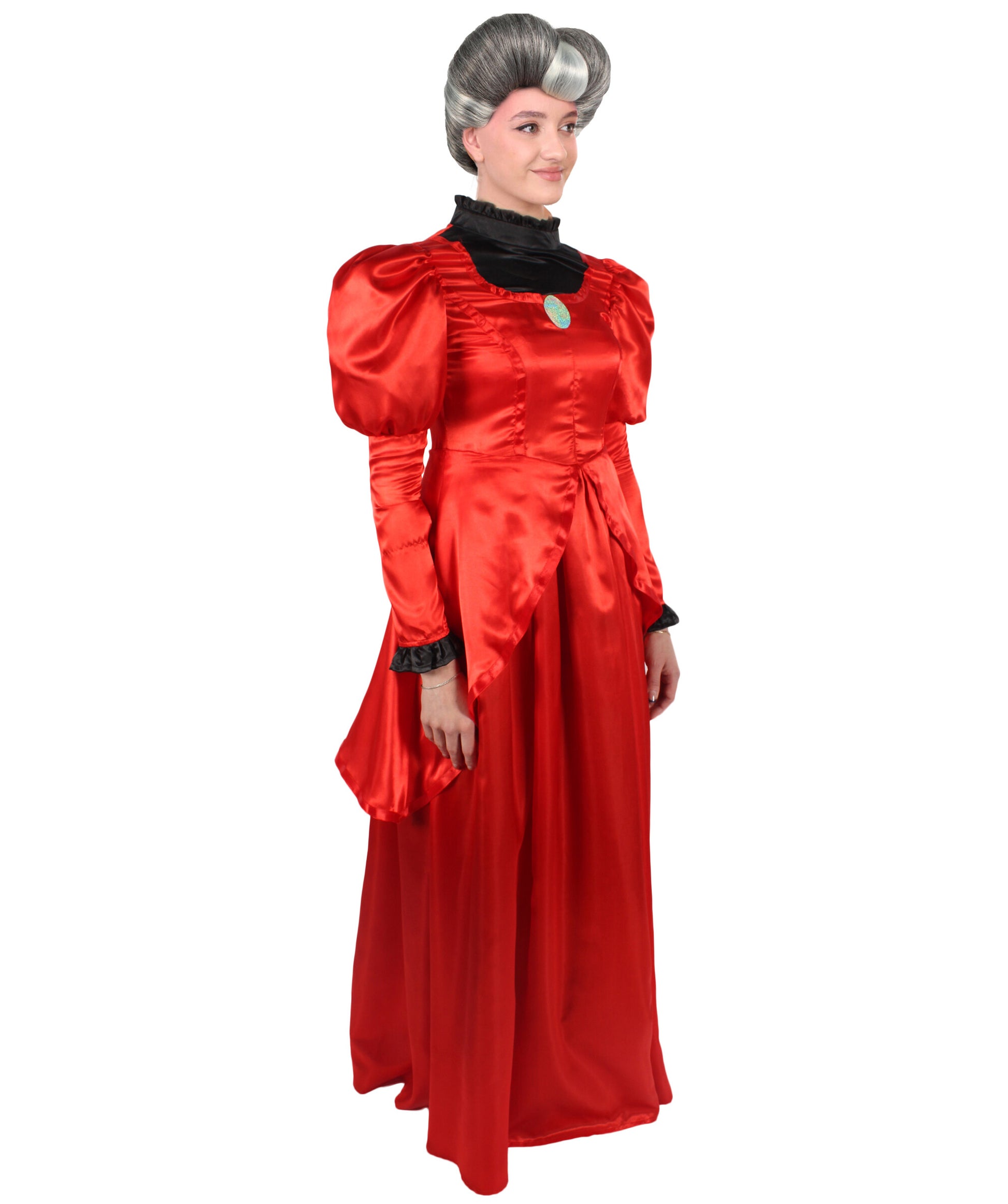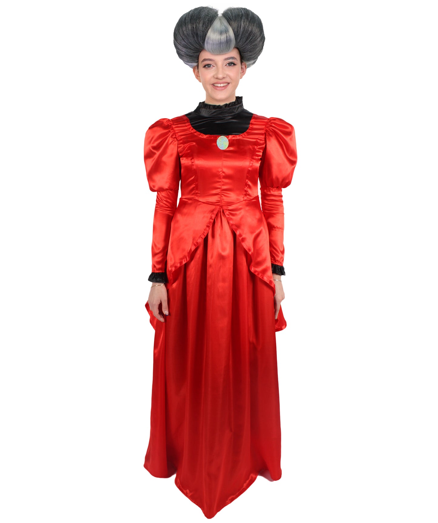 Transform into the iconic stepmother character with this Red Villain Costume set that comes with a grey color wig. This animated and flamboyant costume set is suitable for any Halloween and cosplay events. This costume set will bring back to life the antagonist from a beloved book story and also from its animated and live-action adaptations. Can you guess the character? Yes! The character is none other than the evil stepmother, a classic Princess story’s main antagonist.