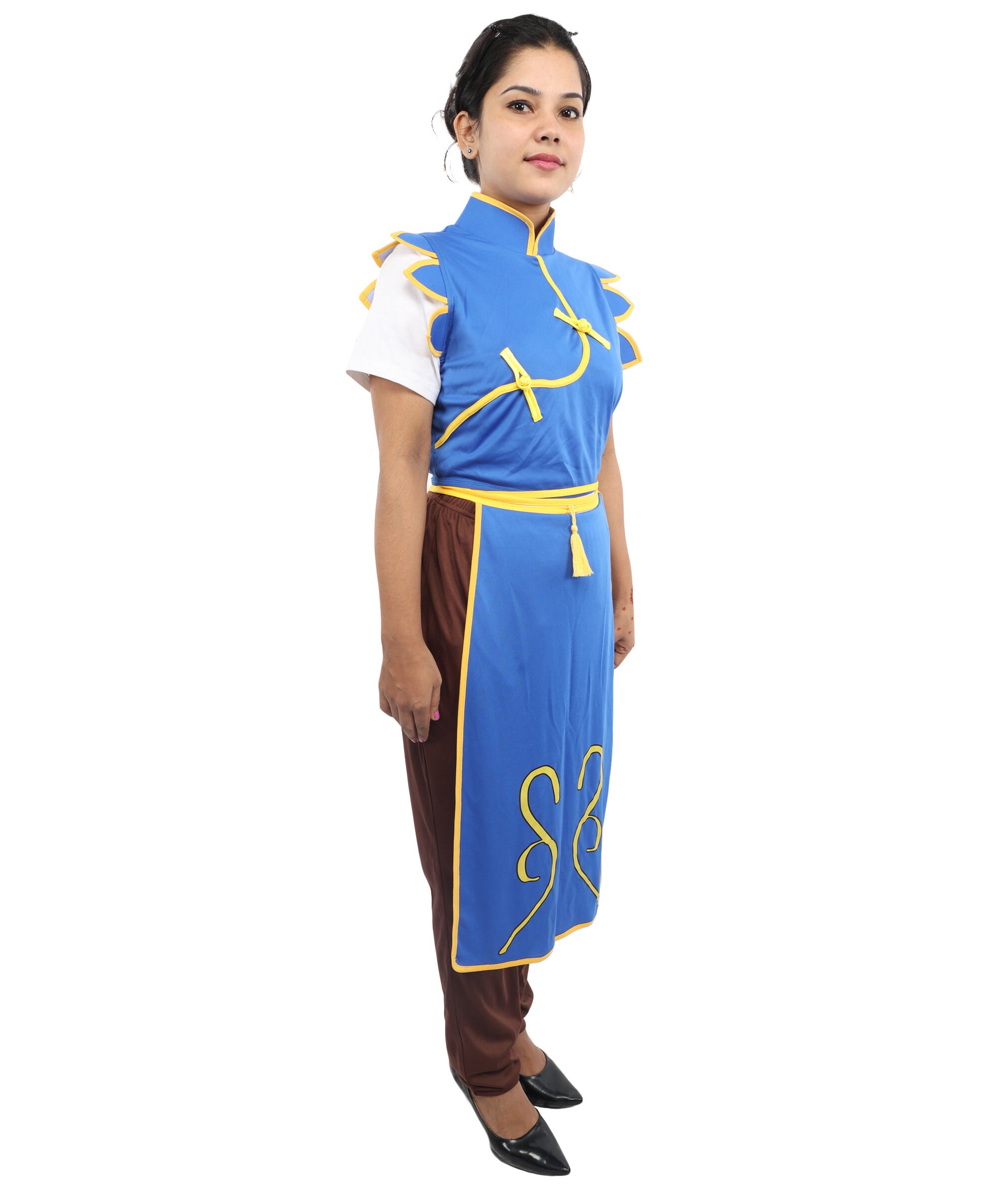 Step into the look of a bold fighter with this Women’s Fighter Cosplay Blue and Brwon Dress Costume. If you like characters who feel strong and energetic, this outfit gets the idea across without copying any specific one. The blue color really pops in person—brighter than you’d expect—but the dress still feels easy to move around in. The top fits close to the body, and the skirt has a layered swing that sorta follows you around when you walk, which is nice for photos or just wandering a con floor.