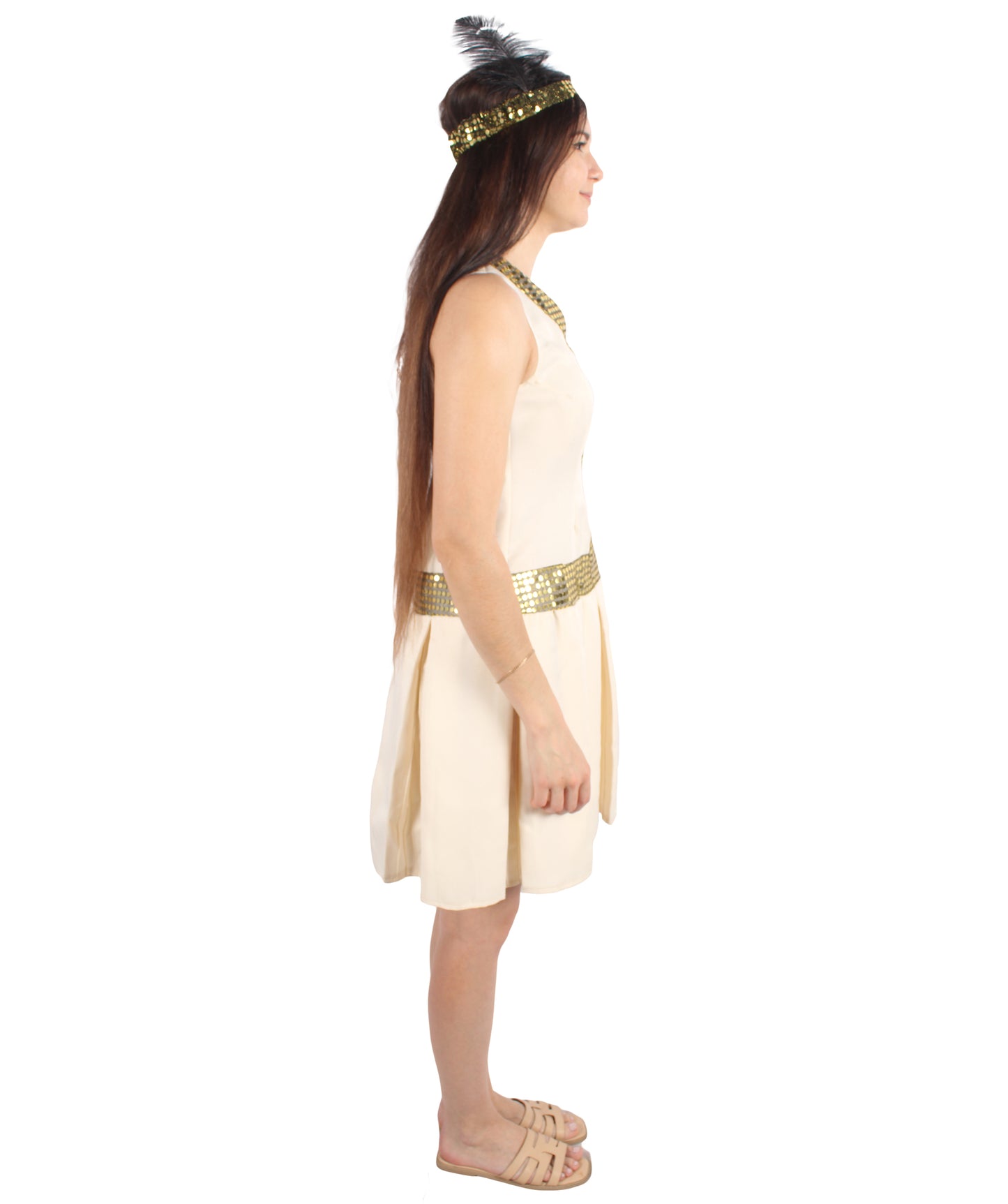 Our Short Dress Costume has a drop waist and black sequin trim at the V neckline center front and a drop waist sequin trim headpiece with a broach. Also, the feather skirt has pleated godet insets in this Short Dress Costume.