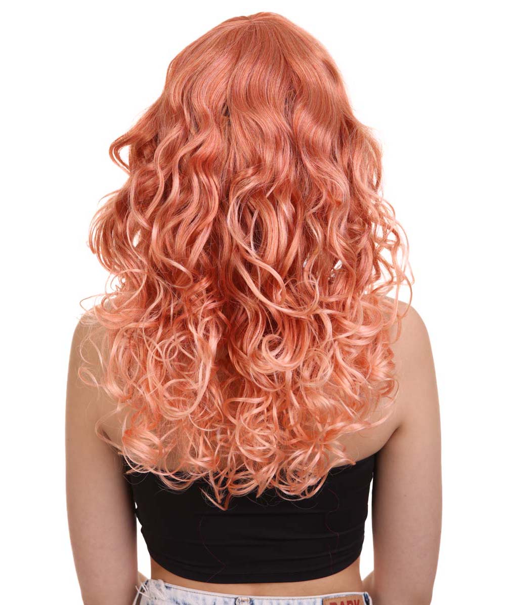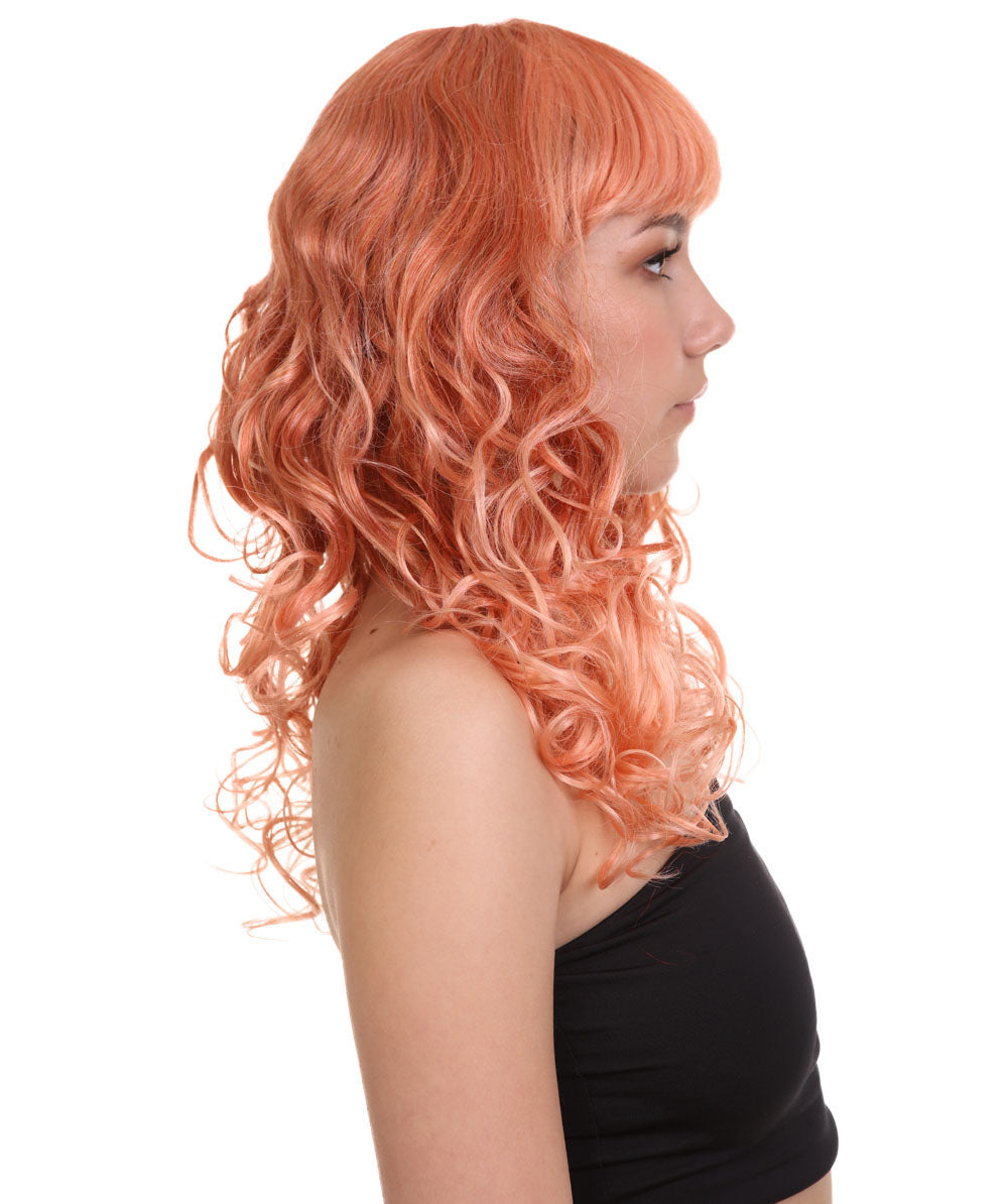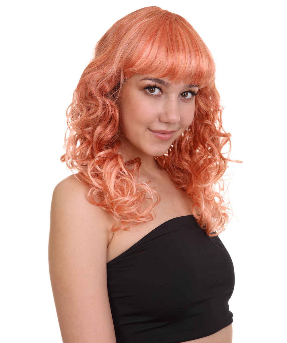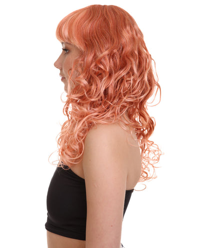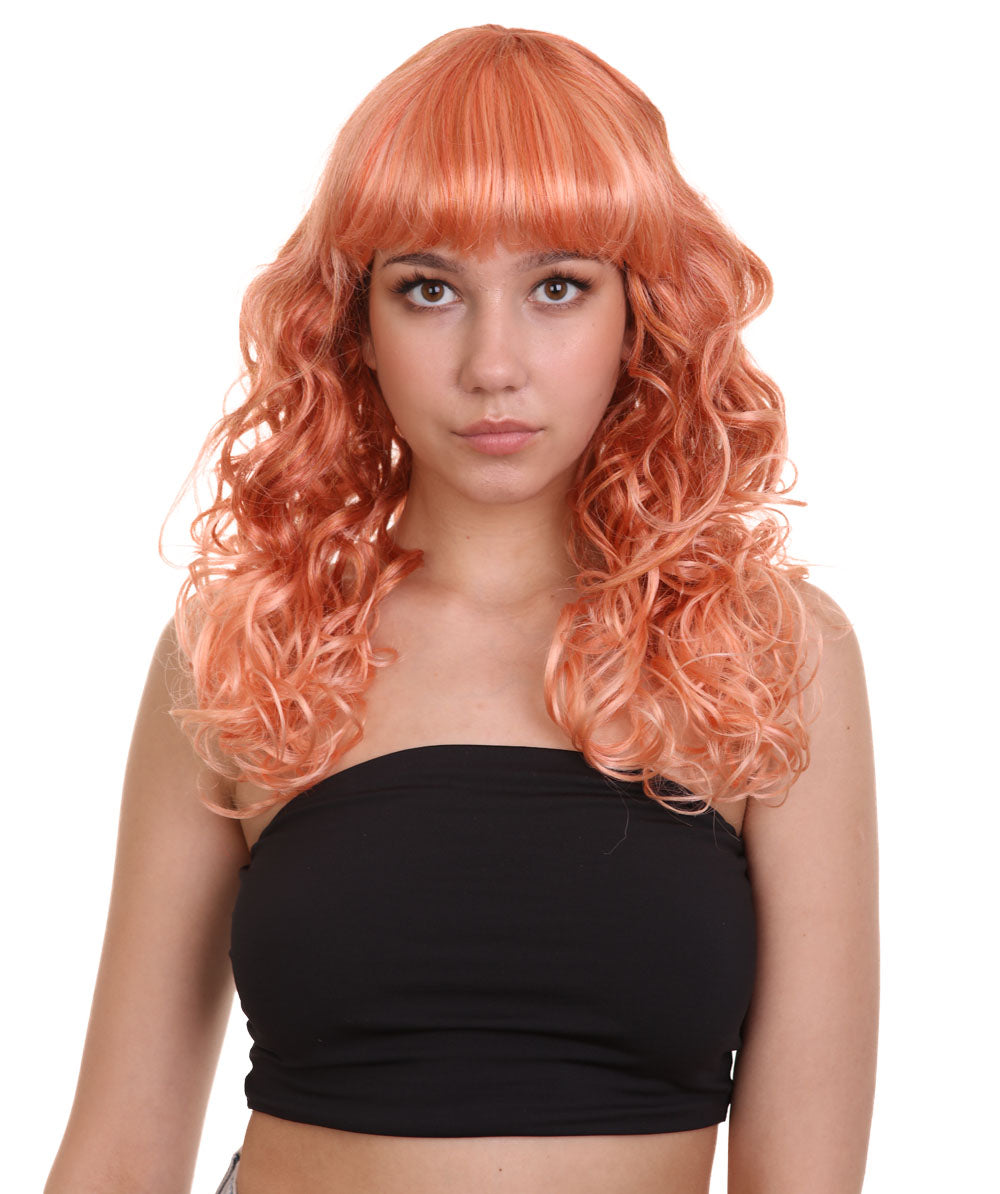 Bring your dress up look to the next level at any Halloween or glamour party event by wearing our cute colored Peach Long Curly Wig! Made with soft synthetic material, this stunning wig features luscious, cascading curls that give away elegance and charm. The front bangs add a touch of versatility, allowing for effortless styling suit any character or persona.