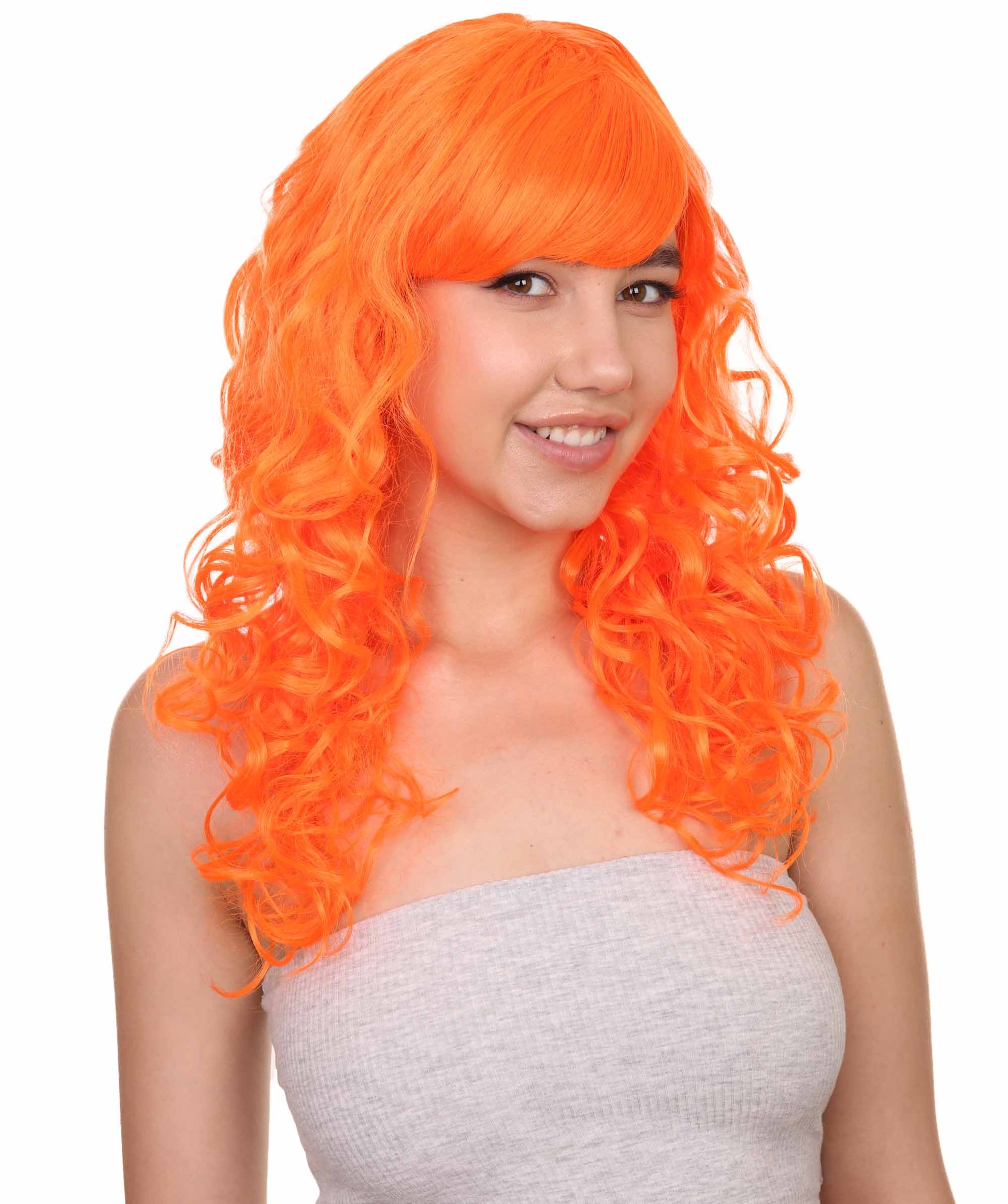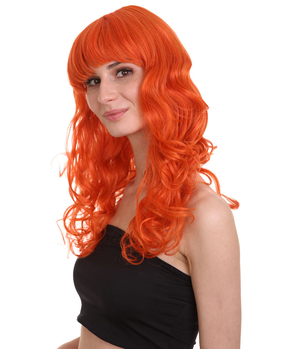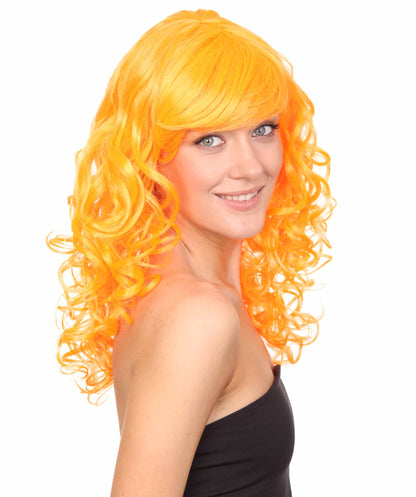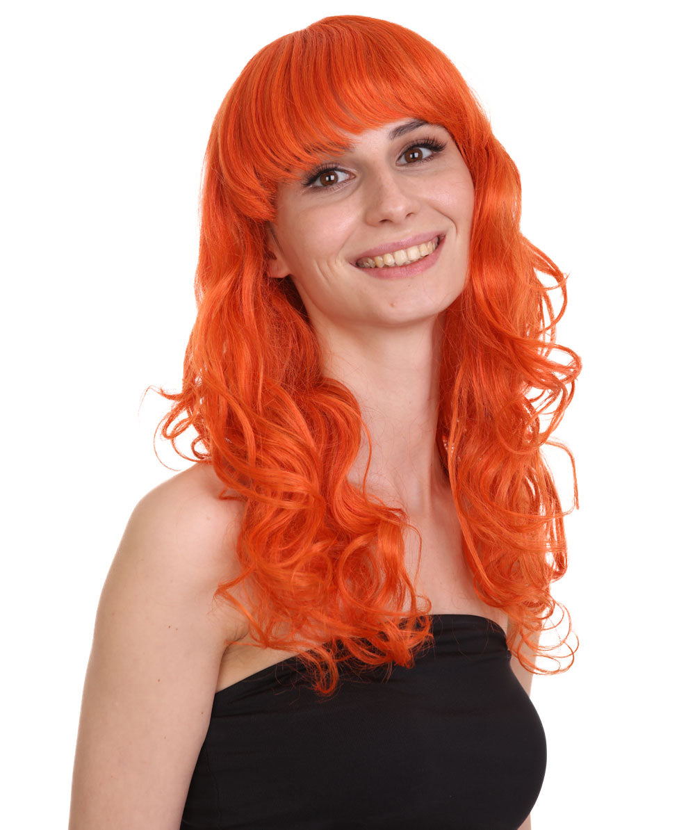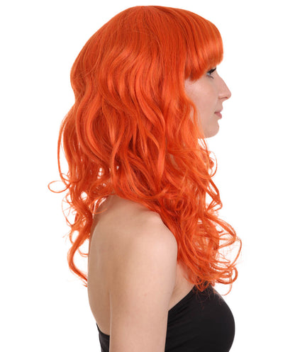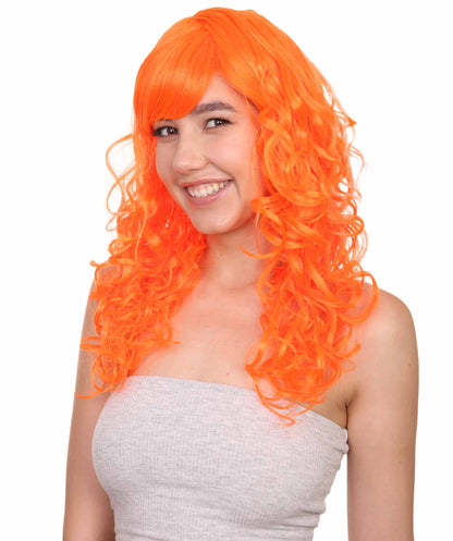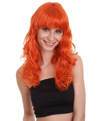 Bring your dress up look to the next level at any Halloween or glamour party event by wearing our cute colored Peach Long Curly Wig! Made with soft synthetic material, this stunning wig features luscious, cascading curls that give away elegance and charm. The front bangs add a touch of versatility, allowing for effortless styling suit any character or persona.
