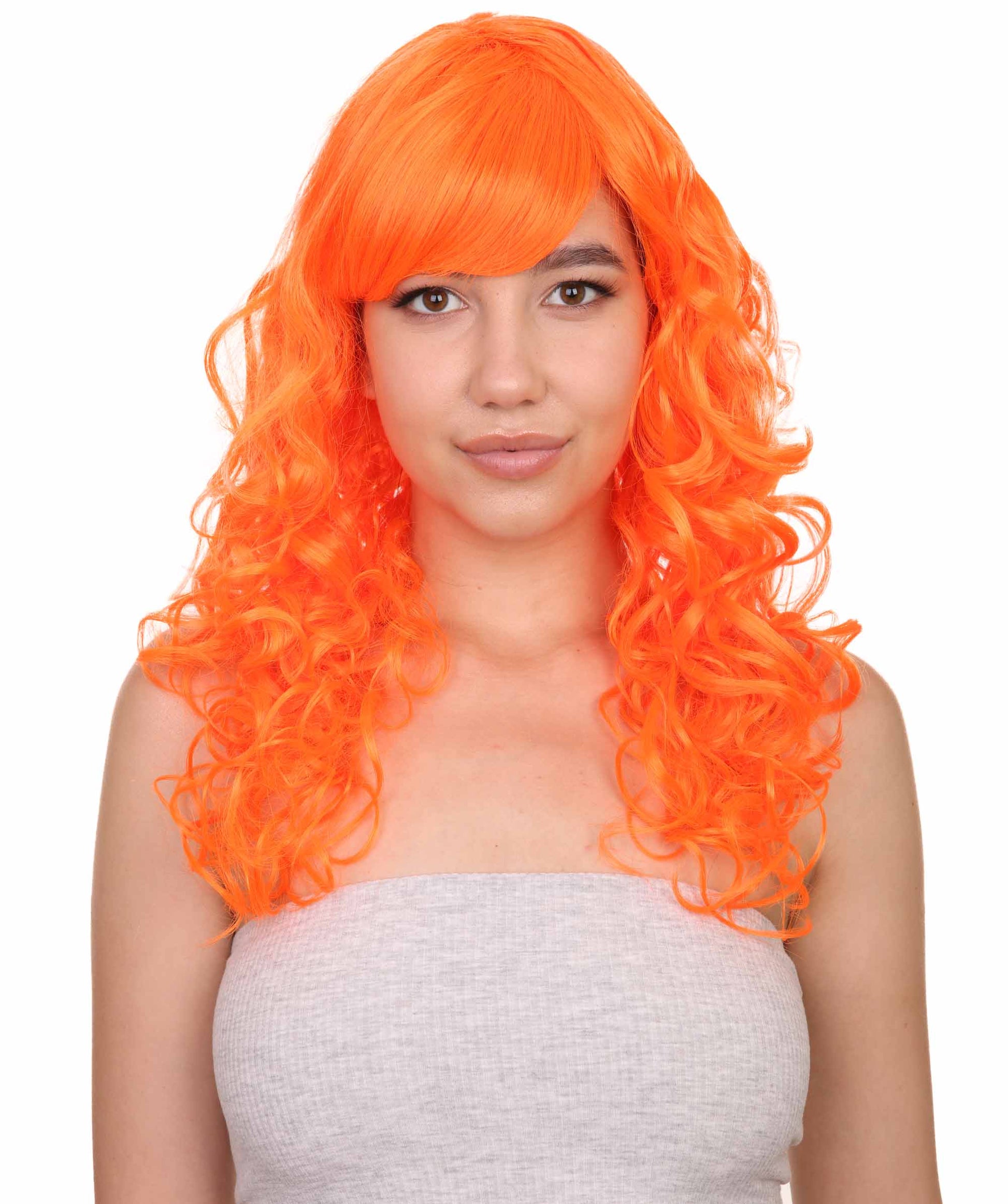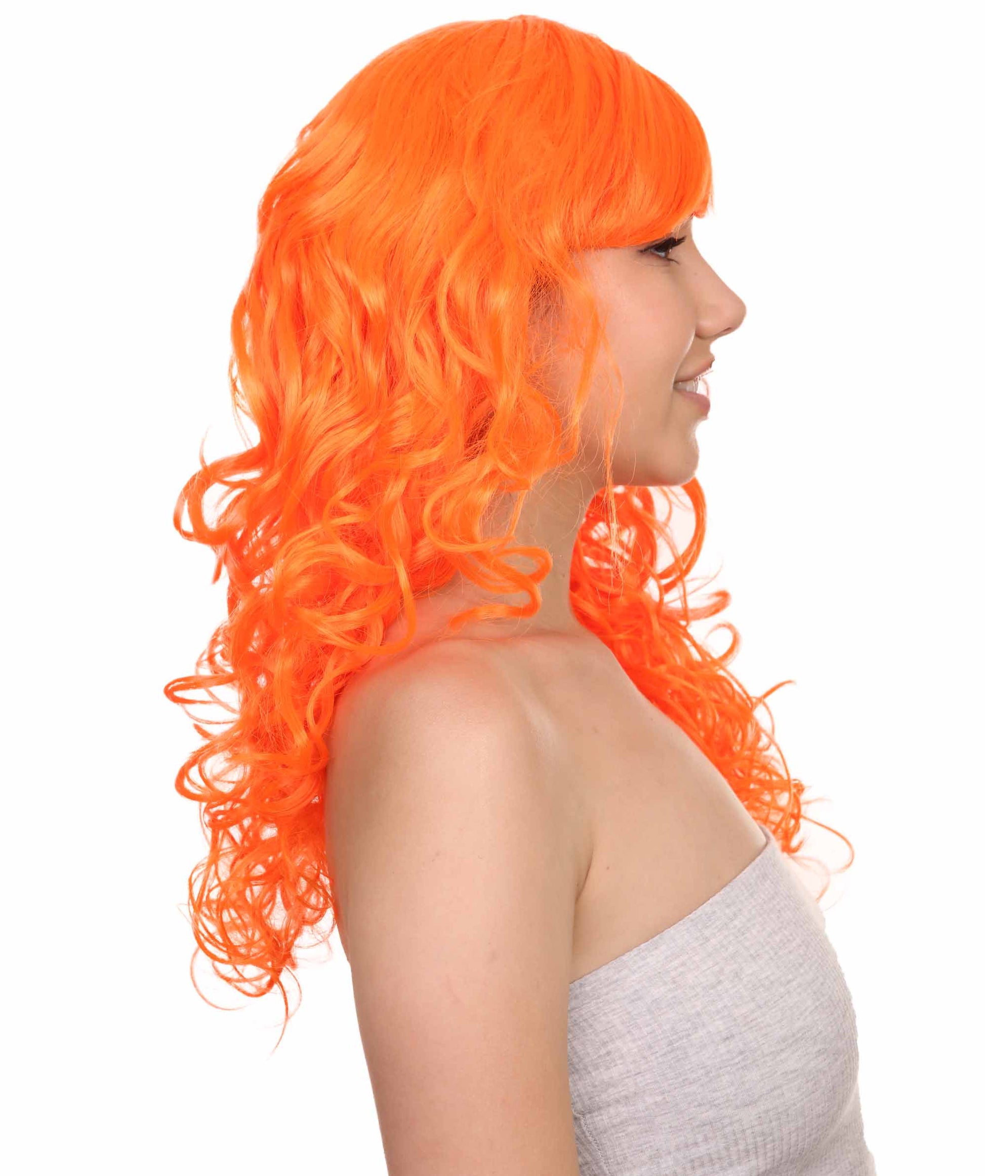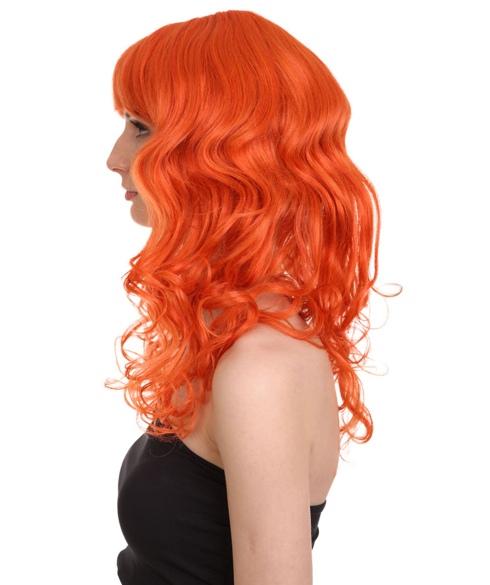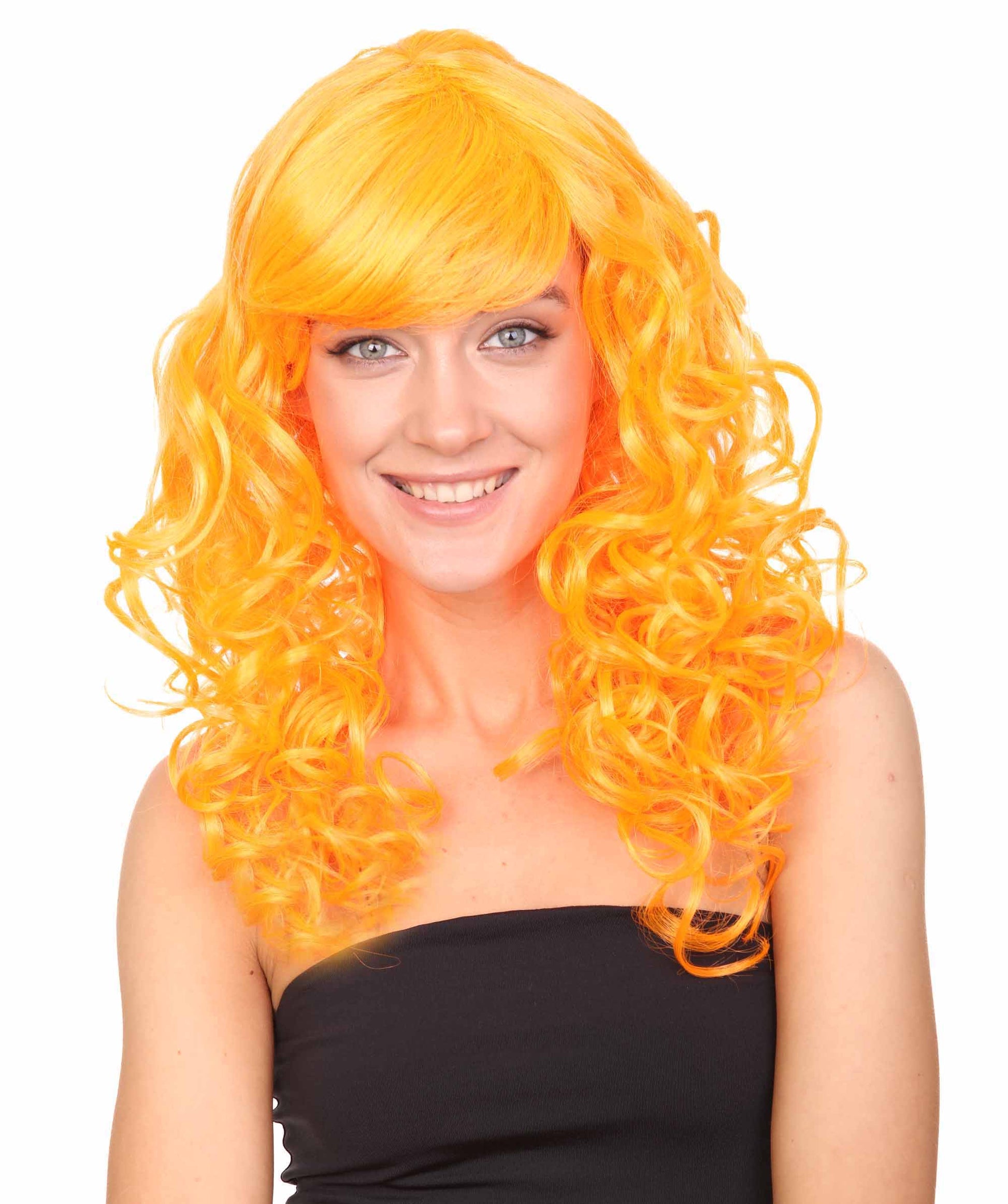 Bring your dress up look to the next level at any Halloween or glamour party event by wearing our cute colored Peach Long Curly Wig! Made with soft synthetic material, this stunning wig features luscious, cascading curls that give away elegance and charm. The front bangs add a touch of versatility, allowing for effortless styling suit any character or persona.