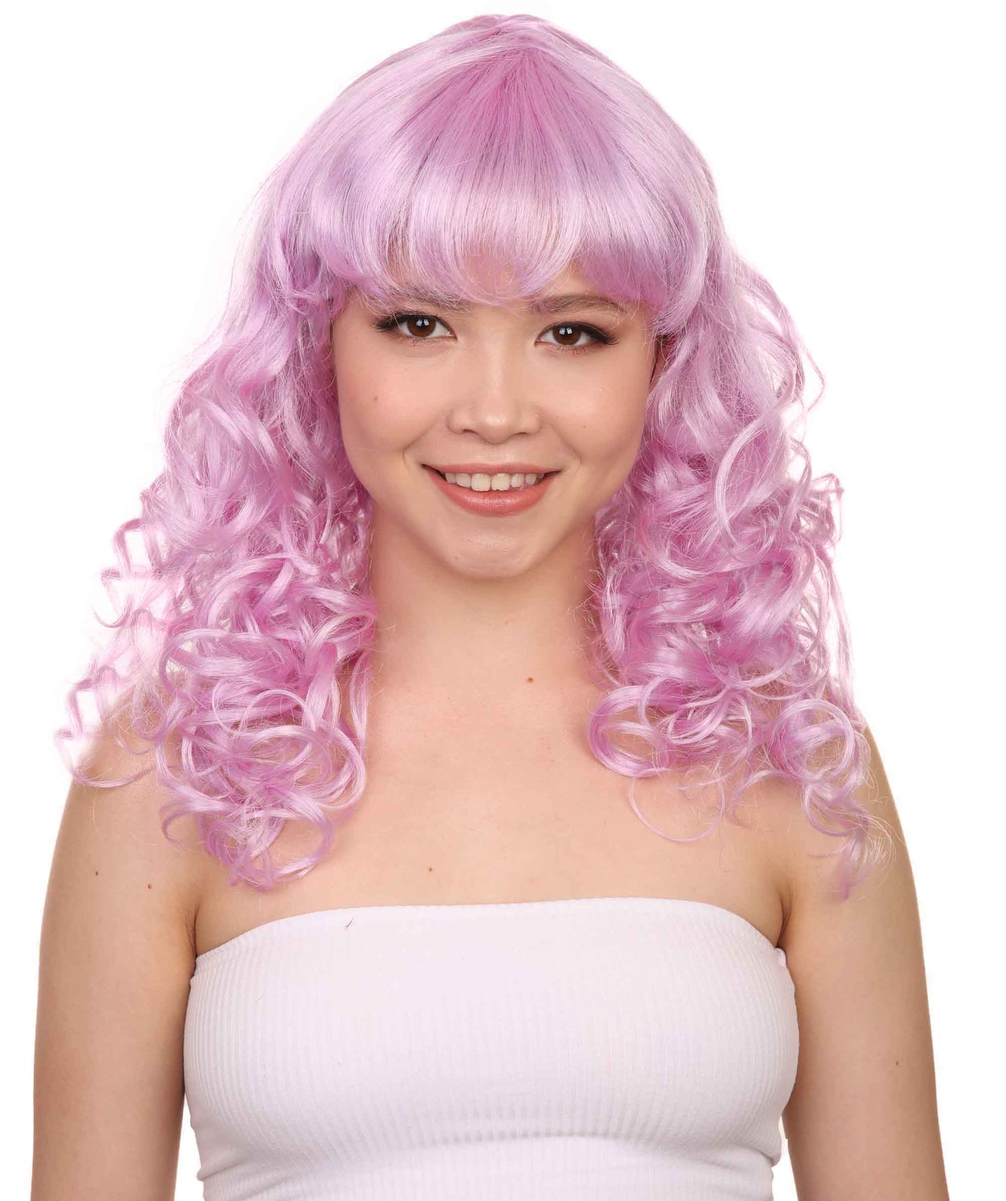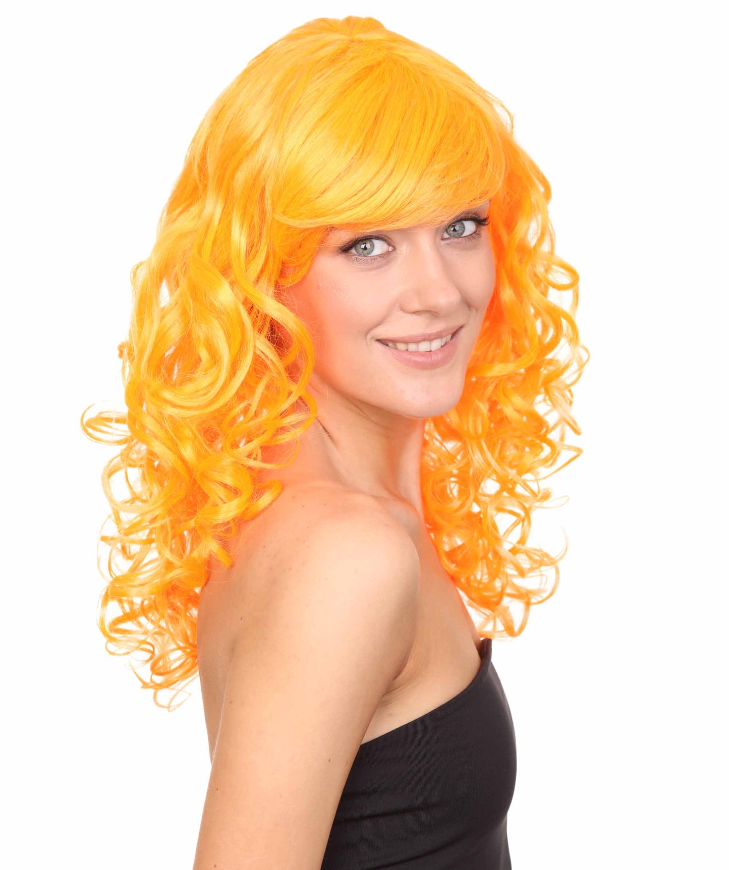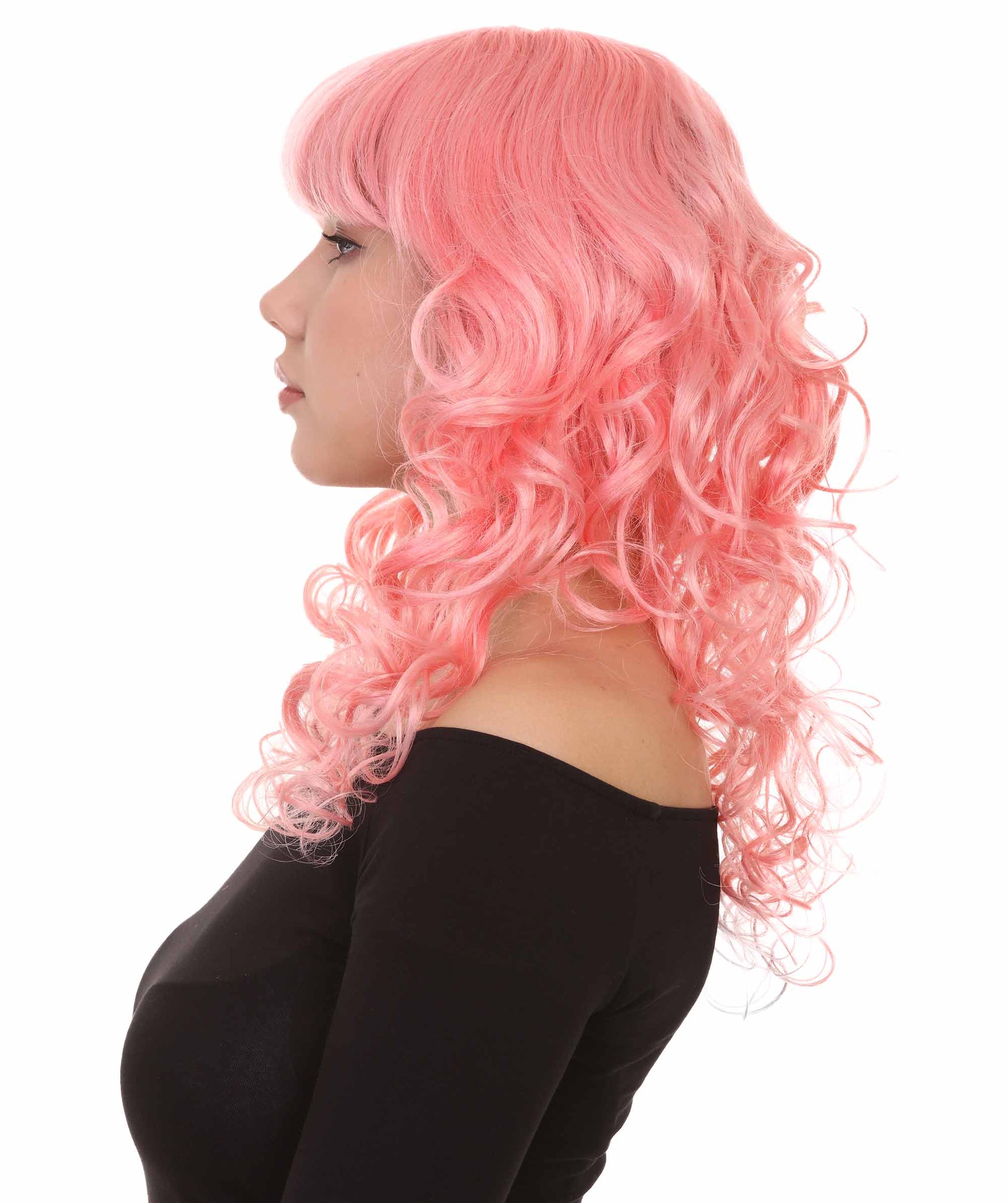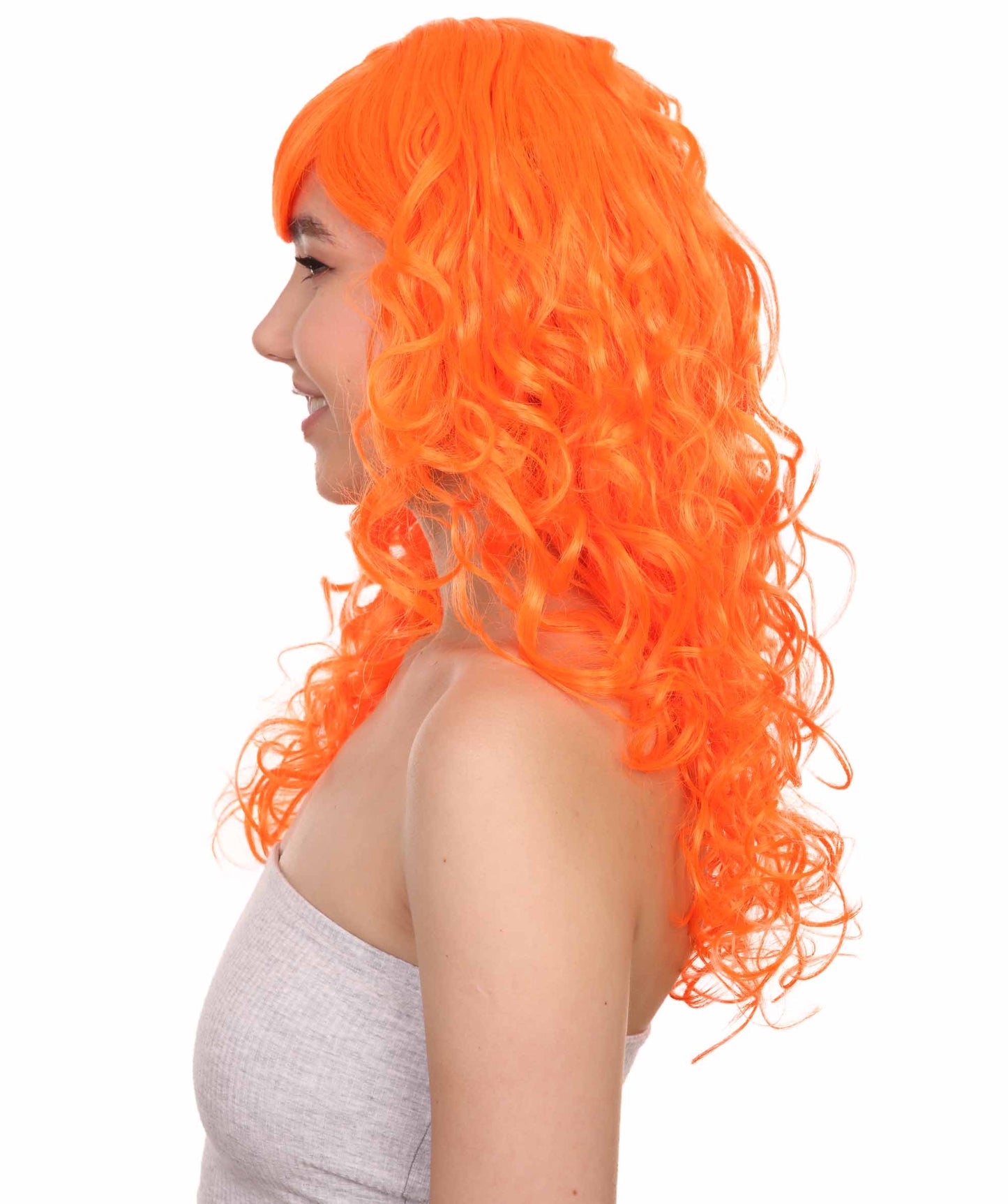 Bring your dress up look to the next level at any Halloween or glamour party event by wearing our cute colored Peach Long Curly Wig! Made with soft synthetic material, this stunning wig features luscious, cascading curls that give away elegance and charm. The front bangs add a touch of versatility, allowing for effortless styling suit any character or persona.