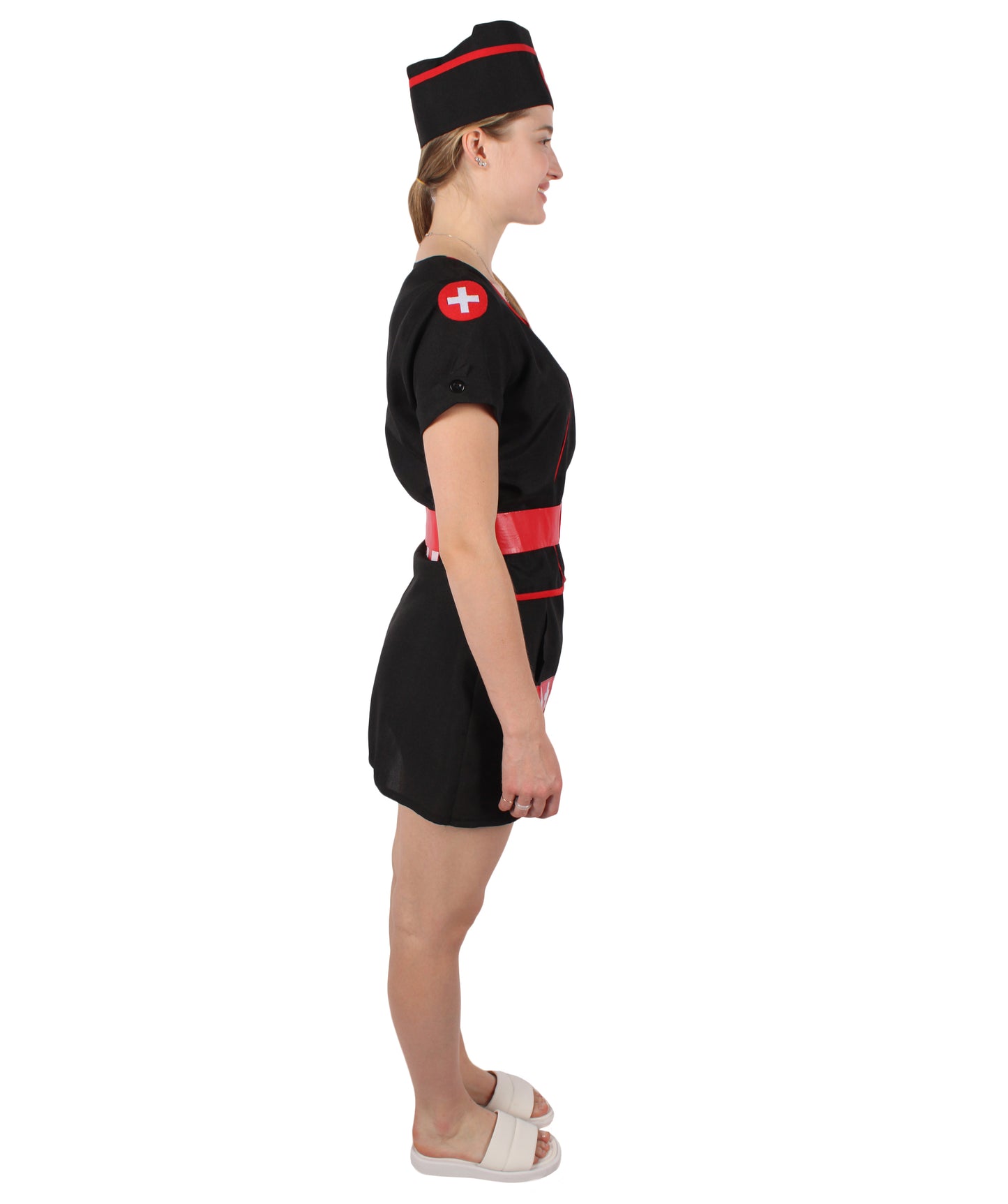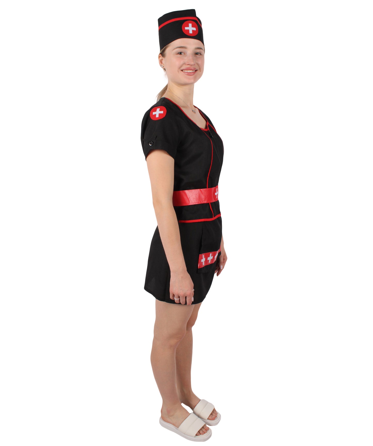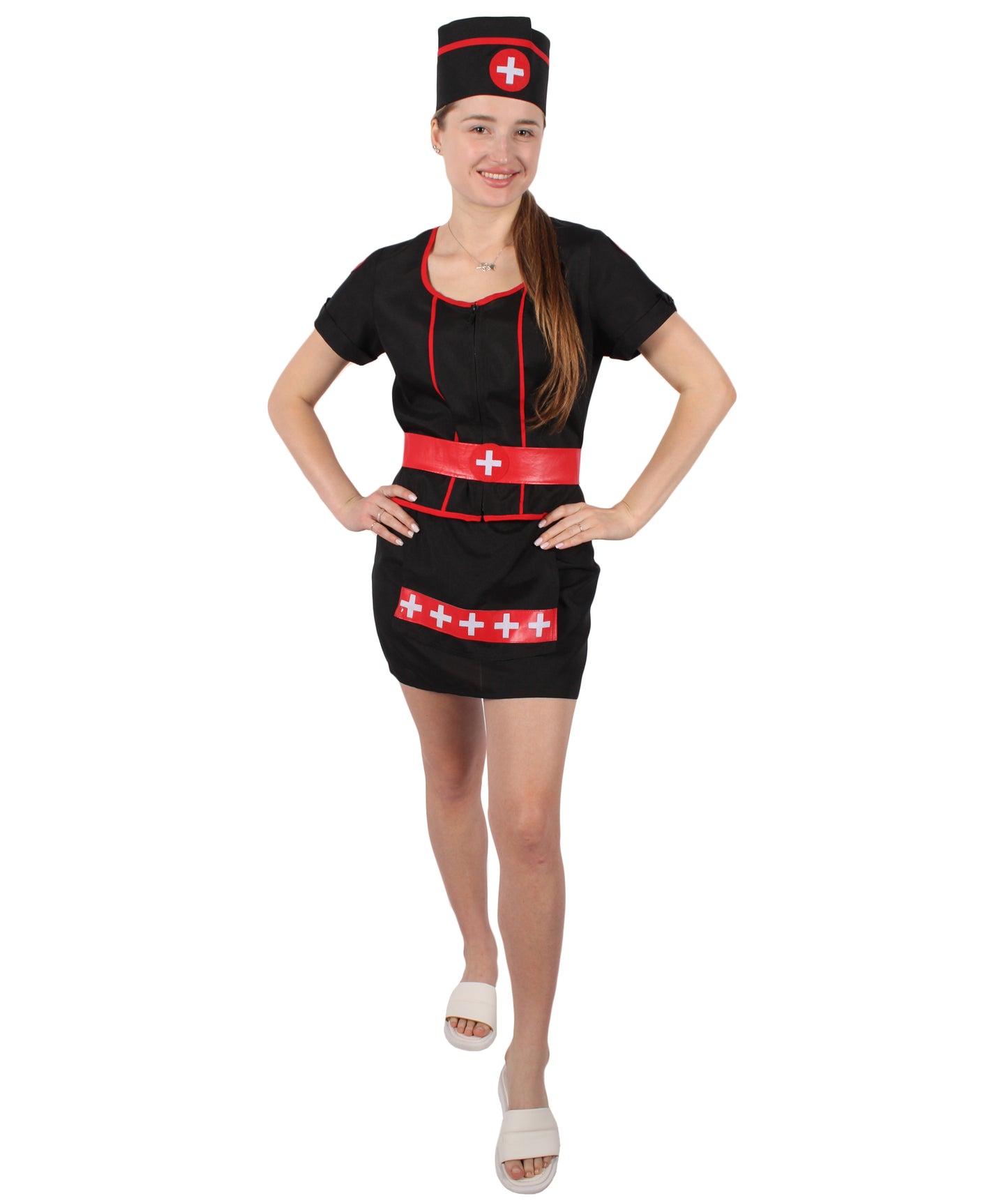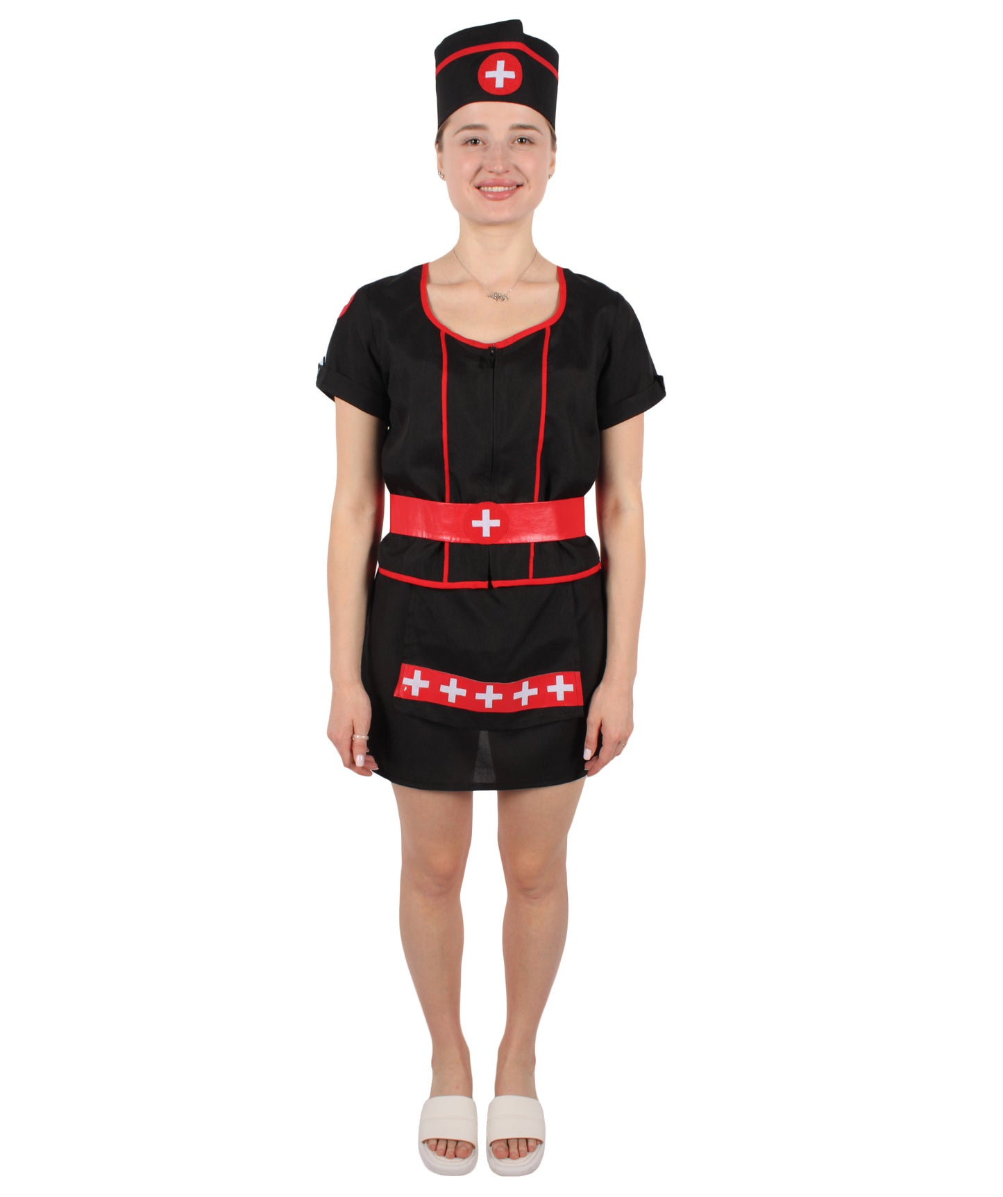 Our Beautiful Nurse Costume is a combination of a black mini dress with a zip at the front. Nurse Costume’s top and neckline are finished with red edging, short sleeves with cuffs, and a white cross printed in red circle