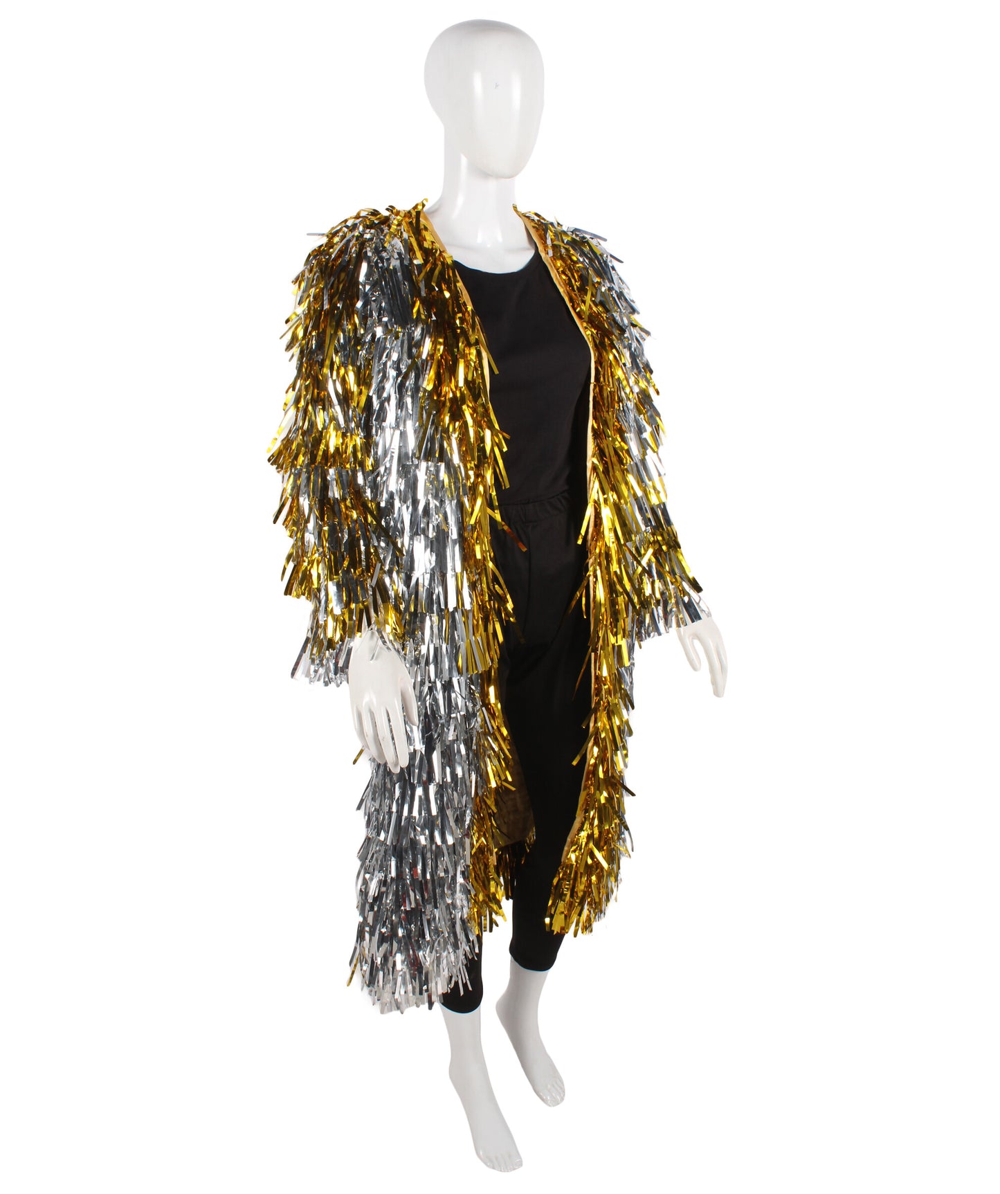 - "Feel like a pop superstar in our Adult Women’s Gold & Glitter Tinsel Trench coat! This fantastic jacket isn’t just any coat—it’s a shiny tribute to famous pop culture fashion. It’s made without harming animals, is safe to wear, and is made from unique fire-resistant material. Perfect for fun Halloween parties or cool costume events!